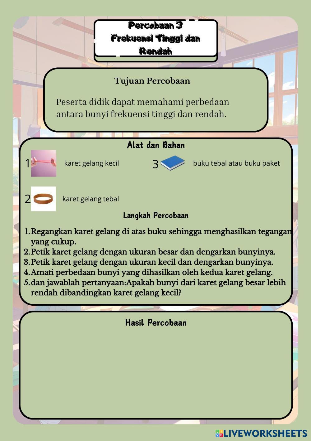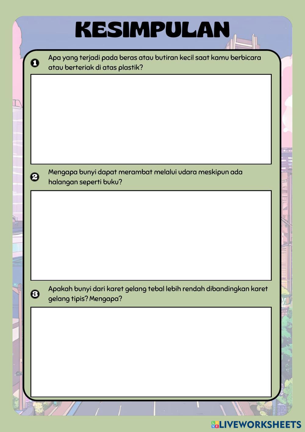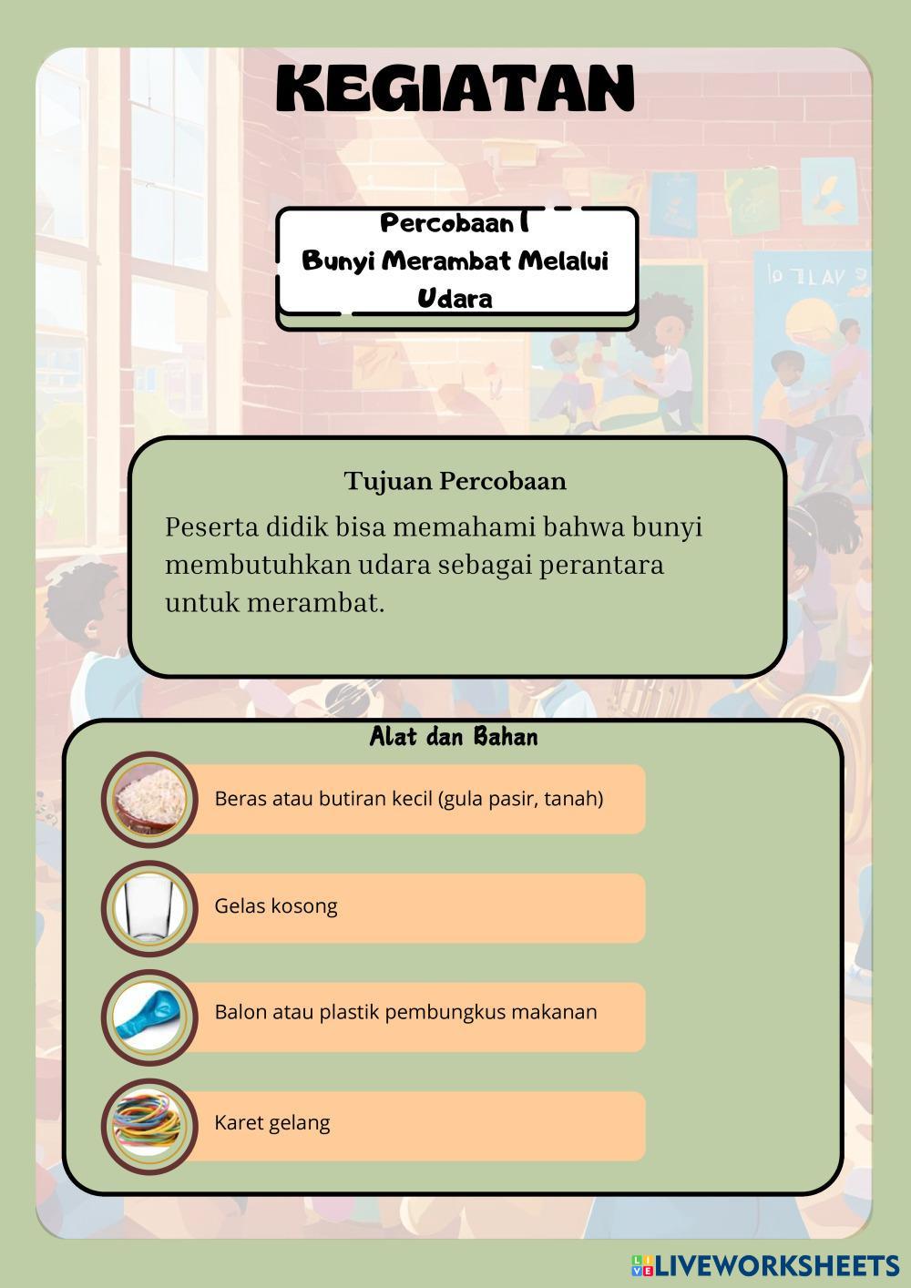 Created byDara Maulidya Ilmu Pengetahuan Alam (IPA) Bunyi dan sifatnya Age 9-13 level: 5 Indonesian Author's Instructions Peserta didik bisa memahami bahwa bunyi membutuhkan udara sebagai perantara untuk merambat. My Google Classroom Courses × 0 classes selected (0 students total) Quick Access Select all classes (0 classes) All Classes Loading courses... Cancel Share Share to selected Course __COURSE_NAME__ __STUDENT_NAME__ (__STUDENT_EMAIL__) LKPD Bunyi Kelas 5 Fase c Download Worksheet Validation Check my answers Emails my answers to my teacher Full name Group/level School subject Teacher's email or key code Close Submit Validating worksheet... (12) Your answers have been sent to your teacher. Good luck! OK We encountered an error submitting your answers. Please try again. OK Advertisement | Go Ad Free Created byDara Maulidya Ilmu Pengetahuan Alam (IPA) Bunyi dan sifatnya Age 9-13 level: 5 Indonesian Author's Instructions Peserta didik bisa memahami bahwa bunyi membutuhkan udara sebagai perantara untuk merambat.