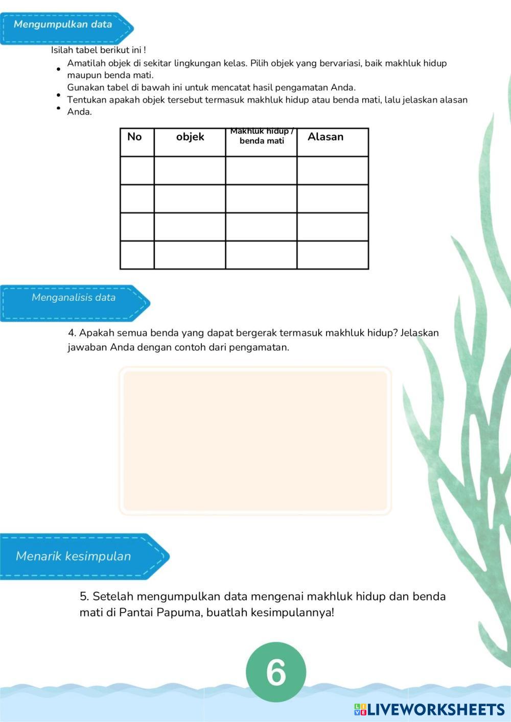 Created byifa22 Ilmu Pengetahuan Alam (IPA) Klasifikasi Makhluk Hidup Age 12-16 level: 7 Indonesian Author's Instructions - My Google Classroom Courses × 0 classes selected (0 students total) Quick Access Select all classes (0 classes) All Classes Loading courses... Cancel Share Share to selected Course __COURSE_NAME__ __STUDENT_NAME__ (__STUDENT_EMAIL__) E-LKPD 1 KLASIFIKASI MAKHLUK HIDUP Download Worksheet Validation Check my answers Emails my answers to my teacher Full name Group/level School subject Teacher's email or key code Close Submit Validating worksheet... (12) Your answers have been sent to your teacher. Good luck! OK We encountered an error submitting your answers. Please try again. OK Advertisement | Go Ad Free Created byifa22 Ilmu Pengetahuan Alam (IPA) Klasifikasi Makhluk Hidup Age 12-16 level: 7 Indonesian Author's Instructions -