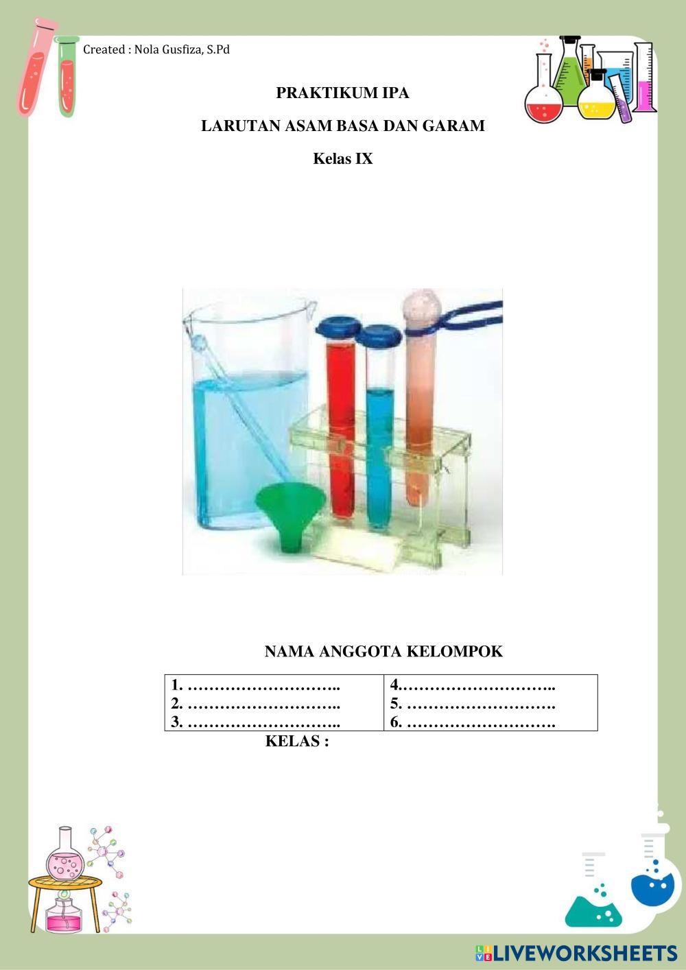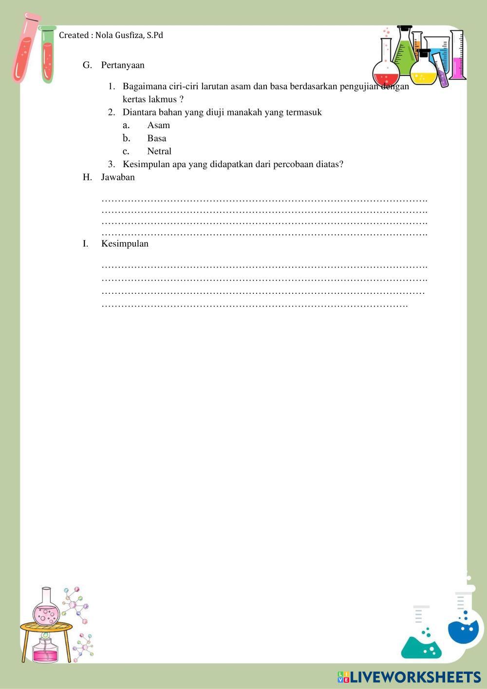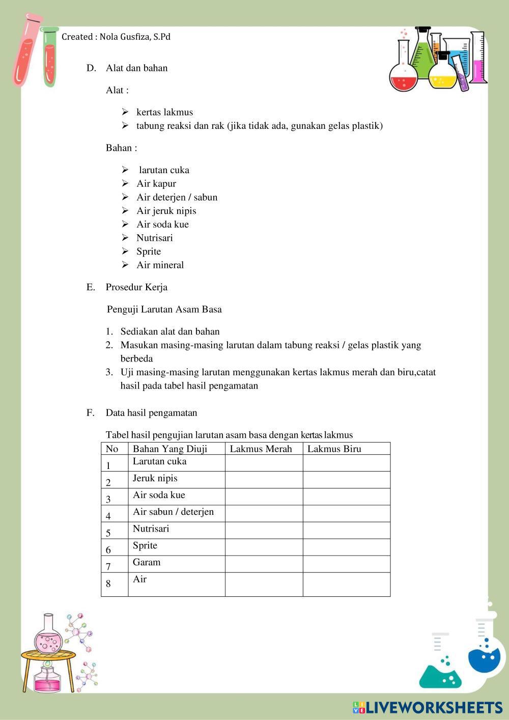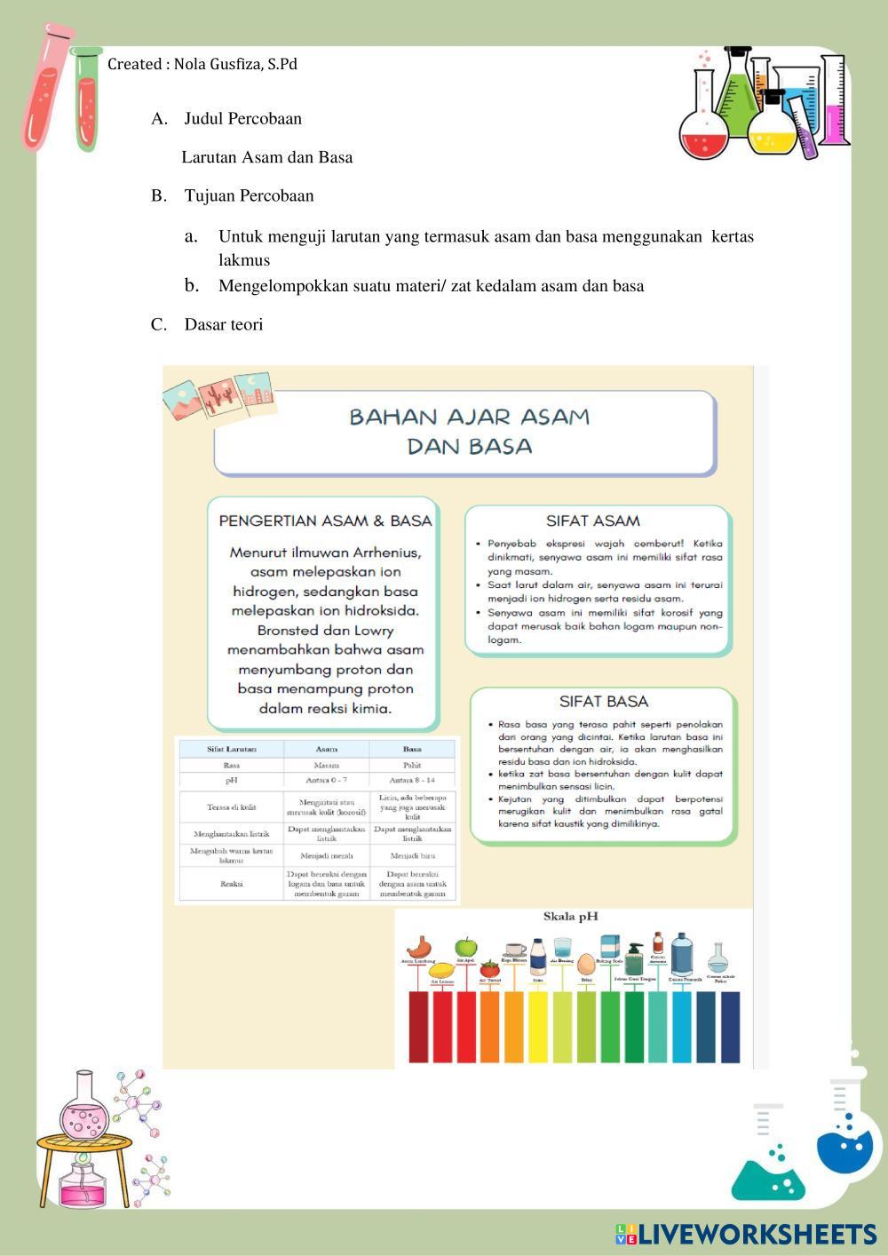 Created byNOLA GUSFIZA Ilmu Pengetahuan Alam (IPA) BAB 5 REAKSI KIMIA DAN DINAMIKA Age 12-17 level: 9 Indonesian Author's Instructions My Google Classroom Courses × 0 classes selected (0 students total) Quick Access Select all classes (0 classes) All Classes Loading courses... Cancel Share Share to selected Course __COURSE_NAME__ __STUDENT_NAME__ (__STUDENT_EMAIL__) LKPD ASAM BASA KELAS 9 Download Worksheet Validation Check my answers Emails my answers to my teacher Full name Group/level School subject Teacher's email or key code Close Submit Validating worksheet... (12) Your answers have been sent to your teacher. Good luck! OK We encountered an error submitting your answers. Please try again. OK Advertisement | Go Ad Free Created byNOLA GUSFIZA Ilmu Pengetahuan Alam (IPA) BAB 5 REAKSI KIMIA DAN DINAMIKA Age 12-17 level: 9 Indonesian Author's Instructions
