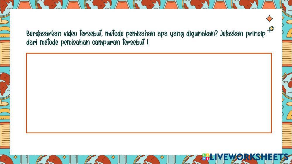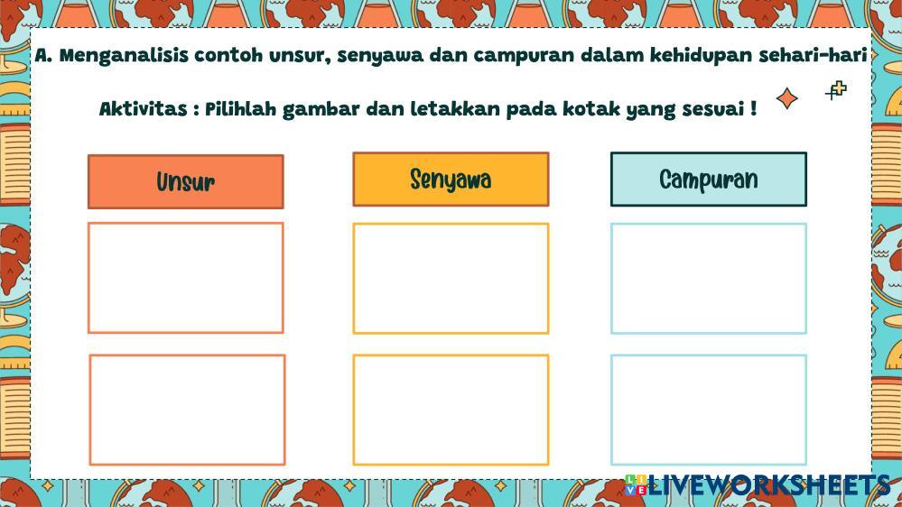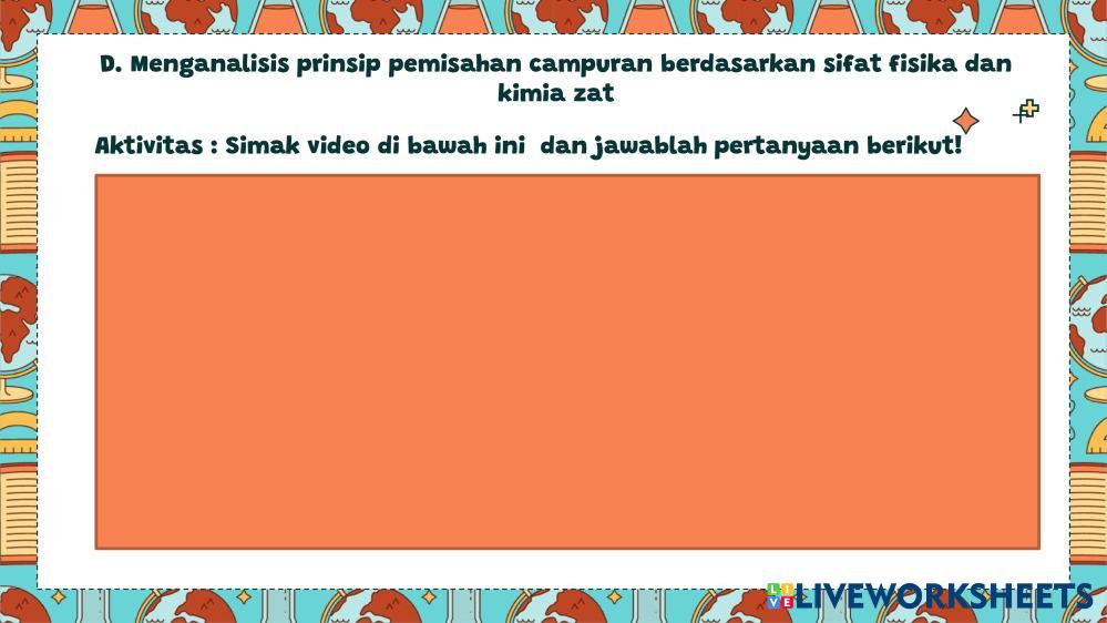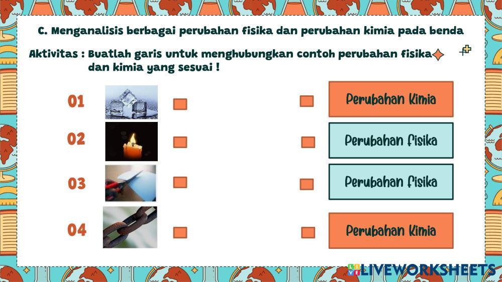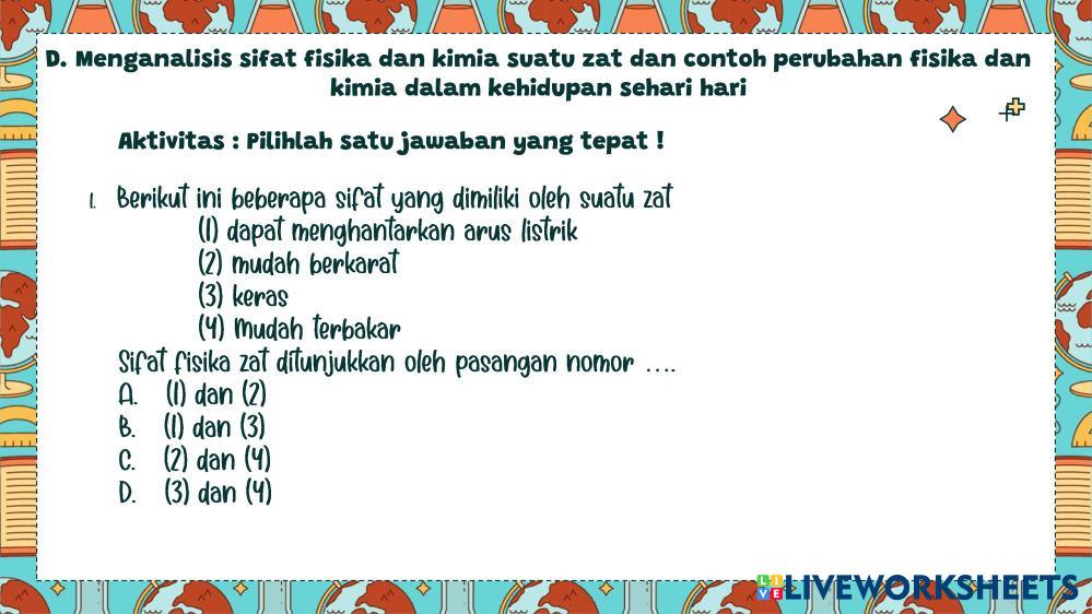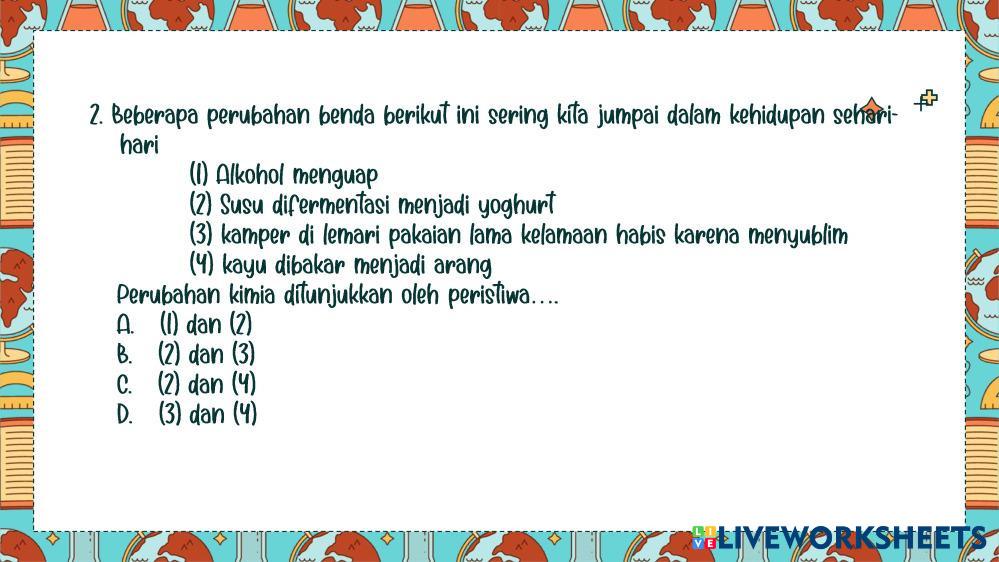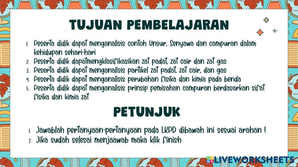 Created byherri cappri Ilmu Pengetahuan Alam (IPA) Zat dan Perubahan Wujud Zat Age 13+ level: Kelas 7 Indonesian Author's Instructions My Google Classroom Courses × 0 classes selected (0 students total) Quick Access Select all classes (0 classes) All Classes Loading courses... Cancel Share Share to selected Course __COURSE_NAME__ __STUDENT_NAME__ (__STUDENT_EMAIL__) LKPD Zat dan Perubahannya Download Worksheet Validation Check my answers Emails my answers to my teacher Full name Group/level School subject Teacher's email or key code Close Submit Validating worksheet... (12) Your answers have been sent to your teacher. Good luck! OK We encountered an error submitting your answers. Please try again. OK Advertisement | Go Ad Free Created byherri cappri Ilmu Pengetahuan Alam (IPA) Zat dan Perubahan Wujud Zat Age 13+ level: Kelas 7 Indonesian Author's Instructions
