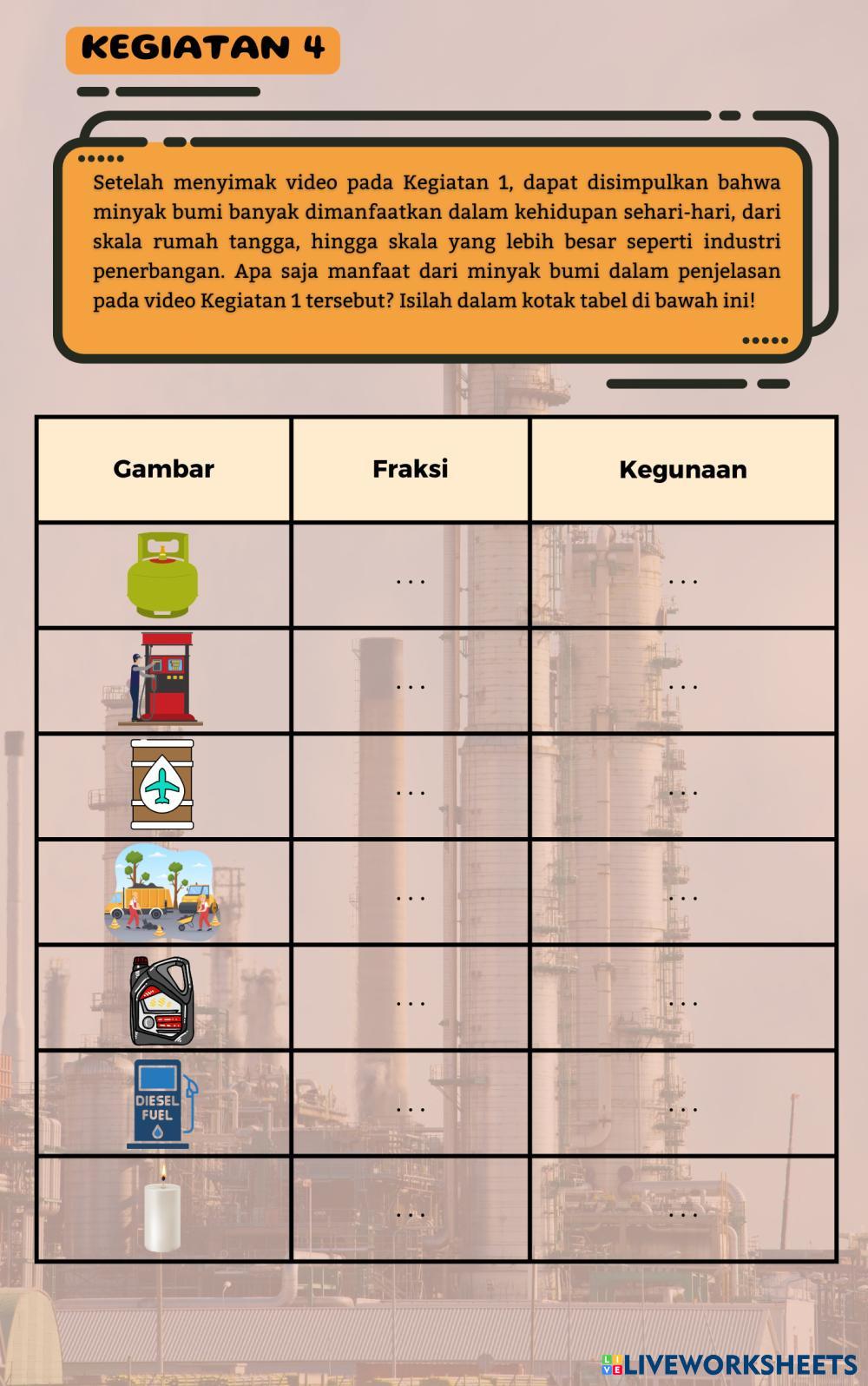 Created byWulan Sari Ilmu Pengetahuan Alam (IPA) Minyak bumi Age 15+ level: 1 Indonesian Author's Instructions My Google Classroom Courses × 0 classes selected (0 students total) Quick Access Select all classes (0 classes) All Classes Loading courses... Cancel Share Share to selected Course __COURSE_NAME__ __STUDENT_NAME__ (__STUDENT_EMAIL__) LKPD MINYAK BUMI BERBASIS SETS-PBL Download Worksheet Validation Check my answers Emails my answers to my teacher Full name Group/level School subject Teacher's email or key code Close Submit Validating worksheet... (12) Your answers have been sent to your teacher. Good luck! OK We encountered an error submitting your answers. Please try again. OK Advertisement | Go Ad Free Created byWulan Sari Ilmu Pengetahuan Alam (IPA) Minyak bumi Age 15+ level: 1 Indonesian Author's Instructions