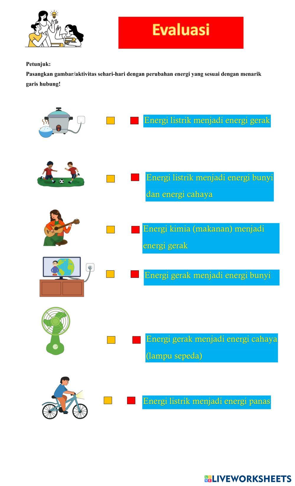 Created byPratiwi Oktaviani Ilmu Pengetahuan Alam (IPA) Perubahan bentuk energi Age 9-13 level: 2 Indonesian Author's Instructions Kerjakan evaluasi berikut dengan cara menjodohkan gambar dengan perubahan energi yang tepat My Google Classroom Courses × 0 classes selected (0 students total) Quick Access Select all classes (0 classes) All Classes Loading courses... Cancel Share Share to selected Course __COURSE_NAME__ __STUDENT_NAME__ (__STUDENT_EMAIL__) Perubahan Bentuk Energi Download Worksheet Validation Check my answers Emails my answers to my teacher Full name Group/level School subject Teacher's email or key code Close Submit Validating worksheet... (12) Your answers have been sent to your teacher. Good luck! OK We encountered an error submitting your answers. Please try again. OK Advertisement | Go Ad Free Created byPratiwi Oktaviani Ilmu Pengetahuan Alam (IPA) Perubahan bentuk energi Age 9-13 level: 2 Indonesian Author's Instructions Kerjakan evaluasi berikut dengan cara menjodohkan gambar dengan perubahan energi yang tepat