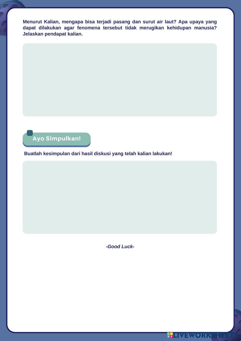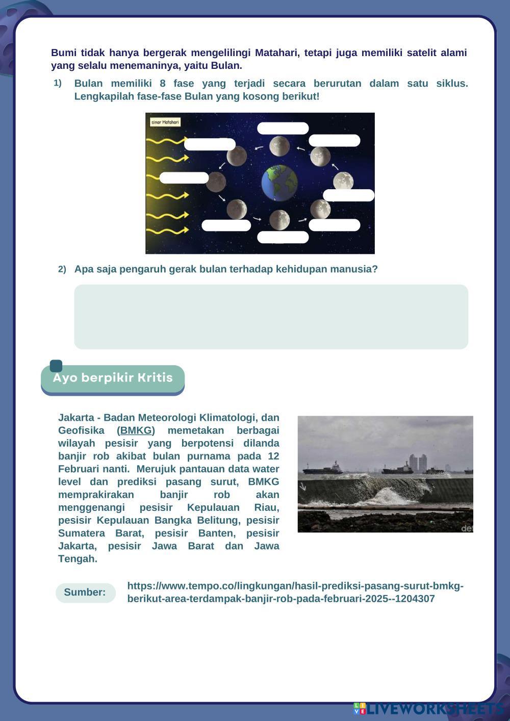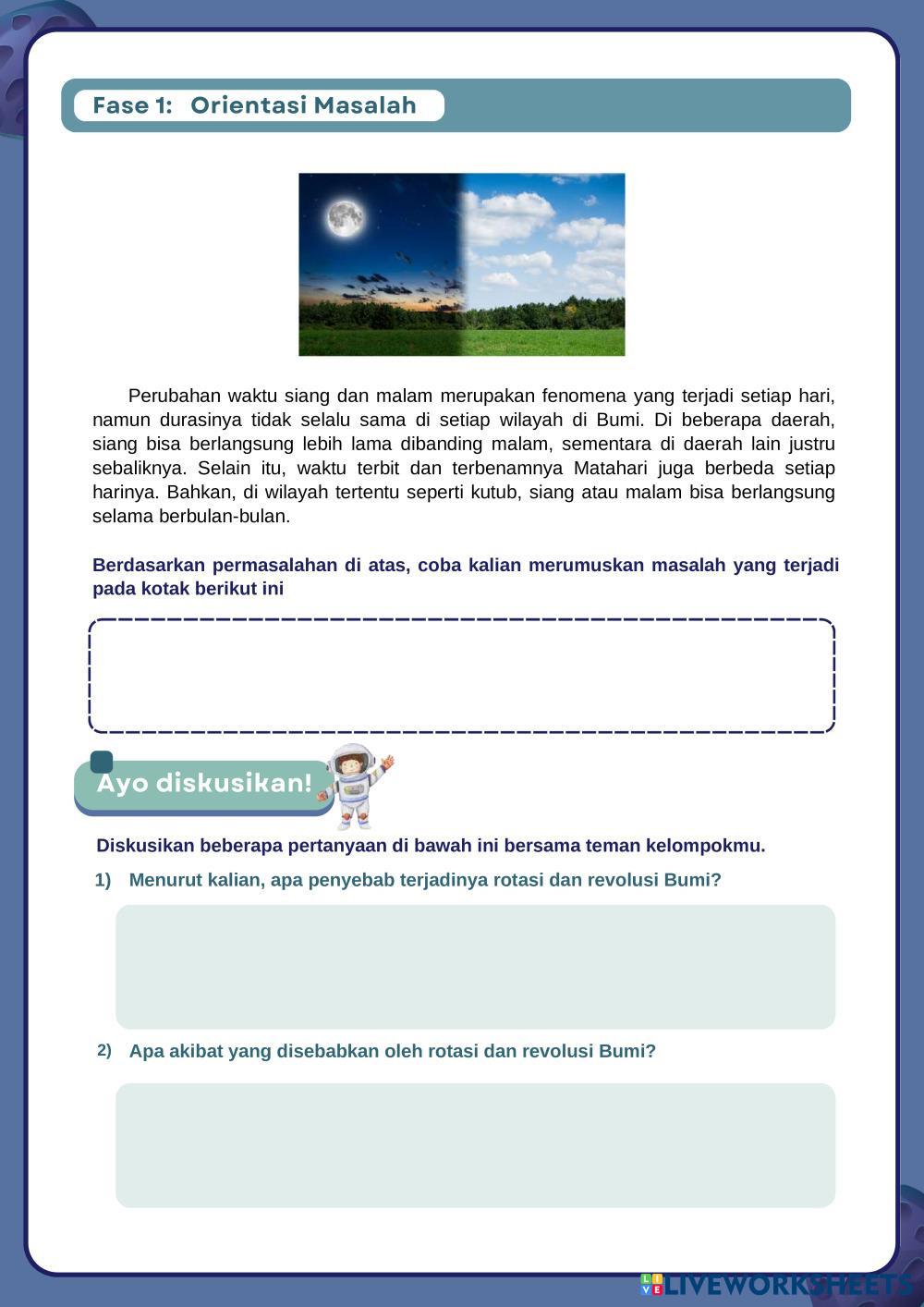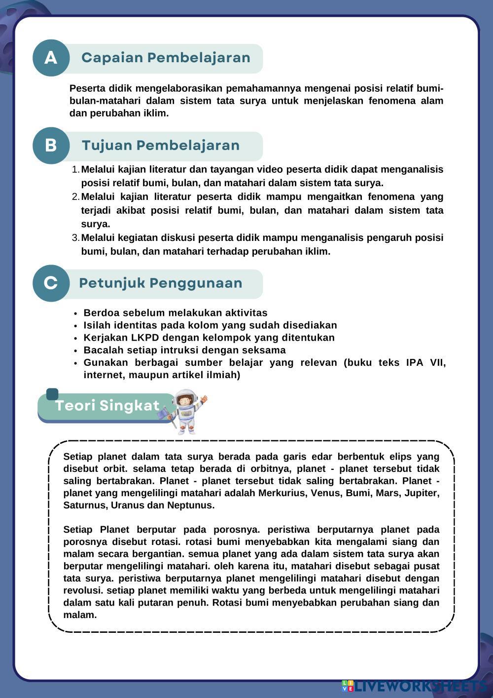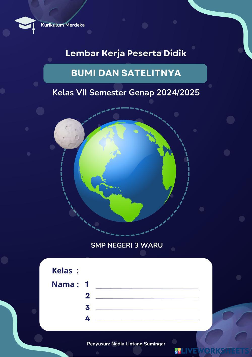 Created byNadia Lintang Ilmu Pengetahuan Alam (IPA) Bumi dan Satelitnya Age 12-17 level: 7 Indonesian Author's Instructions My Google Classroom Courses × 0 classes selected (0 students total) Quick Access Select all classes (0 classes) All Classes Loading courses... Cancel Share Share to selected Course __COURSE_NAME__ __STUDENT_NAME__ (__STUDENT_EMAIL__) LEMBAR KERJA PESERTA DIDIK KELAS VII MATERI BUMI DAN SATELITNYA Download Worksheet Validation Check my answers Emails my answers to my teacher Full name Group/level School subject Teacher's email or key code Close Submit Validating worksheet... (12) Your answers have been sent to your teacher. Good luck! OK We encountered an error submitting your answers. Please try again. OK Advertisement | Go Ad Free Created byNadia Lintang Ilmu Pengetahuan Alam (IPA) Bumi dan Satelitnya Age 12-17 level: 7 Indonesian Author's Instructions