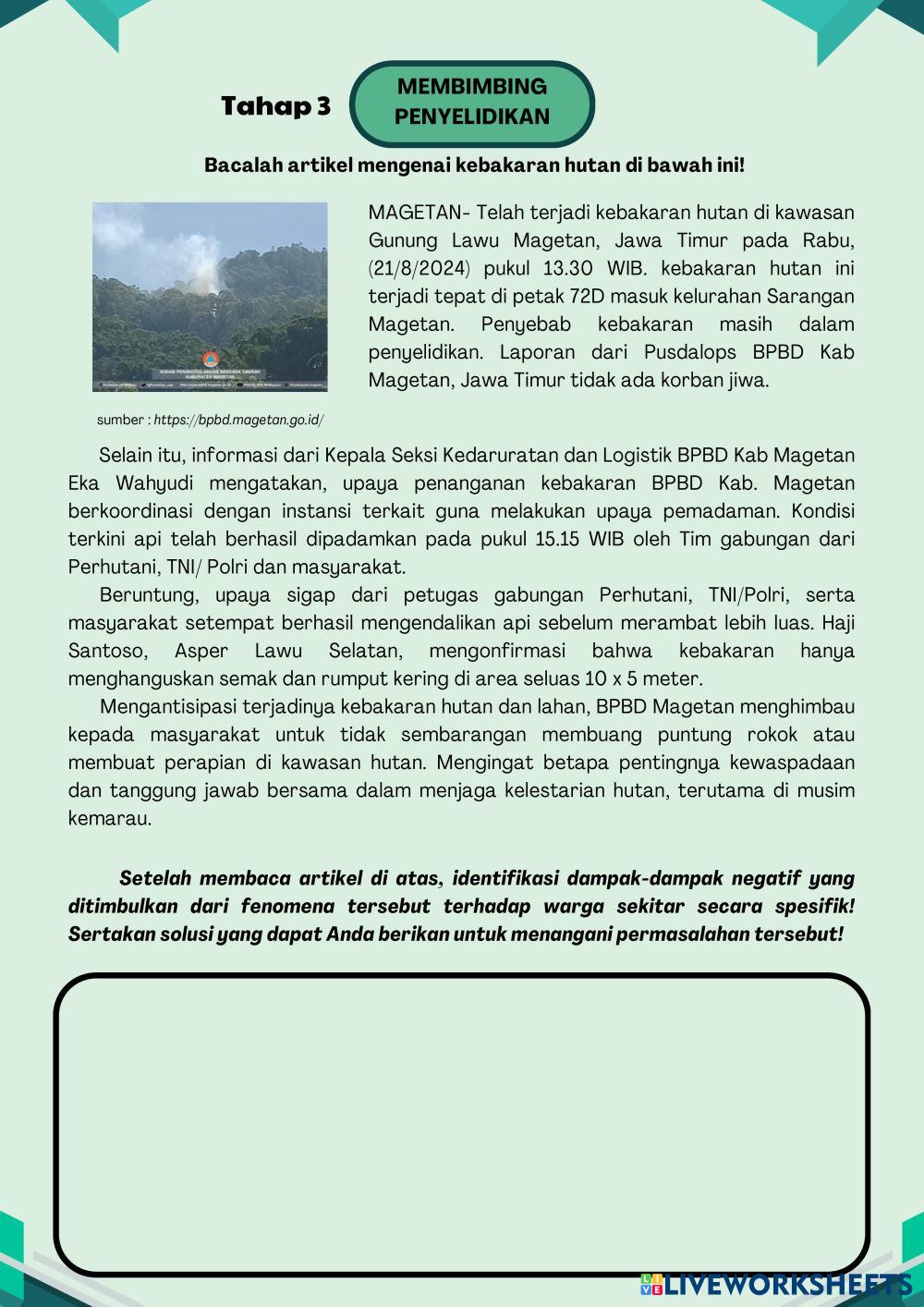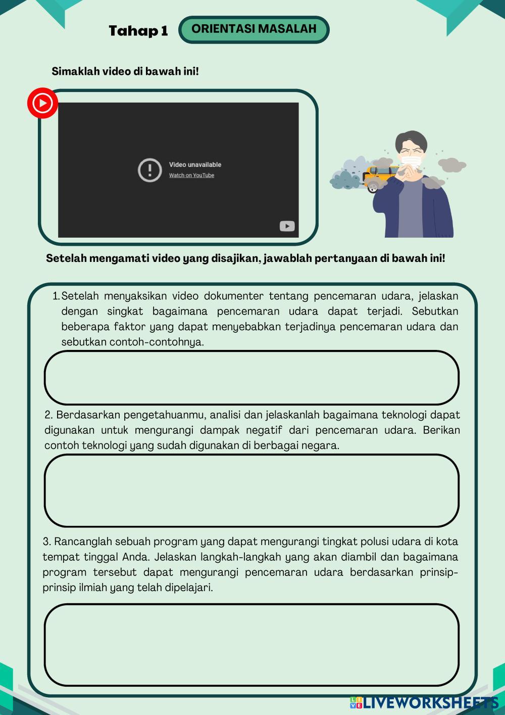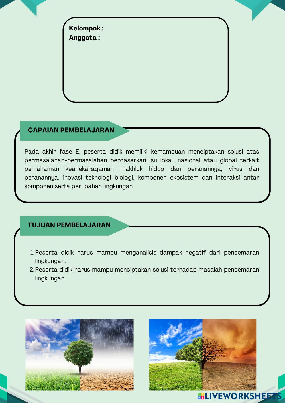 Created by mediaalfi Ilmu Pengetahuan Alam (IPA) Perubahan Lingkungan Age 8+ level: 11 Indonesian Author's Instructions My Google Classroom Courses × 0 classes selected (0 students total) Quick Access Select all classes (0 classes) All Classes Loading courses... Cancel Share Share to selected Course __COURSE_NAME__ __STUDENT_NAME__ (__STUDENT_EMAIL__) LKPD 2-PERUBAHAN LINGKUNGAN Download Worksheet Validation Check my answers Emails my answers to my teacher Full name Group/level School subject Teacher's email or key code Close Submit Validating worksheet... (12) Your answers have been sent to your teacher. Good luck! OK We encountered an error submitting your answers. Please try again. OK Advertisement | Go Ad Free Created by mediaalfi Ilmu Pengetahuan Alam (IPA) Perubahan Lingkungan Age 8+ level: 11 Indonesian Author's Instructions