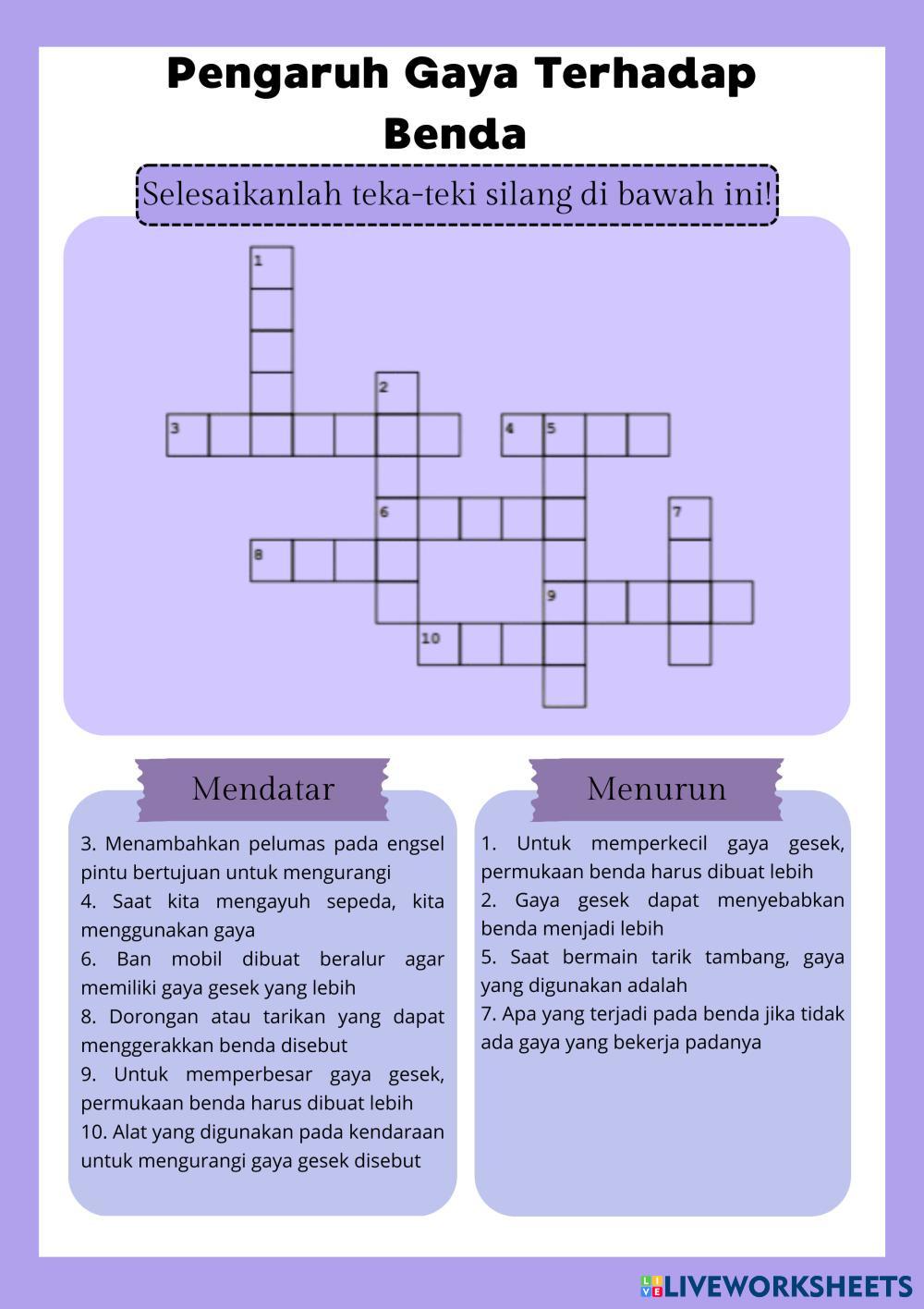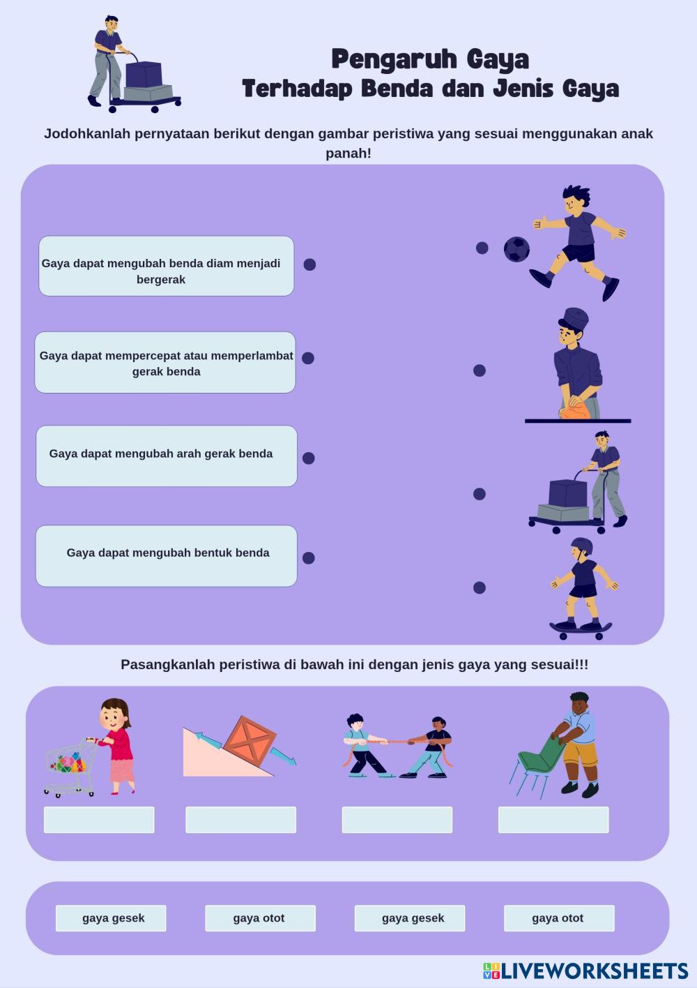Created byAmanda Ikra Negara Ilmu Pengetahuan Alam (IPA) Pengaruh Gaya terhadap benda Age 7-10 level: 4 Indonesian Author's Instructions My Google Classroom Courses × 0 classes selected (0 students total) Quick Access Select all classes (0 classes) All Classes Loading courses... Cancel Share Share to selected Course __COURSE_NAME__ __STUDENT_NAME__ (__STUDENT_EMAIL__) LKPD Download Worksheet Validation Check my answers Emails my answers to my teacher Full name Group/level School subject Teacher's email or key code Close Submit Validating worksheet... (12) Your answers have been sent to your teacher. Good luck! OK We encountered an error submitting your answers. Please try again. OK Advertisement | Go Ad Free Created byAmanda Ikra Negara Ilmu Pengetahuan Alam (IPA) Pengaruh Gaya terhadap benda Age 7-10 level: 4 Indonesian Author's Instructions