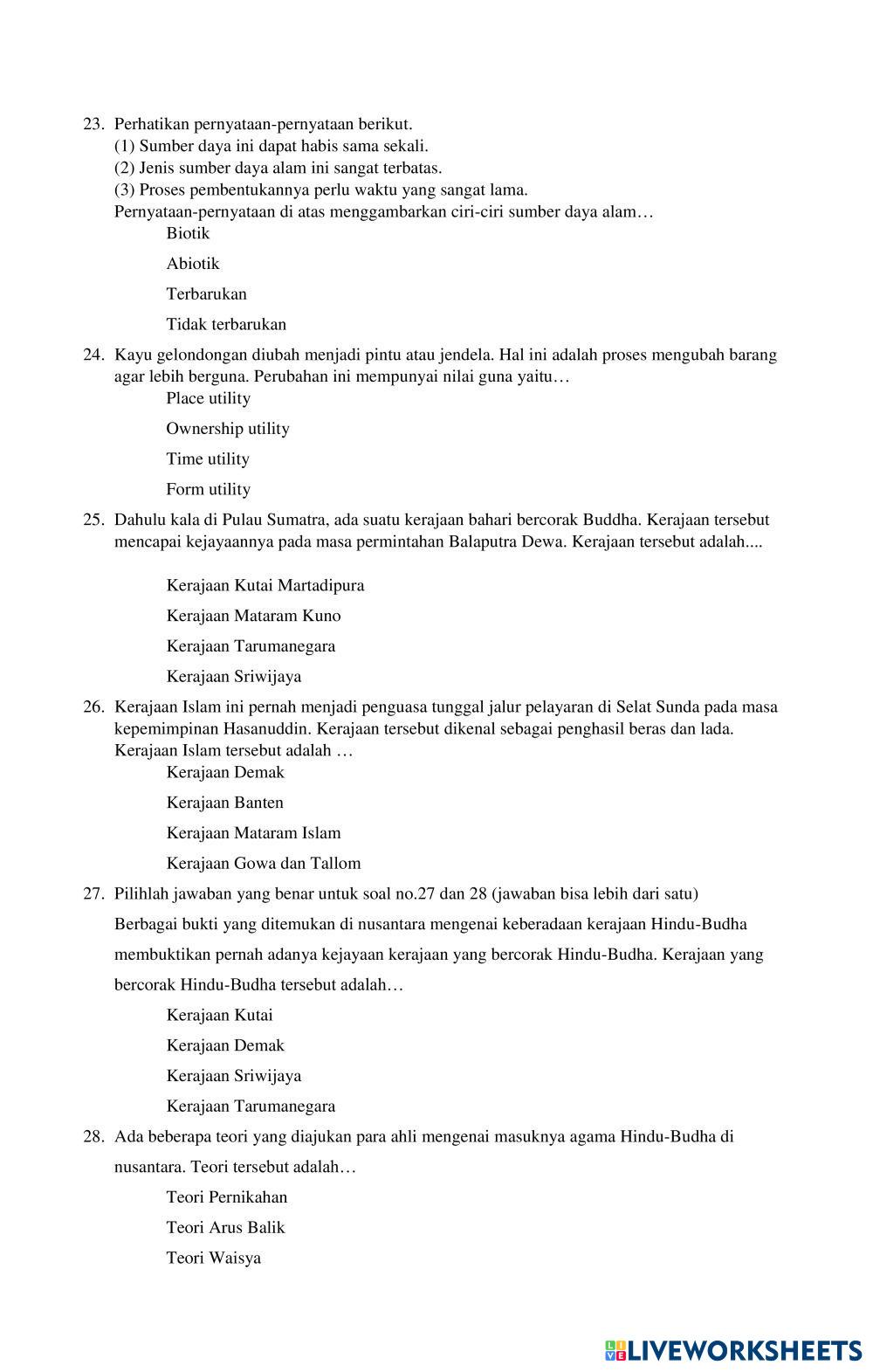 Created by LILIKSUS_28SMPK Ilmu Pengetahuan Sosial (IPS) STS IPS KELAS 7 Age 11-17 level: 7 Indonesian Author's Instructions STS IPS GNP My Google Classroom Courses × 0 classes selected (0 students total) Quick Access Select all classes (0 classes) All Classes Loading courses... Cancel Share Share to selected Course __COURSE_NAME__ __STUDENT_NAME__ (__STUDENT_EMAIL__) STS GNP 7 Download Worksheet Validation Check my answers Emails my answers to my teacher Full name Group/level School subject Teacher's email or key code Close Submit Validating worksheet... (12) Your answers have been sent to your teacher. Good luck! OK We encountered an error submitting your answers. Please try again. OK Advertisement | Go Ad Free Created by LILIKSUS_28SMPK Ilmu Pengetahuan Sosial (IPS) STS IPS KELAS 7 Age 11-17 level: 7 Indonesian Author's Instructions STS IPS GNP
