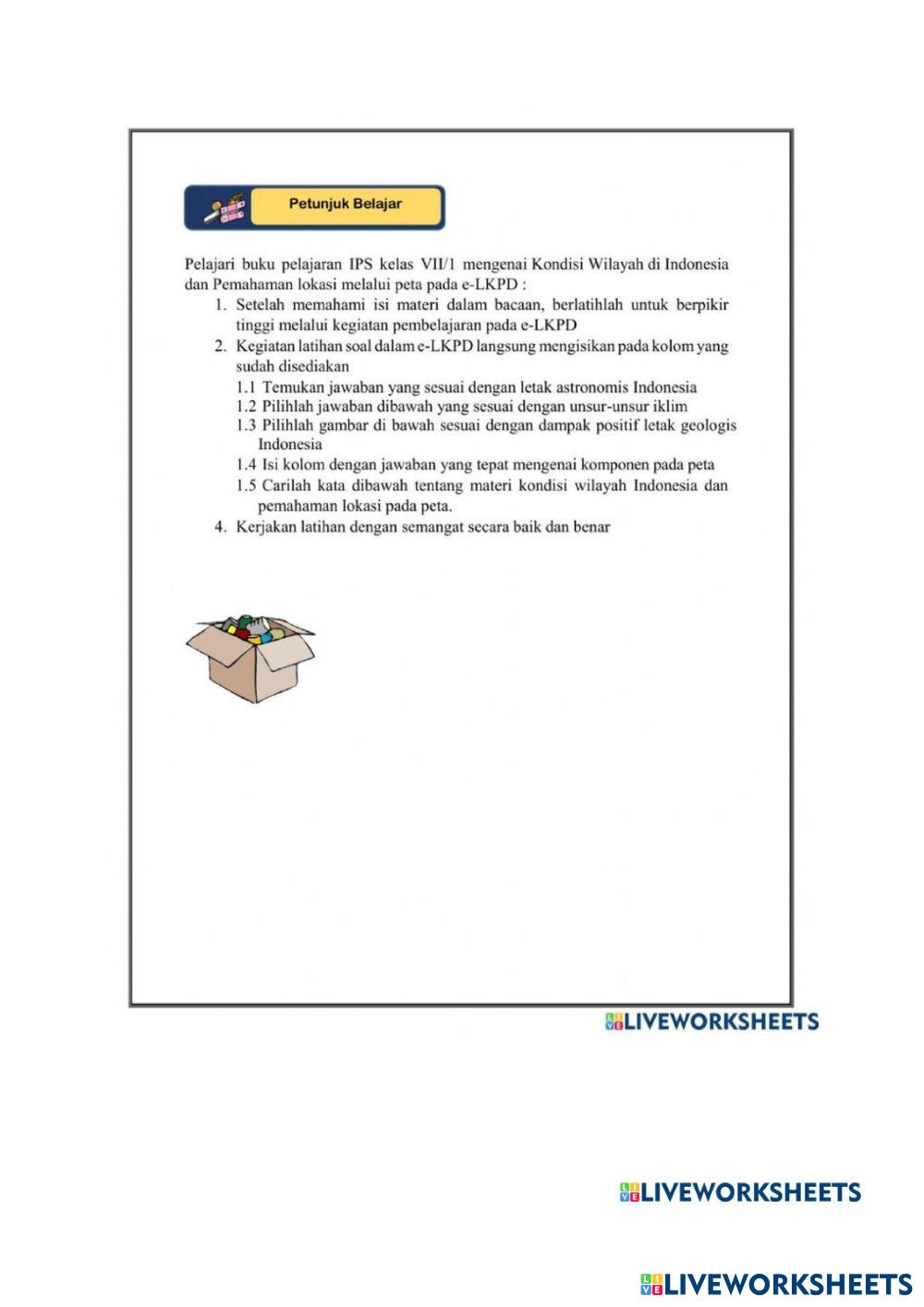 Created bynurlinda Ilmu Pengetahuan Sosial (IPS) Tema 1 B Mengenal Lokasi Tempat Tinggal Age 3-6 level: 2 Indonesian Author's Instructions mengenal lokasi dan tempat tinngal My Google Classroom Courses × 0 classes selected (0 students total) Quick Access Select all classes (0 classes) All Classes Loading courses... Cancel Share Share to selected Course __COURSE_NAME__ __STUDENT_NAME__ (__STUDENT_EMAIL__) lembar kerja siswa kela 7 Download Worksheet Validation Check my answers Emails my answers to my teacher Full name Group/level School subject Teacher's email or key code Close Submit Validating worksheet... (12) Your answers have been sent to your teacher. Good luck! OK We encountered an error submitting your answers. Please try again. OK Advertisement | Go Ad Free Created bynurlinda Ilmu Pengetahuan Sosial (IPS) Tema 1 B Mengenal Lokasi Tempat Tinggal Age 3-6 level: 2 Indonesian Author's Instructions mengenal lokasi dan tempat tinngal