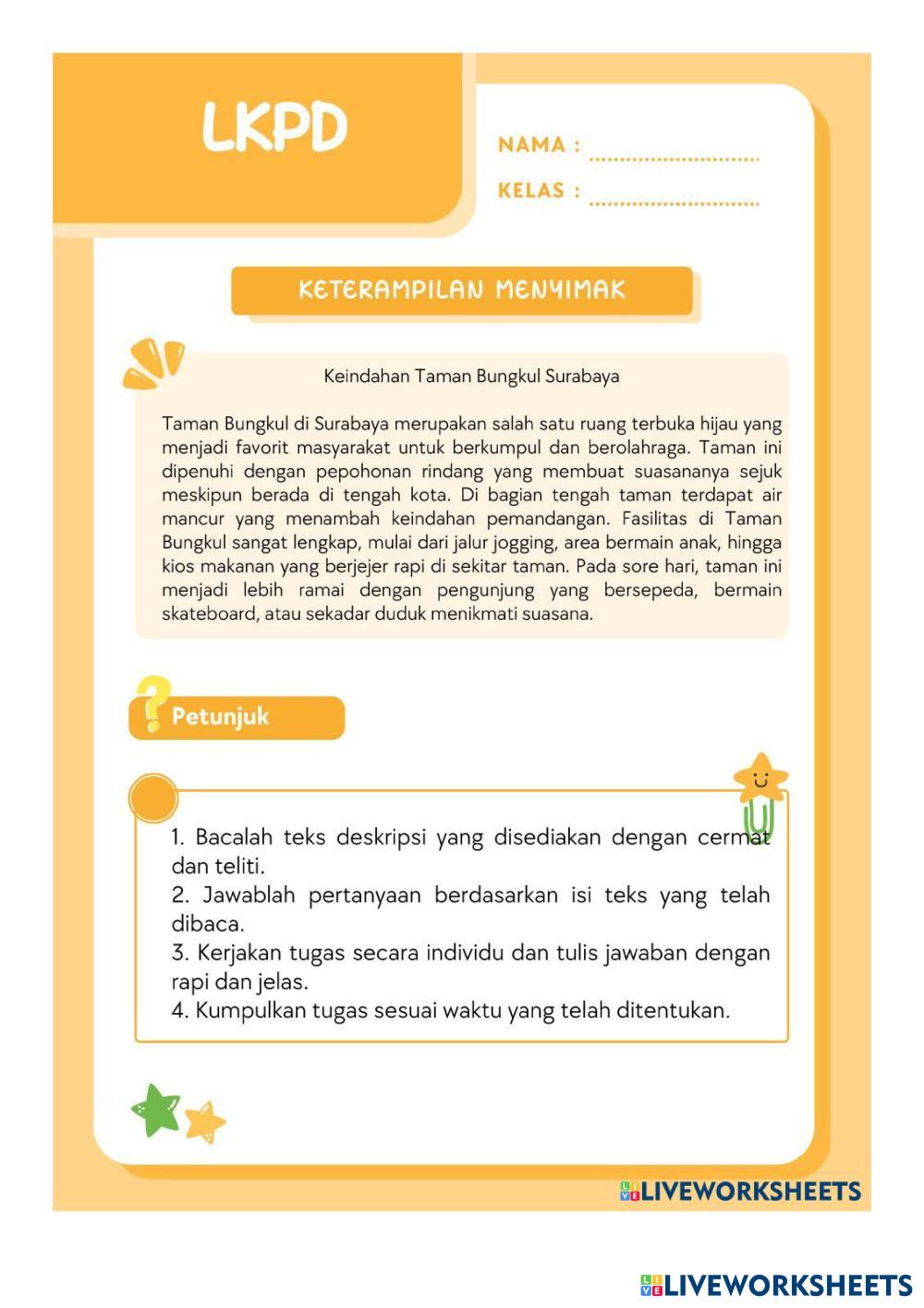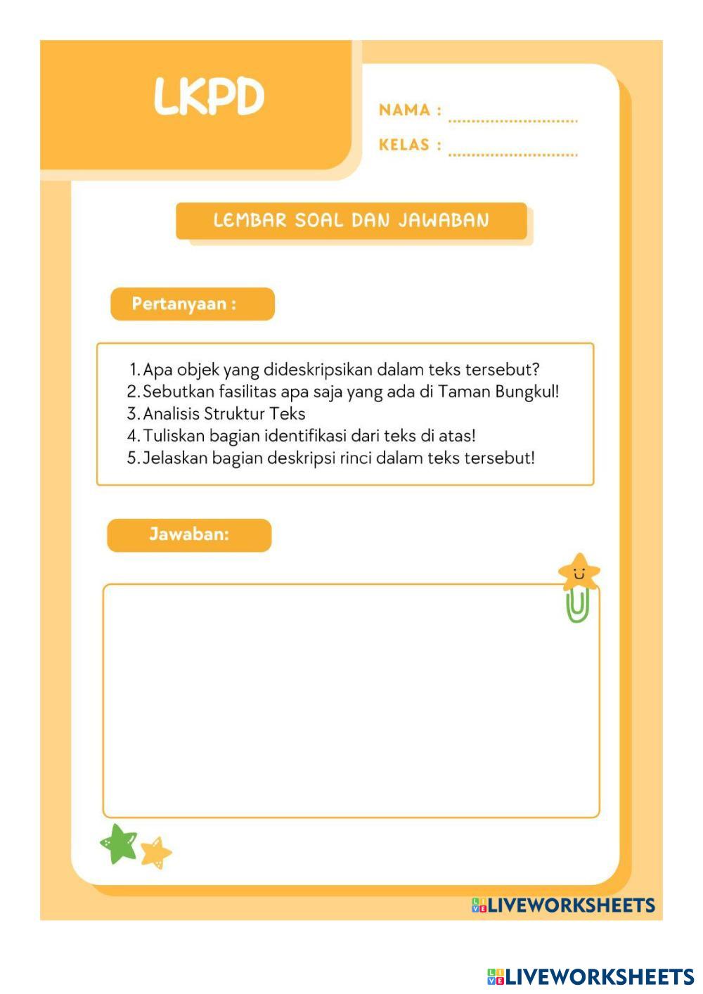Created byirchamxdharman indonesia Teks Deskripsi Age 15+ level: 9 Indonesian Author's Instructions My Google Classroom Courses × 0 classes selected (0 students total) Quick Access Select all classes (0 classes) All Classes Loading courses... Cancel Share Share to selected Course __COURSE_NAME__ __STUDENT_NAME__ (__STUDENT_EMAIL__) LKPD teks deskripsi Download Worksheet Validation Check my answers Emails my answers to my teacher Full name Group/level School subject Teacher's email or key code Close Submit Validating worksheet... (12) Your answers have been sent to your teacher. Good luck! OK We encountered an error submitting your answers. Please try again. OK Advertisement | Go Ad Free Created byirchamxdharman indonesia Teks Deskripsi Age 15+ level: 9 Indonesian Author's Instructions