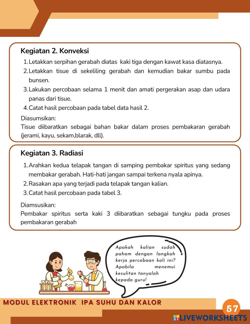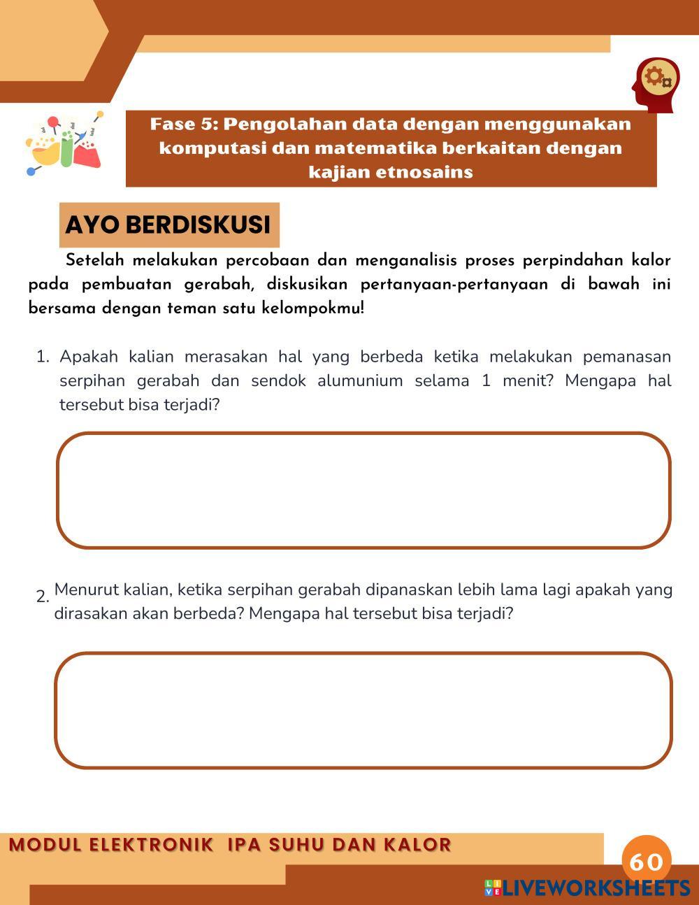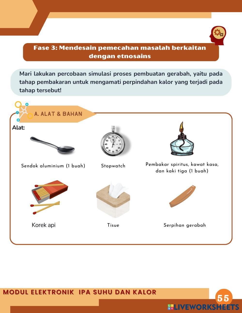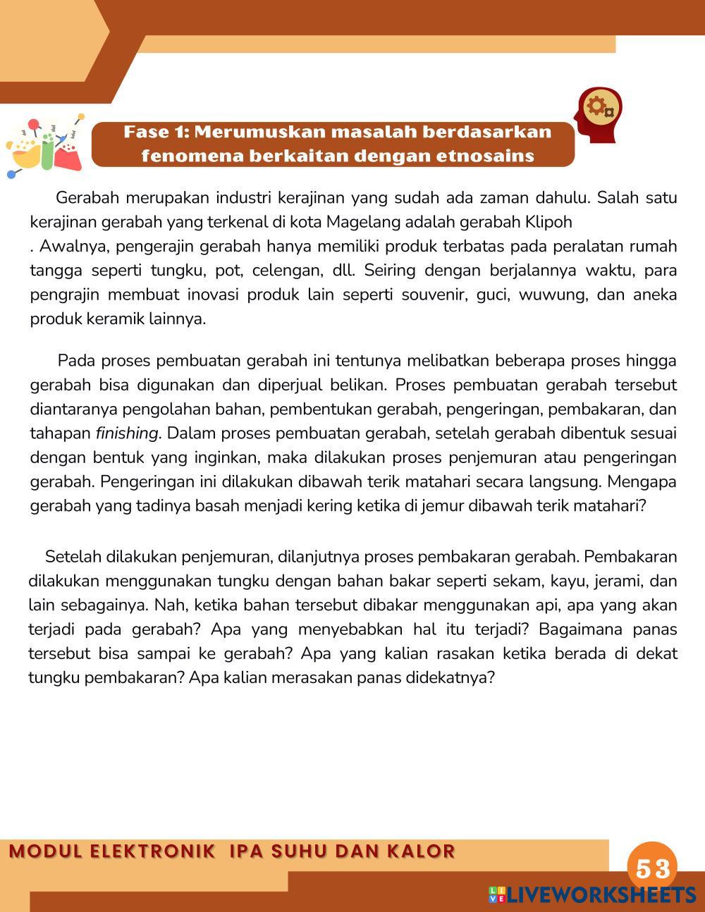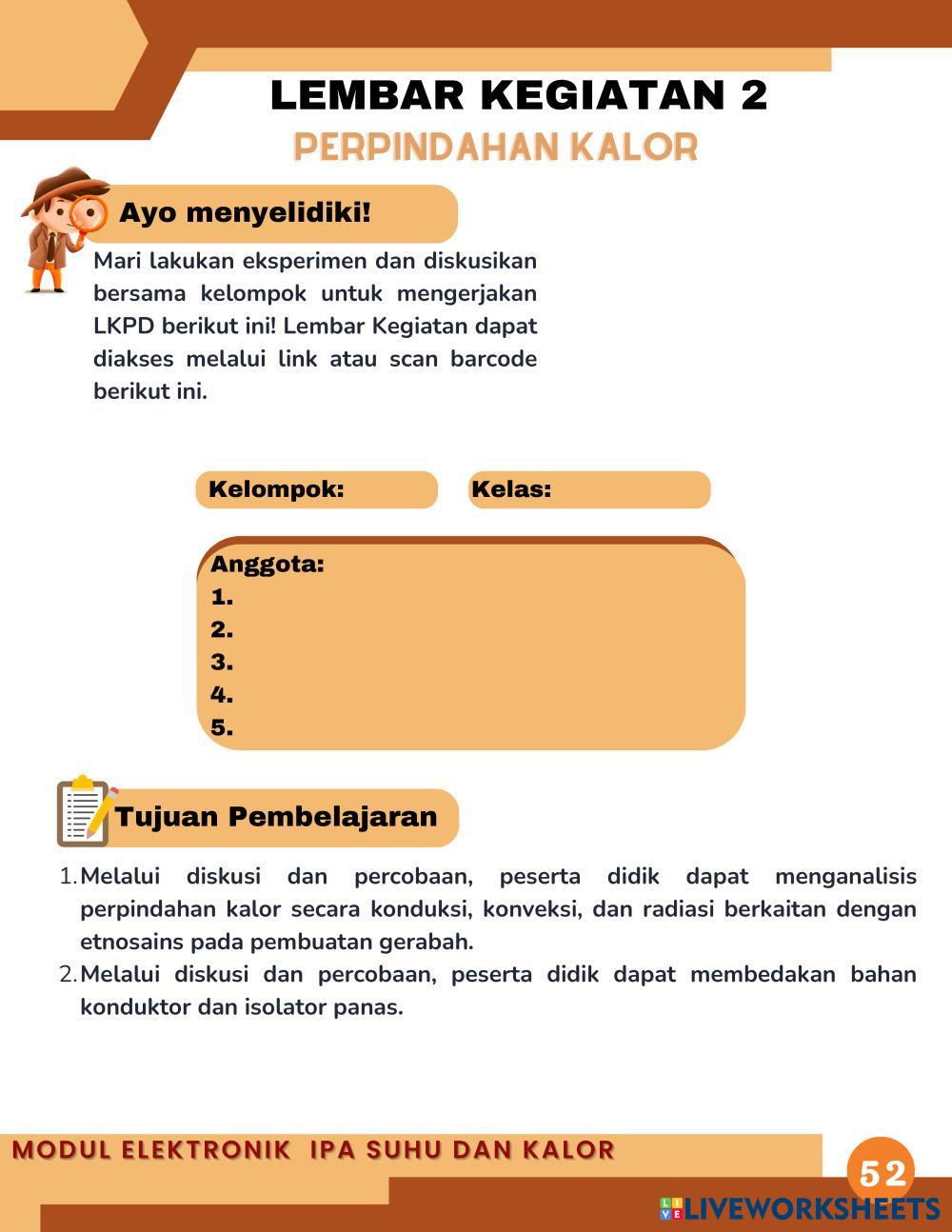 LK 2 dengan tujuan pembelajaran menganalisis perpindahan kalor secara konduksi, konveksi, dan radiasi berkaitan dengan etnosains pada pembuatan gerabah dan membedakan bahan konduktor dan isolator panas.