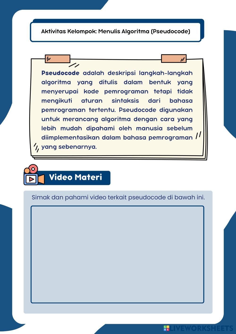 Created byTeacher informatika sma Bahasa Pemograman Age 10+ level: 10 Indonesian Author's Instructions My Google Classroom Courses × 0 classes selected (0 students total) Quick Access Select all classes (0 classes) All Classes Loading courses... Cancel Share Share to selected Course __COURSE_NAME__ __STUDENT_NAME__ (__STUDENT_EMAIL__) LKPD PSEUDOCODE Download Worksheet Validation Check my answers Emails my answers to my teacher Full name Group/level School subject Teacher's email or key code Close Submit Validating worksheet... (12) Your answers have been sent to your teacher. Good luck! OK We encountered an error submitting your answers. Please try again. OK Advertisement | Go Ad Free Created byTeacher informatika sma Bahasa Pemograman Age 10+ level: 10 Indonesian Author's Instructions
