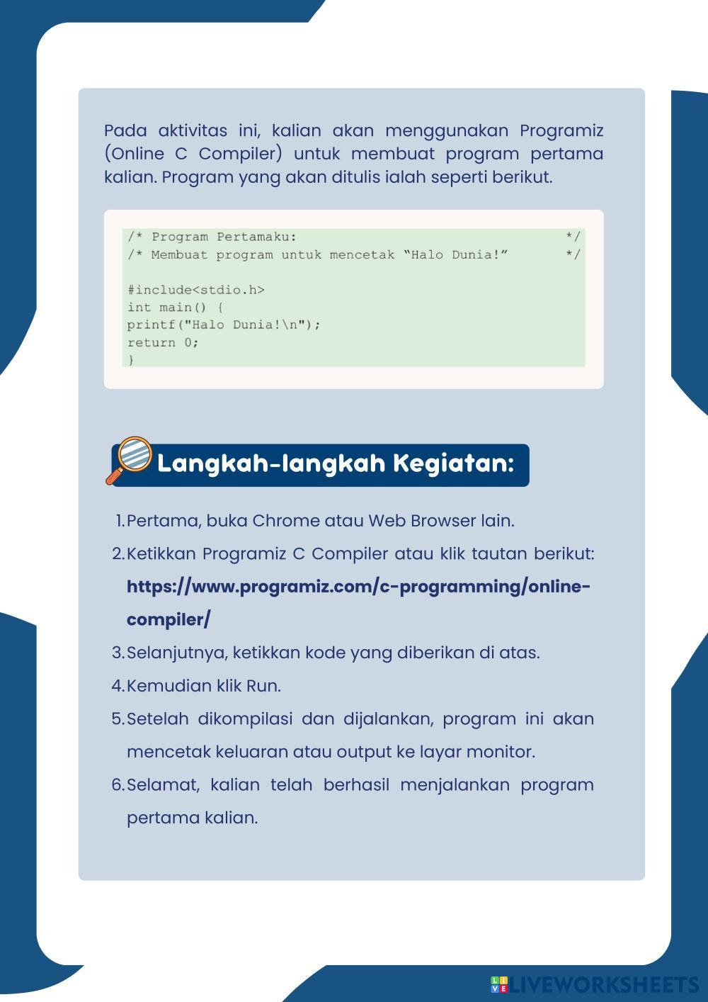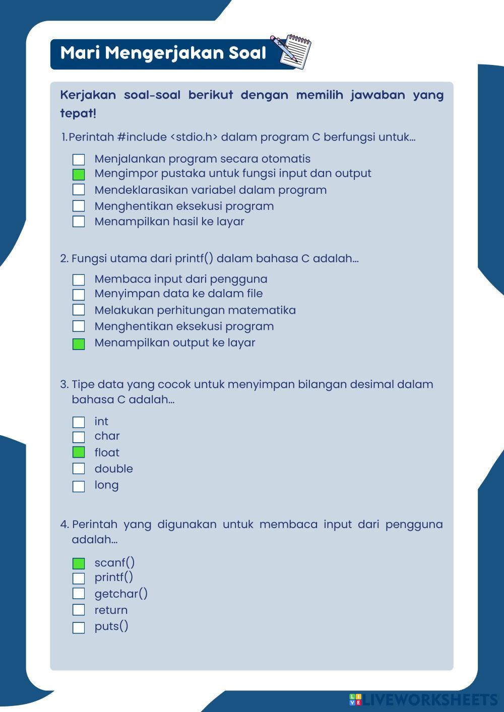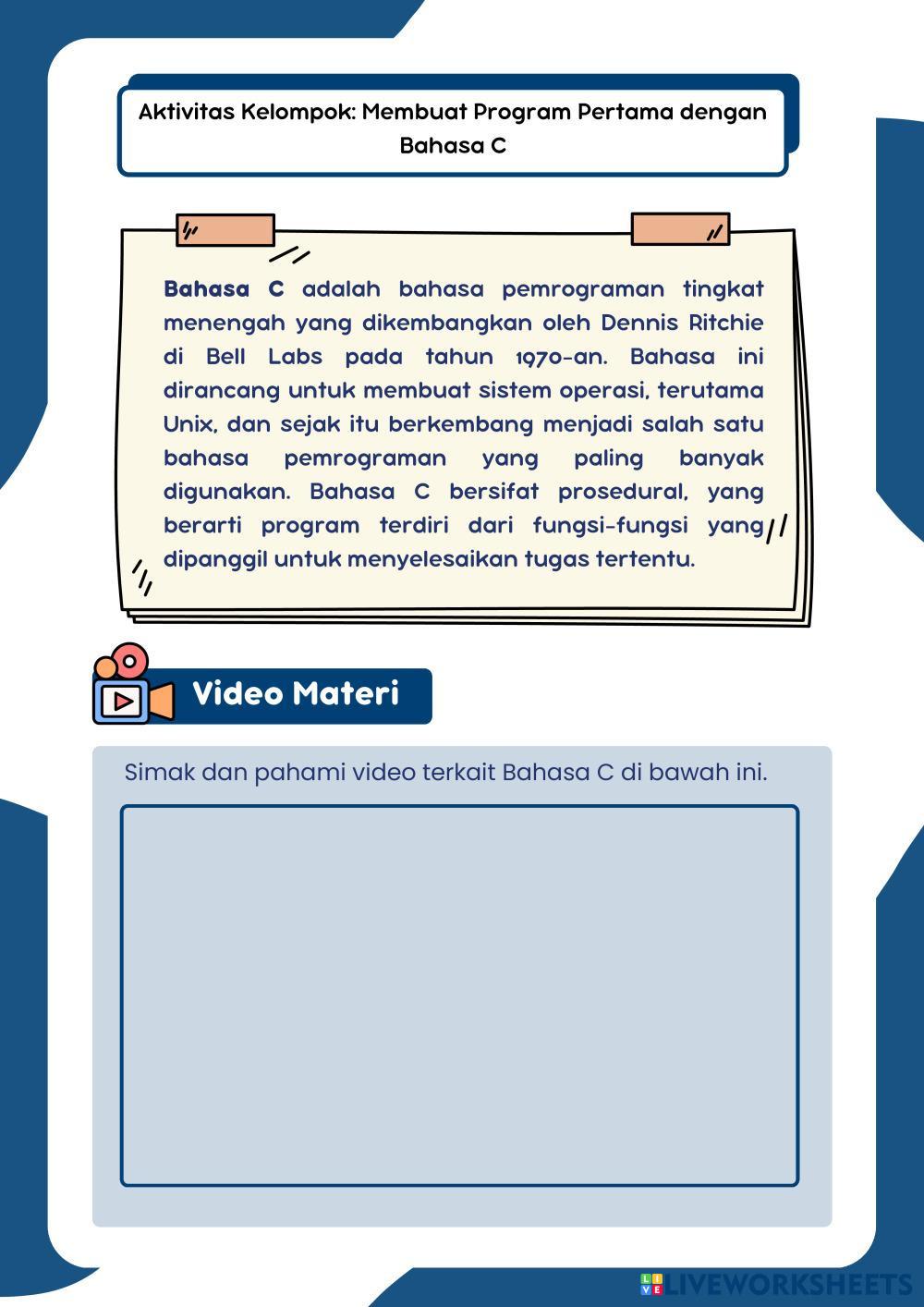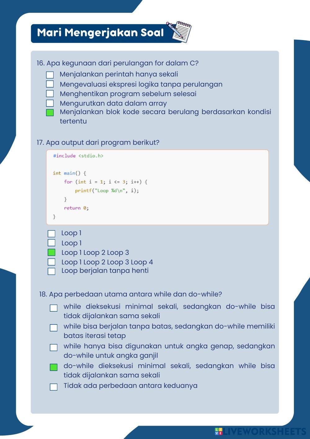 Created byTeacher informatika sma Bahasa Pemograman Age 10+ level: 10 Indonesian Author's Instructions My Google Classroom Courses × 0 classes selected (0 students total) Quick Access Select all classes (0 classes) All Classes Loading courses... Cancel Share Share to selected Course __COURSE_NAME__ __STUDENT_NAME__ (__STUDENT_EMAIL__) LKPD BAHASA PEMROGRAMAN C Download Worksheet Validation Check my answers Emails my answers to my teacher Full name Group/level School subject Teacher's email or key code Close Submit Validating worksheet... (12) Your answers have been sent to your teacher. Good luck! OK We encountered an error submitting your answers. Please try again. OK Advertisement | Go Ad Free Created byTeacher informatika sma Bahasa Pemograman Age 10+ level: 10 Indonesian Author's Instructions