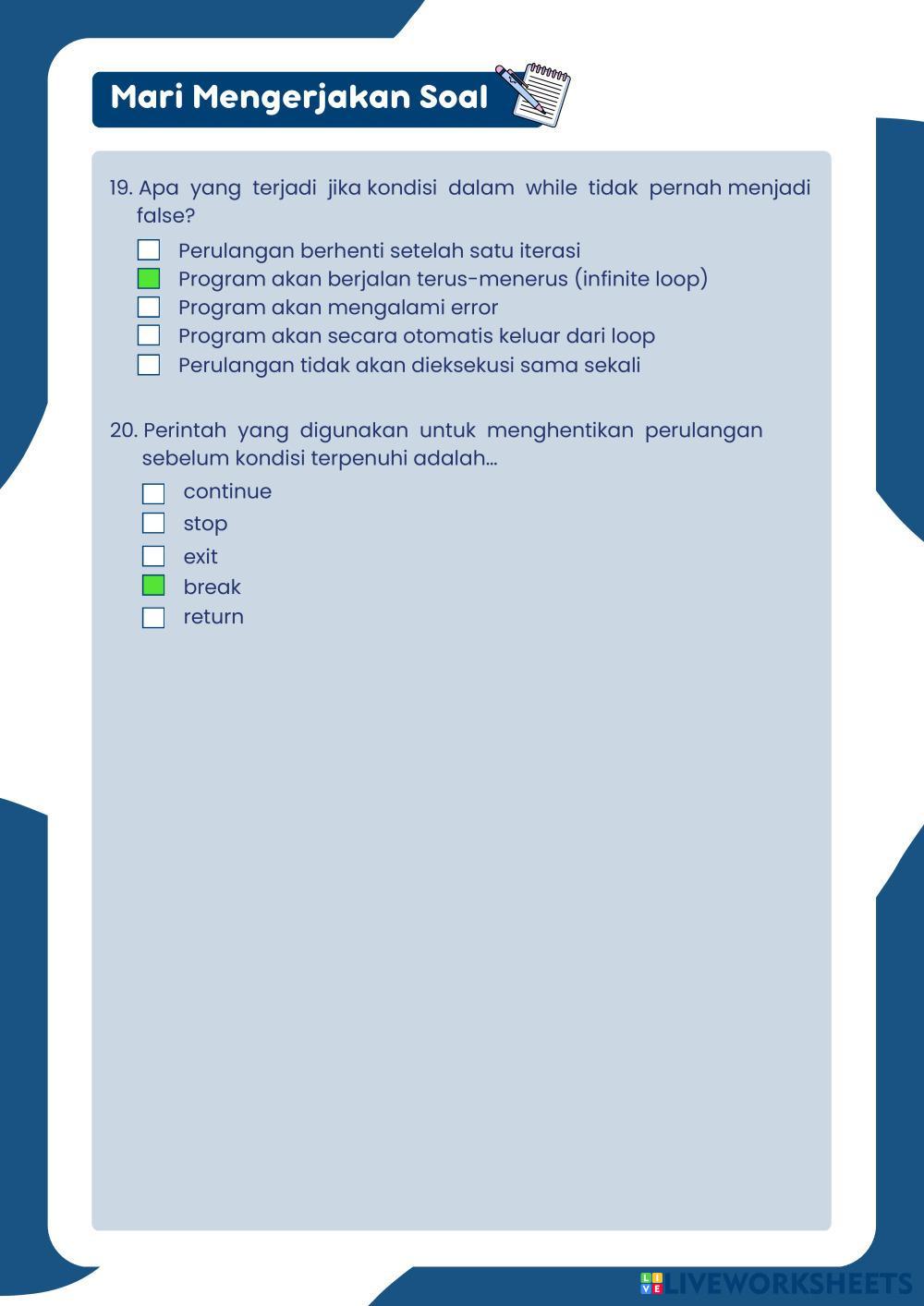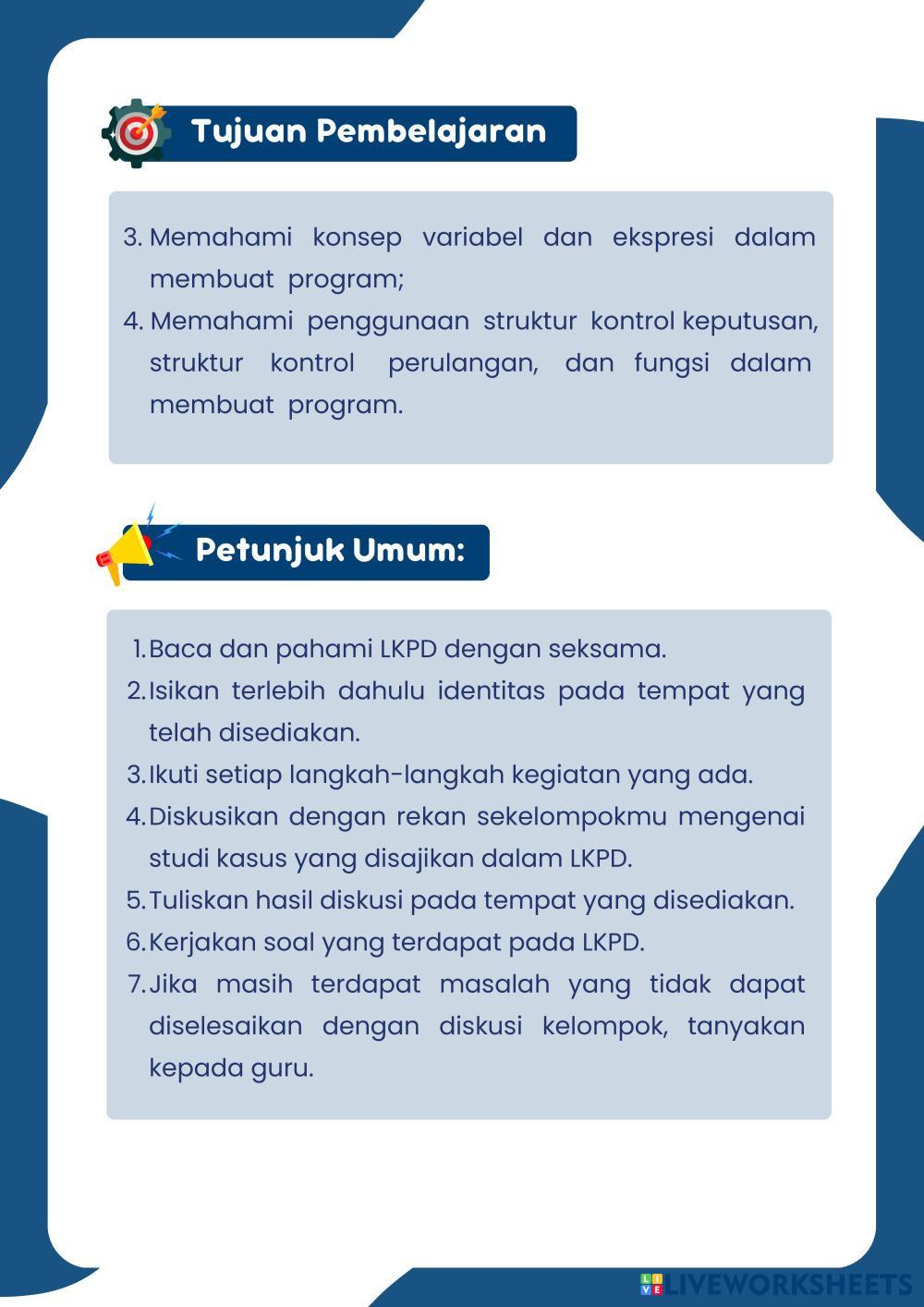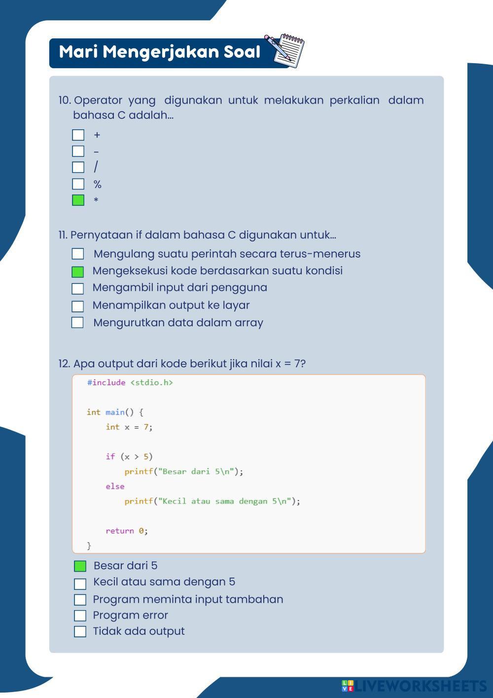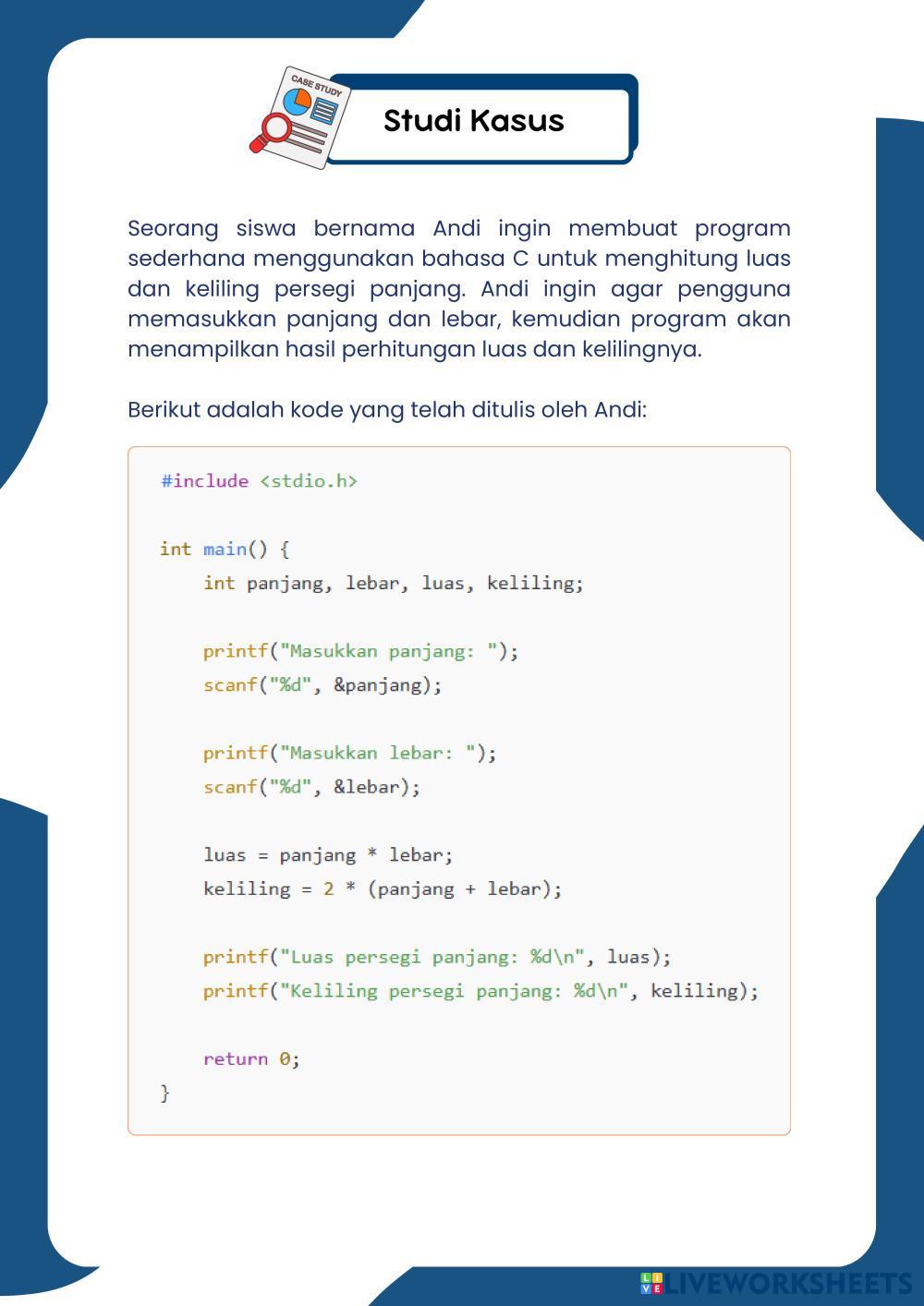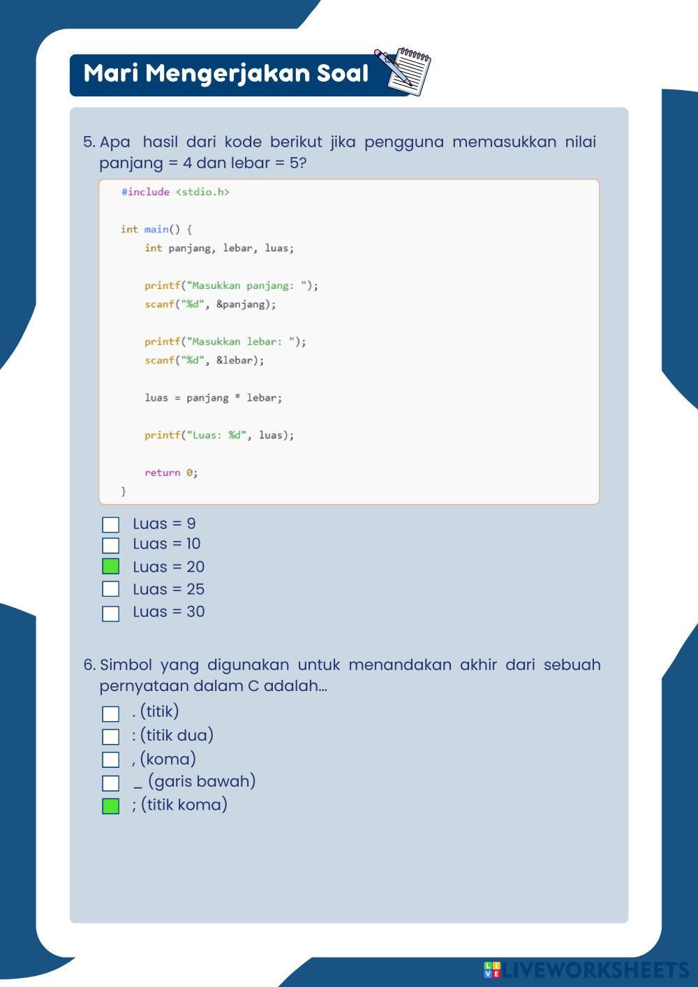 Created byTeacher informatika sma Bahasa Pemograman Age 10+ level: 10 Indonesian Author's Instructions My Google Classroom Courses × 0 classes selected (0 students total) Quick Access Select all classes (0 classes) All Classes Loading courses... Cancel Share Share to selected Course __COURSE_NAME__ __STUDENT_NAME__ (__STUDENT_EMAIL__) LKPD BAHASA PEMROGRAMAN C Download Worksheet Validation Check my answers Emails my answers to my teacher Full name Group/level School subject Teacher's email or key code Close Submit Validating worksheet... (12) Your answers have been sent to your teacher. Good luck! OK We encountered an error submitting your answers. Please try again. OK Advertisement | Go Ad Free Created byTeacher informatika sma Bahasa Pemograman Age 10+ level: 10 Indonesian Author's Instructions