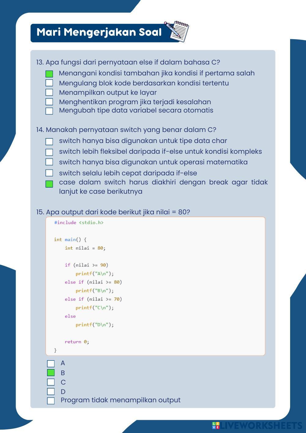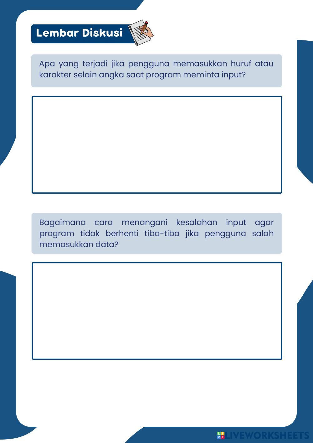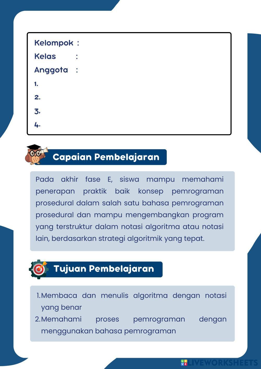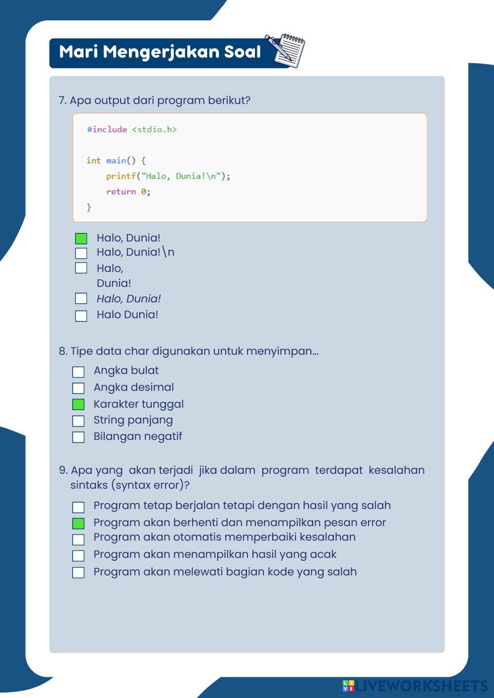 Created byTeacher informatika sma Bahasa Pemograman Age 10+ level: 10 Indonesian Author's Instructions My Google Classroom Courses × 0 classes selected (0 students total) Quick Access Select all classes (0 classes) All Classes Loading courses... Cancel Share Share to selected Course __COURSE_NAME__ __STUDENT_NAME__ (__STUDENT_EMAIL__) LKPD BAHASA PEMROGRAMAN C Download Worksheet Validation Check my answers Emails my answers to my teacher Full name Group/level School subject Teacher's email or key code Close Submit Validating worksheet... (12) Your answers have been sent to your teacher. Good luck! OK We encountered an error submitting your answers. Please try again. OK Advertisement | Go Ad Free Created byTeacher informatika sma Bahasa Pemograman Age 10+ level: 10 Indonesian Author's Instructions