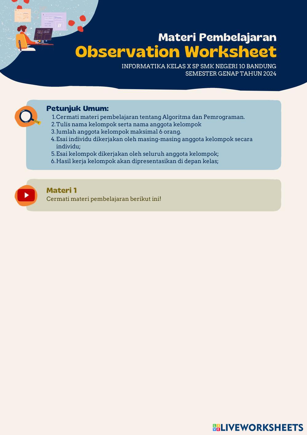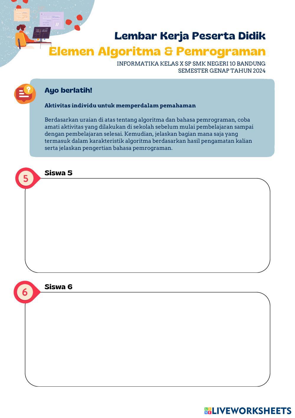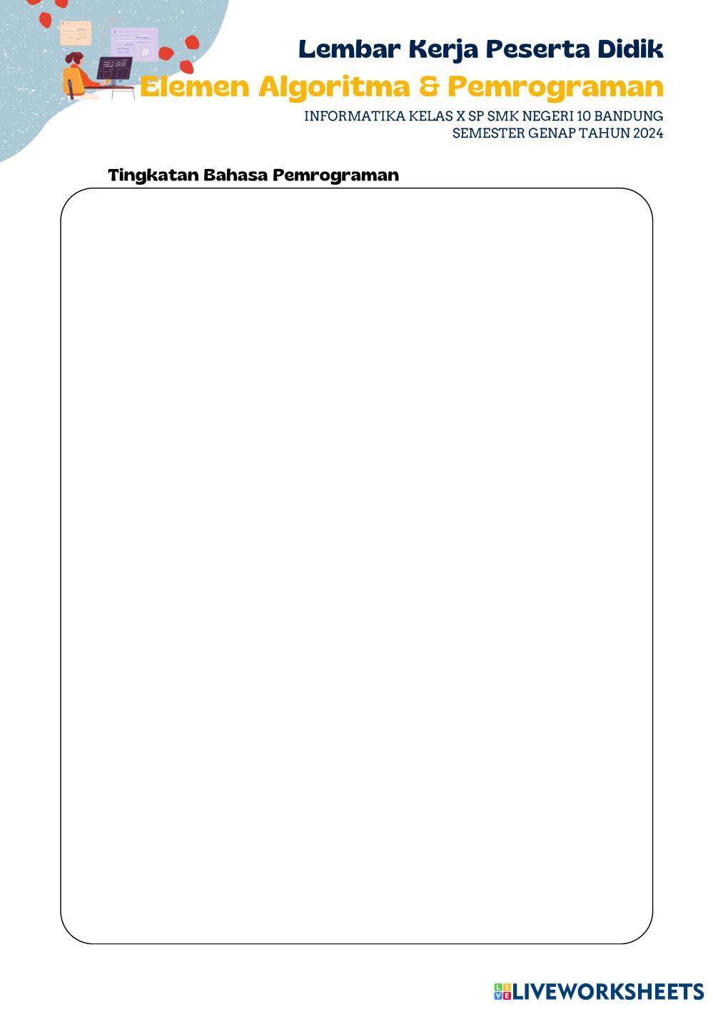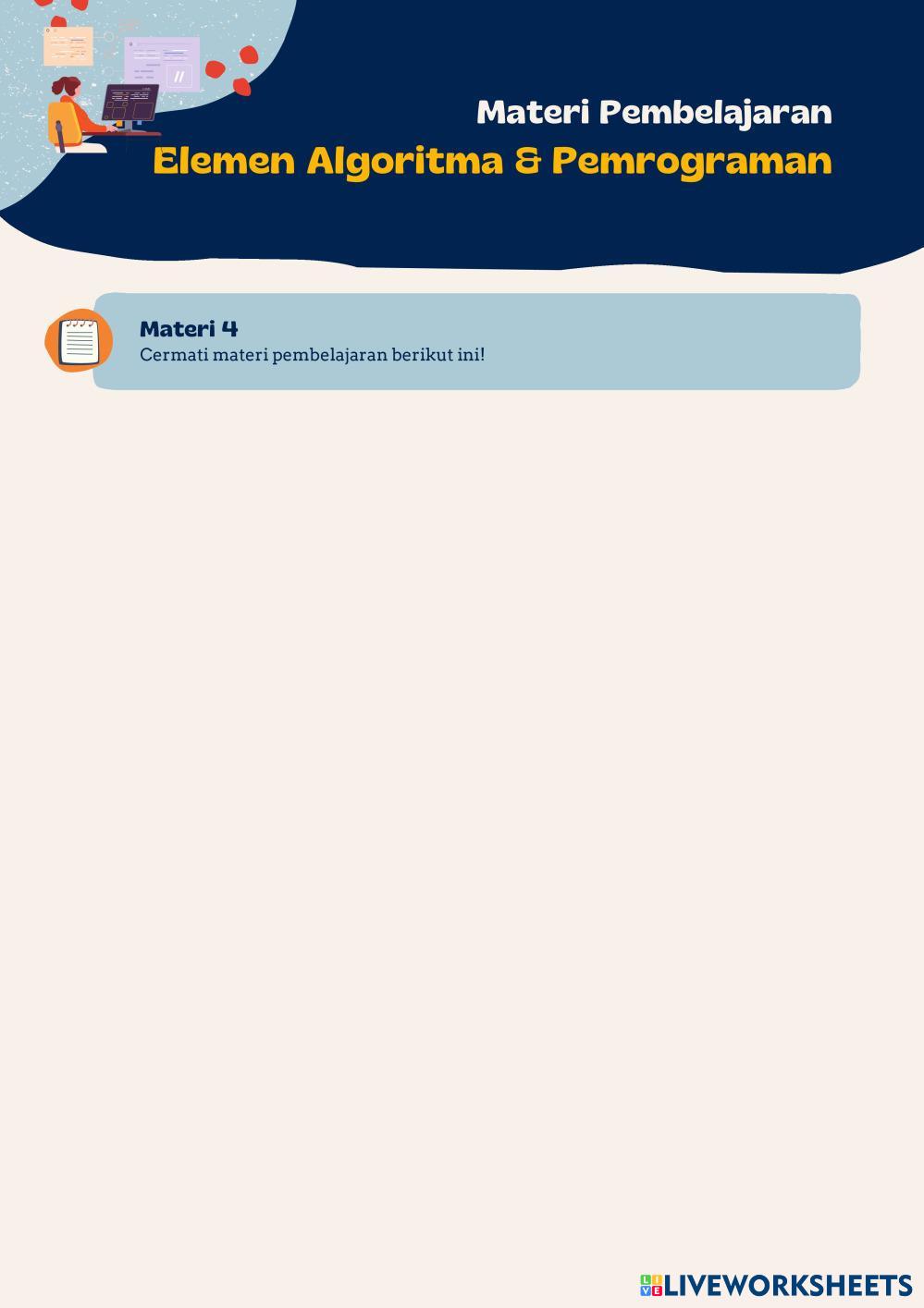 Konsep-konsep dasar algoritma, Karakteristik algoritma mencakup kejelasan, kebersihan, dan efisiensi dalam menyusun langkah-langkah pemecahan masalah, menjadi panduan utama dalam merancang dan mengeksekusi instruksi program. Materi pemrograman melibatkan pemahaman tentang bahasa pemrograman, generasi bahasa pemrograman, tingkatan bahasa pemrograman, dan proses pembuatan program