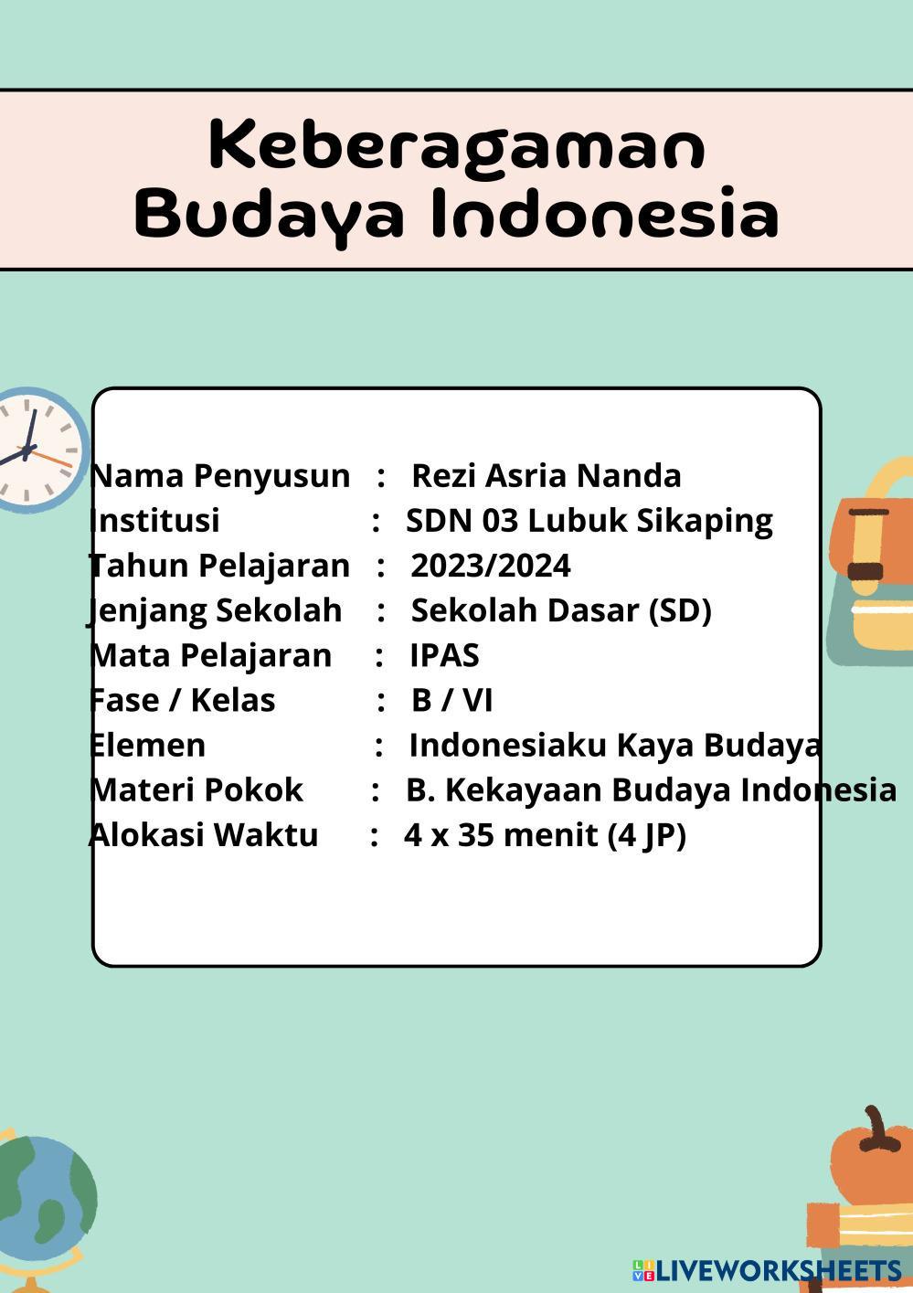 Created bycantiikkk IPAS Kekayaan Budaya Indonesia Age 10-14 level: 4 Indonesian Author's Instructions My Google Classroom Courses × 0 classes selected (0 students total) Quick Access Select all classes (0 classes) All Classes Loading courses... Cancel Share Share to selected Course __COURSE_NAME__ __STUDENT_NAME__ (__STUDENT_EMAIL__) Lembar Kerja Peserta Didik (LKPD) Keberagaman Budaya Indonesia Kelas IV SD Download Worksheet Validation Check my answers Emails my answers to my teacher Full name Group/level School subject Teacher's email or key code Close Submit Validating worksheet... (12) Your answers have been sent to your teacher. Good luck! OK We encountered an error submitting your answers. Please try again. OK Advertisement | Go Ad Free Created bycantiikkk IPAS Kekayaan Budaya Indonesia Age 10-14 level: 4 Indonesian Author's Instructions