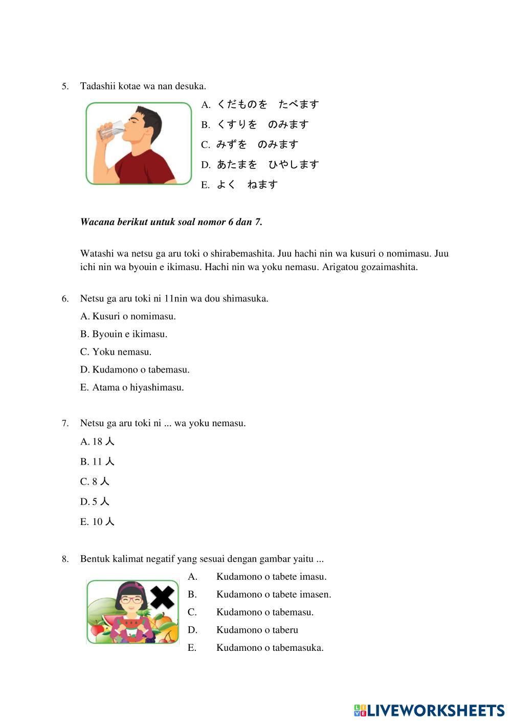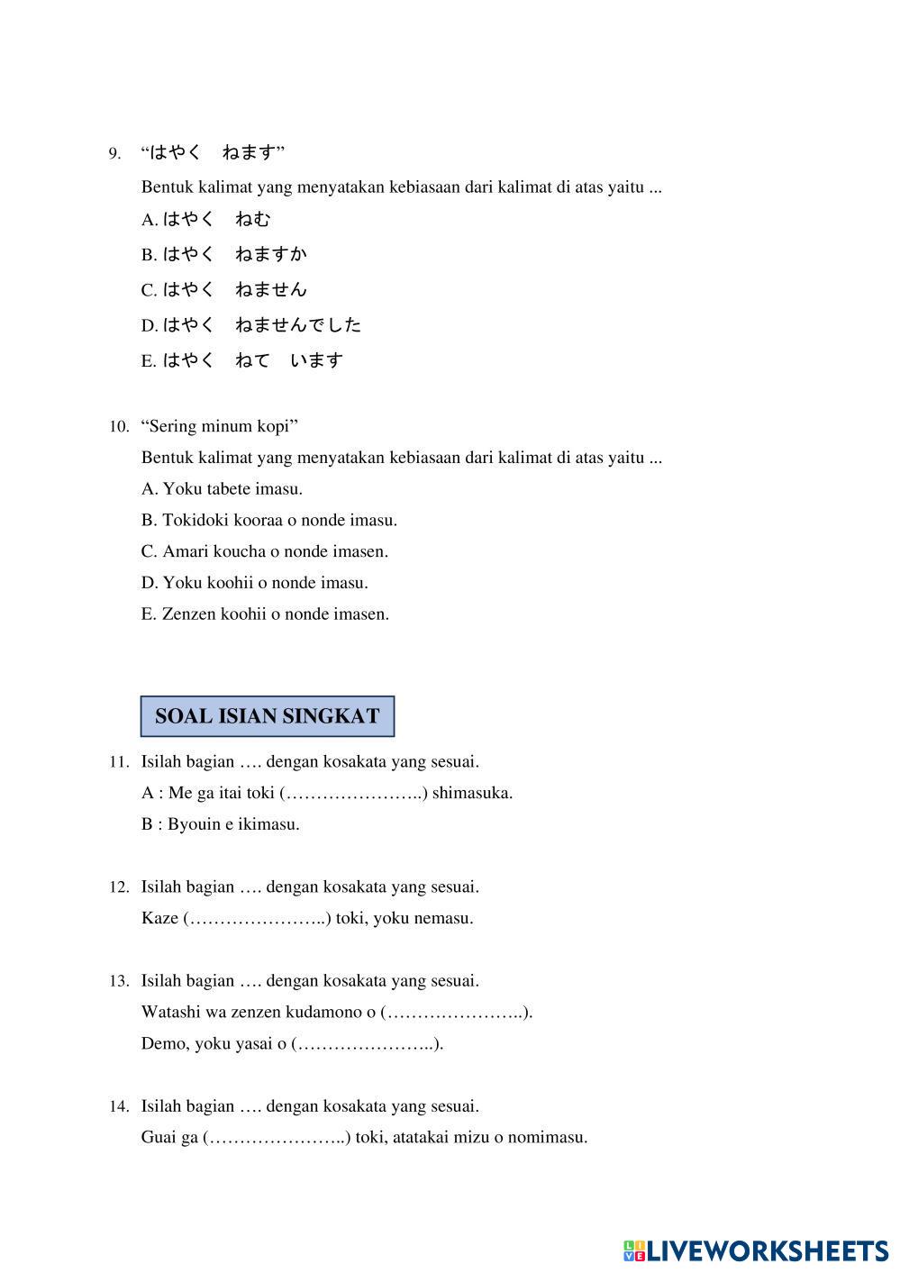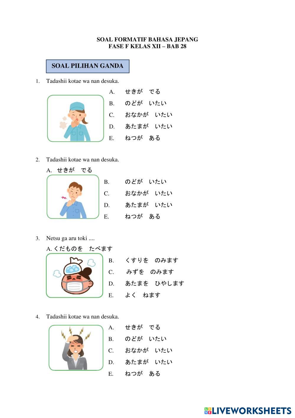 Created by kadeklusiaandary Japanese BAB 28 Age 14+ level: 12 Indonesian Author's Instructions My Google Classroom Courses × 0 classes selected (0 students total) Quick Access Select all classes (0 classes) All Classes Loading courses... Cancel Share Share to selected Course __COURSE_NAME__ __STUDENT_NAME__ (__STUDENT_EMAIL__) SOAL FORMATIF FASE F KELAS XII - BAB 28 Download Worksheet Validation Check my answers Emails my answers to my teacher Full name Group/level School subject Teacher's email or key code Close Submit Validating worksheet... (12) Your answers have been sent to your teacher. Good luck! OK We encountered an error submitting your answers. Please try again. OK Advertisement | Go Ad Free Created by kadeklusiaandary Japanese BAB 28 Age 14+ level: 12 Indonesian Author's Instructions