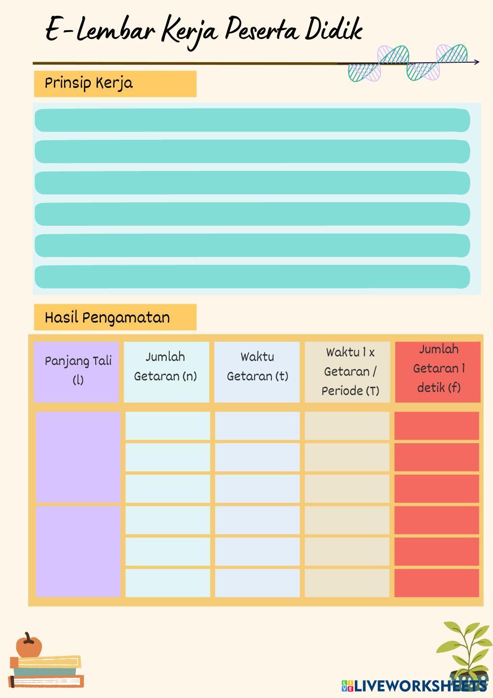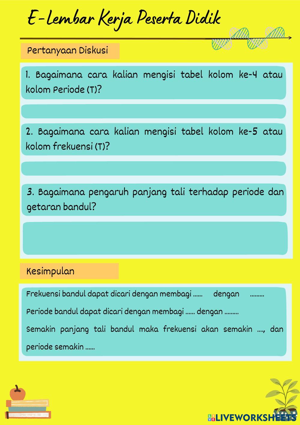 Created byImam Setiawan Kelas 8 SMP Negeri 3 Ambarawa frekuensi dan periode bandul Age 10+ level: 8 Indonesian Author's Instructions LKPD Getaran My Google Classroom Courses × 0 classes selected (0 students total) Quick Access Select all classes (0 classes) All Classes Loading courses... Cancel Share Share to selected Course __COURSE_NAME__ __STUDENT_NAME__ (__STUDENT_EMAIL__) LKPD Getaran Download Worksheet Validation Check my answers Emails my answers to my teacher Full name Group/level School subject Teacher's email or key code Close Submit Validating worksheet... (12) Your answers have been sent to your teacher. Good luck! OK We encountered an error submitting your answers. Please try again. OK Advertisement | Go Ad Free Created byImam Setiawan Kelas 8 SMP Negeri 3 Ambarawa frekuensi dan periode bandul Age 10+ level: 8 Indonesian Author's Instructions LKPD Getaran