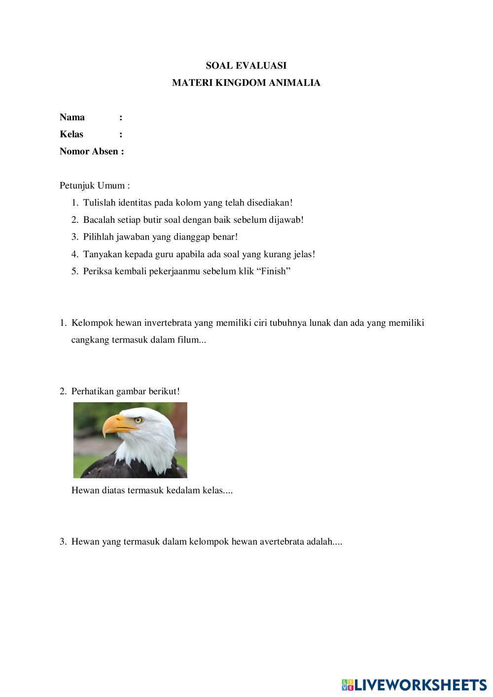 Created byMELDA FA'O KINGDOM ANIMALIA Post Test Age 11-18 level: VII E Indonesian Author's Instructions My Google Classroom Courses × 0 classes selected (0 students total) Quick Access Select all classes (0 classes) All Classes Loading courses... Cancel Share Share to selected Course __COURSE_NAME__ __STUDENT_NAME__ (__STUDENT_EMAIL__) Evaluasi Akhir Pembelajaran Download Worksheet Validation Check my answers Emails my answers to my teacher Full name Group/level School subject Teacher's email or key code Close Submit Validating worksheet... (12) Your answers have been sent to your teacher. Good luck! OK We encountered an error submitting your answers. Please try again. OK Advertisement | Go Ad Free Created byMELDA FA'O KINGDOM ANIMALIA Post Test Age 11-18 level: VII E Indonesian Author's Instructions
