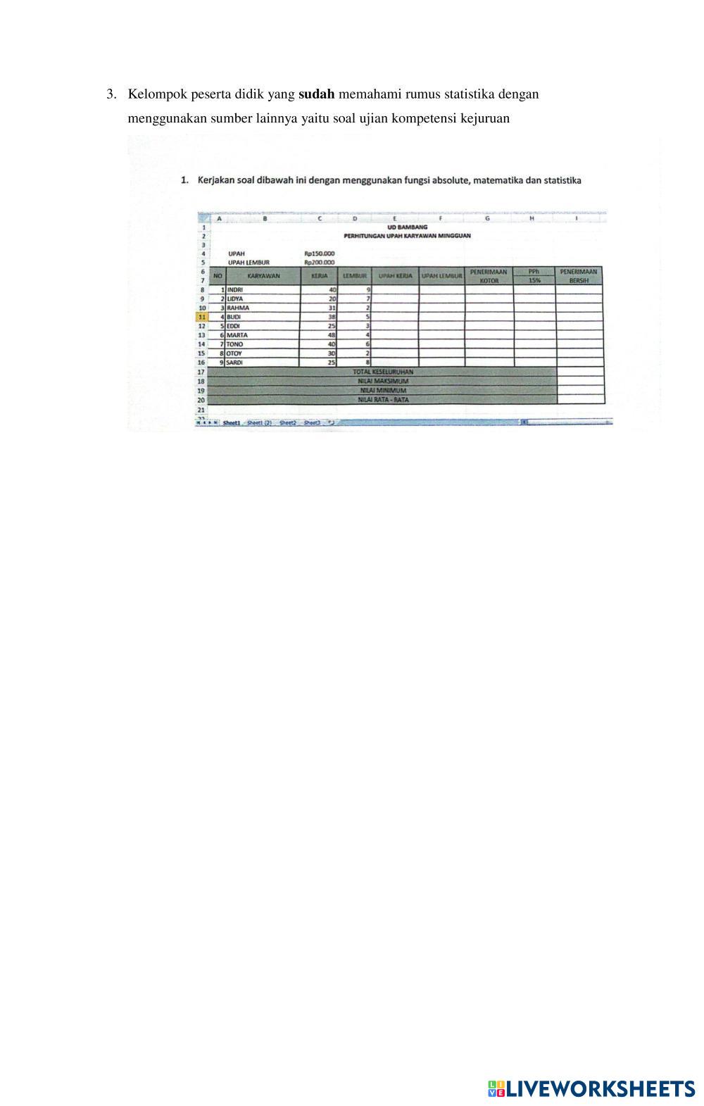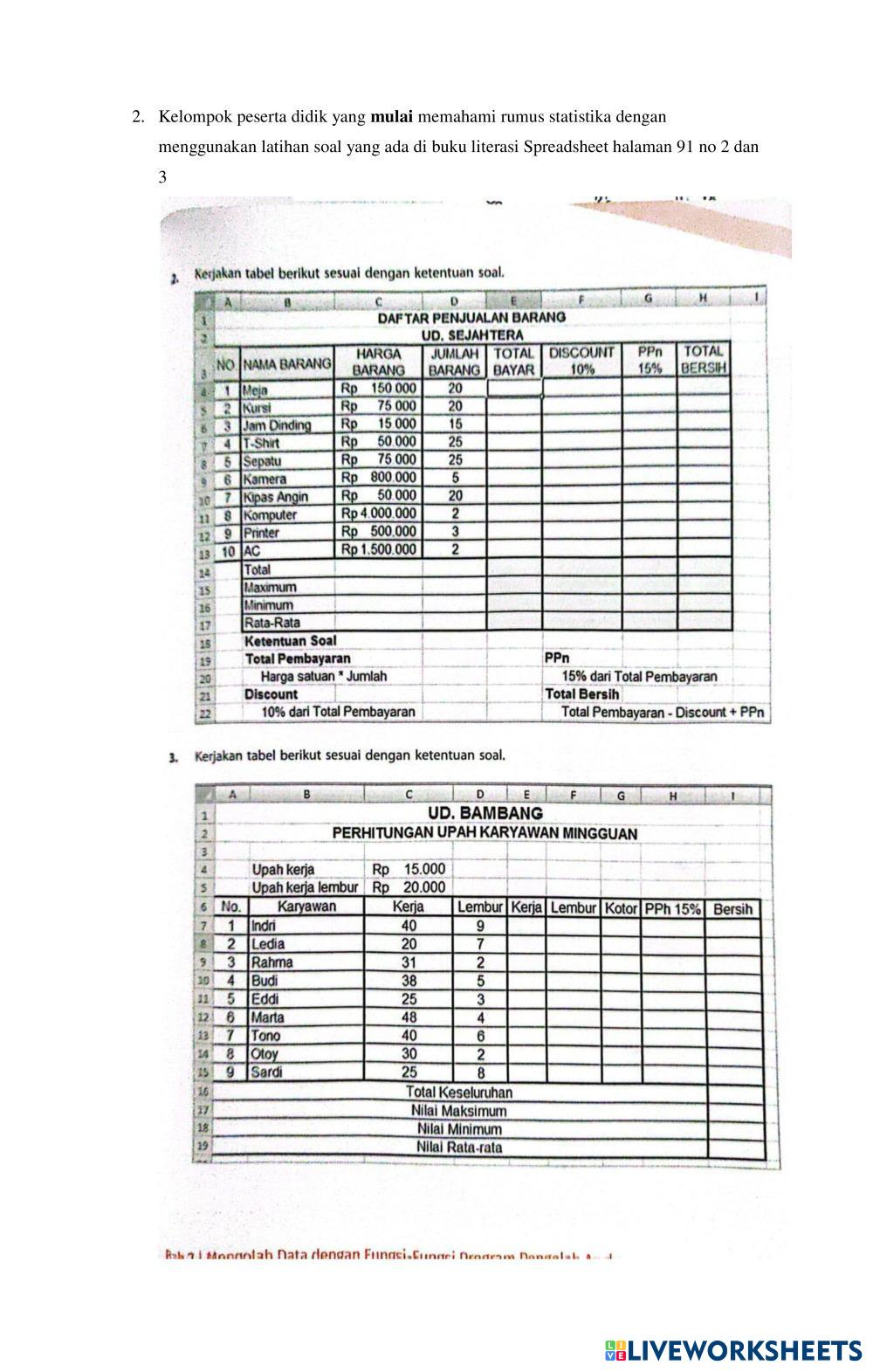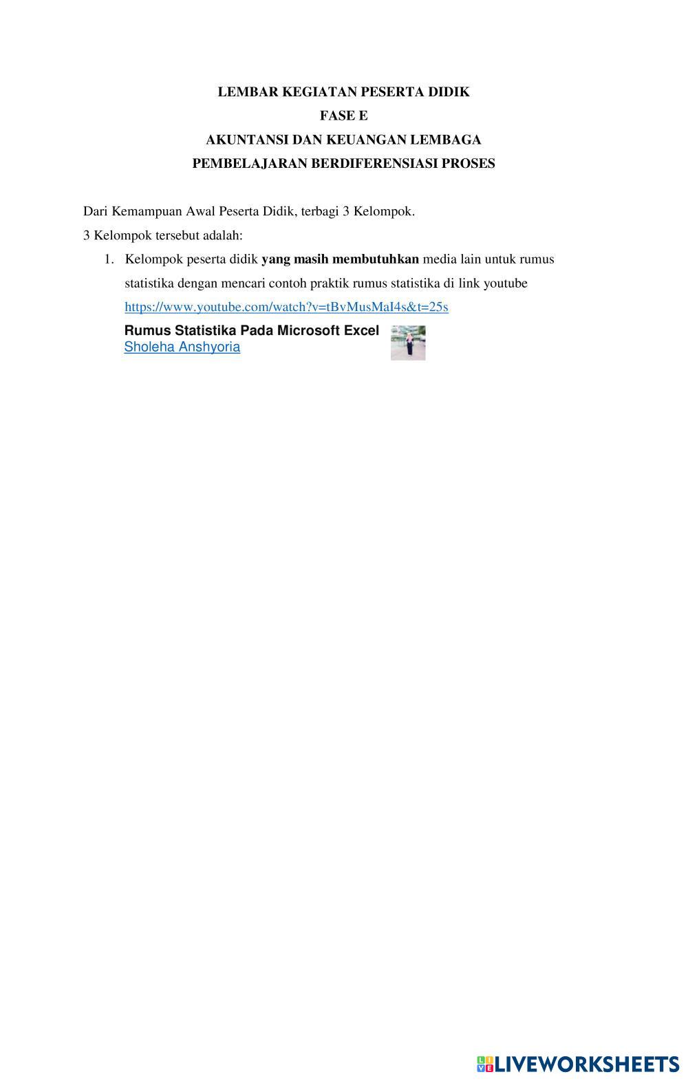 Created byagustina mardika rini kOMPUTER RUMUS Age 15+ level: 10 Indonesian Author's Instructions RUMUS STATISTIKA My Google Classroom Courses × 0 classes selected (0 students total) Quick Access Select all classes (0 classes) All Classes Loading courses... Cancel Share Share to selected Course __COURSE_NAME__ __STUDENT_NAME__ (__STUDENT_EMAIL__) LKPD-STATISTIKA-FASE-E Download Worksheet Validation Check my answers Emails my answers to my teacher Full name Group/level School subject Teacher's email or key code Close Submit Validating worksheet... (12) Your answers have been sent to your teacher. Good luck! OK We encountered an error submitting your answers. Please try again. OK Advertisement | Go Ad Free Created byagustina mardika rini kOMPUTER RUMUS Age 15+ level: 10 Indonesian Author's Instructions RUMUS STATISTIKA