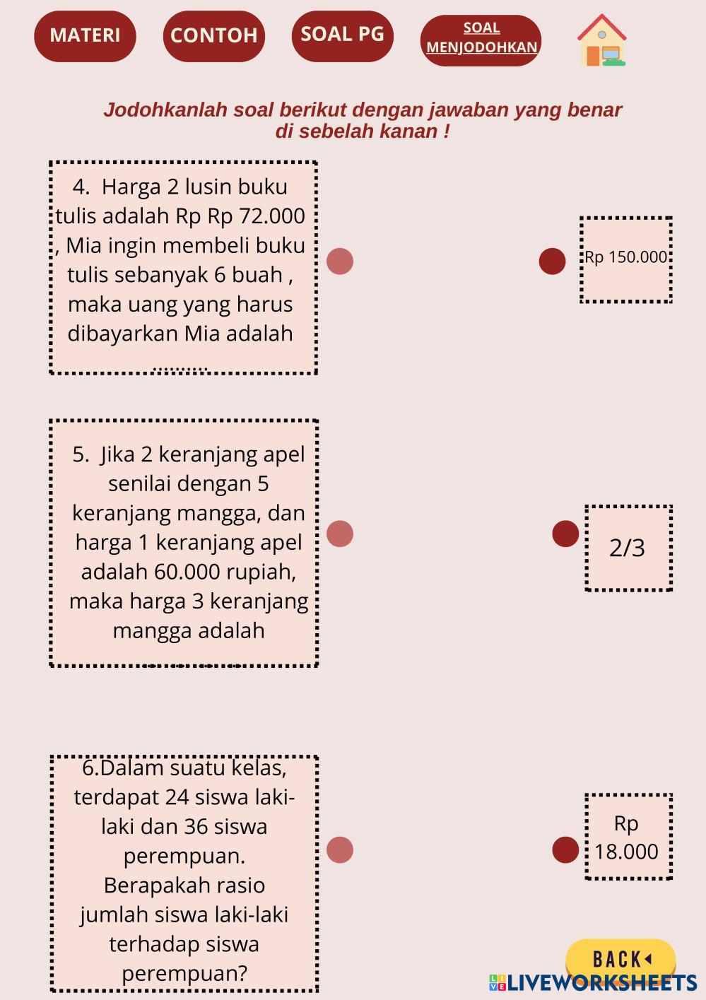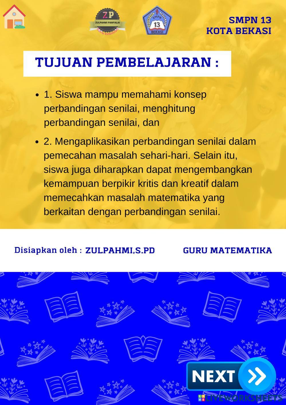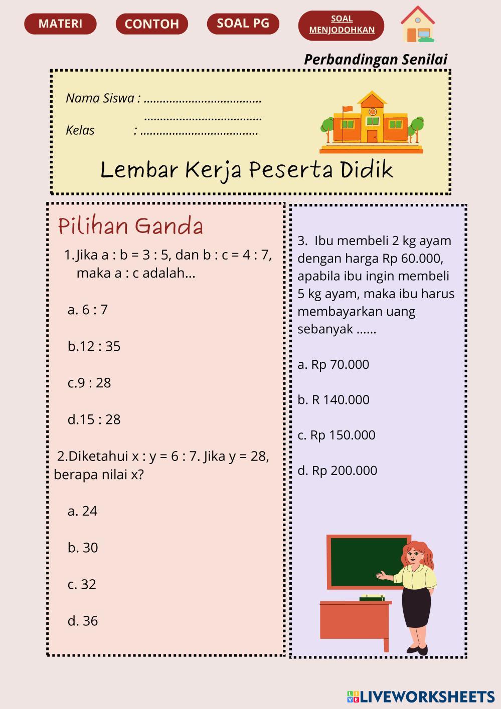Created byZulpahmi caniago Konsep Perbandingan Senilai MATEMATIKA SMP Age 13+ level: SMP Indonesian Author's Instructions My Google Classroom Courses × 0 classes selected (0 students total) Quick Access Select all classes (0 classes) All Classes Loading courses... Cancel Share Share to selected Course __COURSE_NAME__ __STUDENT_NAME__ (__STUDENT_EMAIL__) PERBANDINGAN SENILAI MATEMATIKA KELAS 7 Download Worksheet Validation Check my answers Emails my answers to my teacher Full name Group/level School subject Teacher's email or key code Close Submit Validating worksheet... (12) Your answers have been sent to your teacher. Good luck! OK We encountered an error submitting your answers. Please try again. OK Advertisement | Go Ad Free Created byZulpahmi caniago Konsep Perbandingan Senilai MATEMATIKA SMP Age 13+ level: SMP Indonesian Author's Instructions