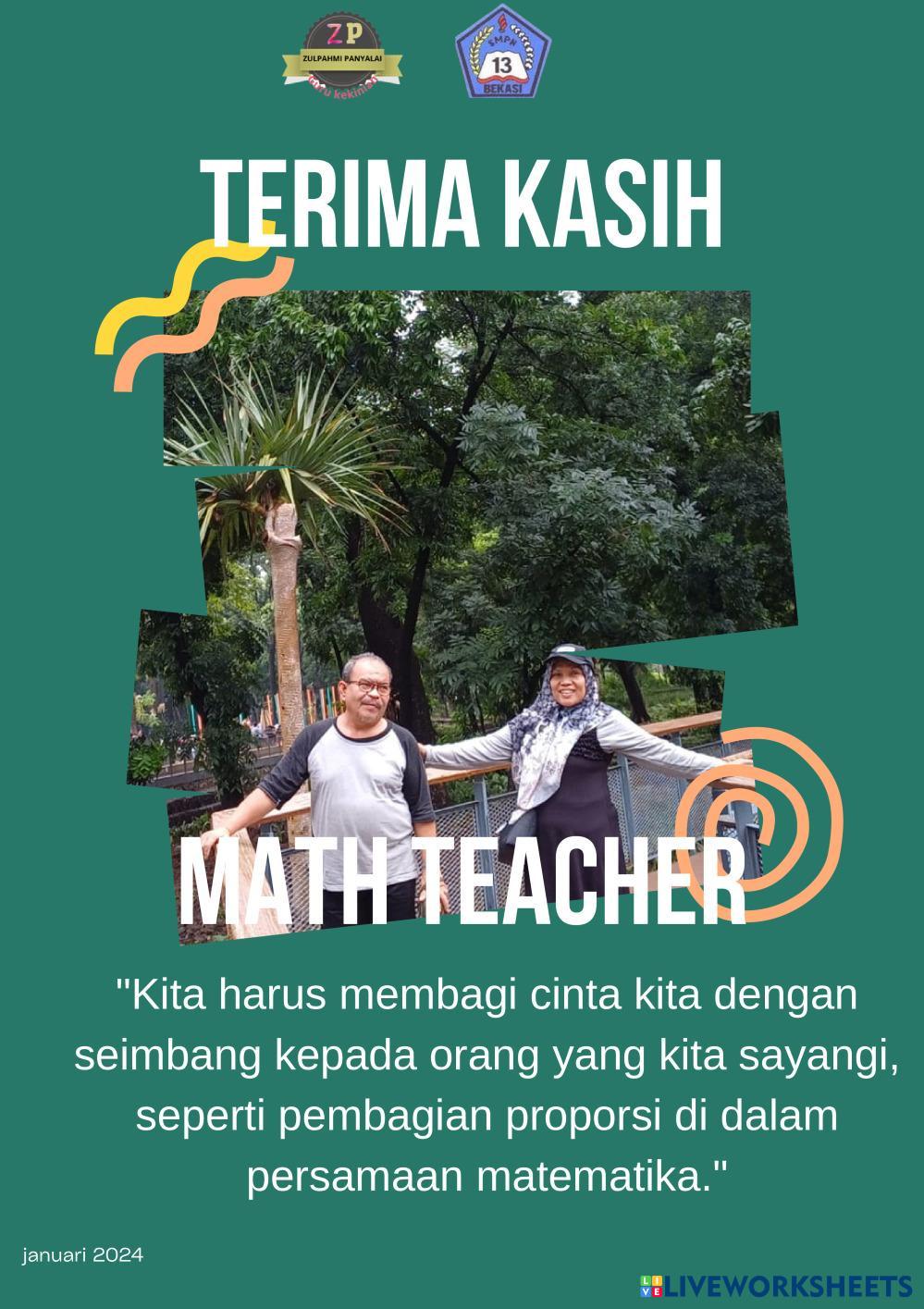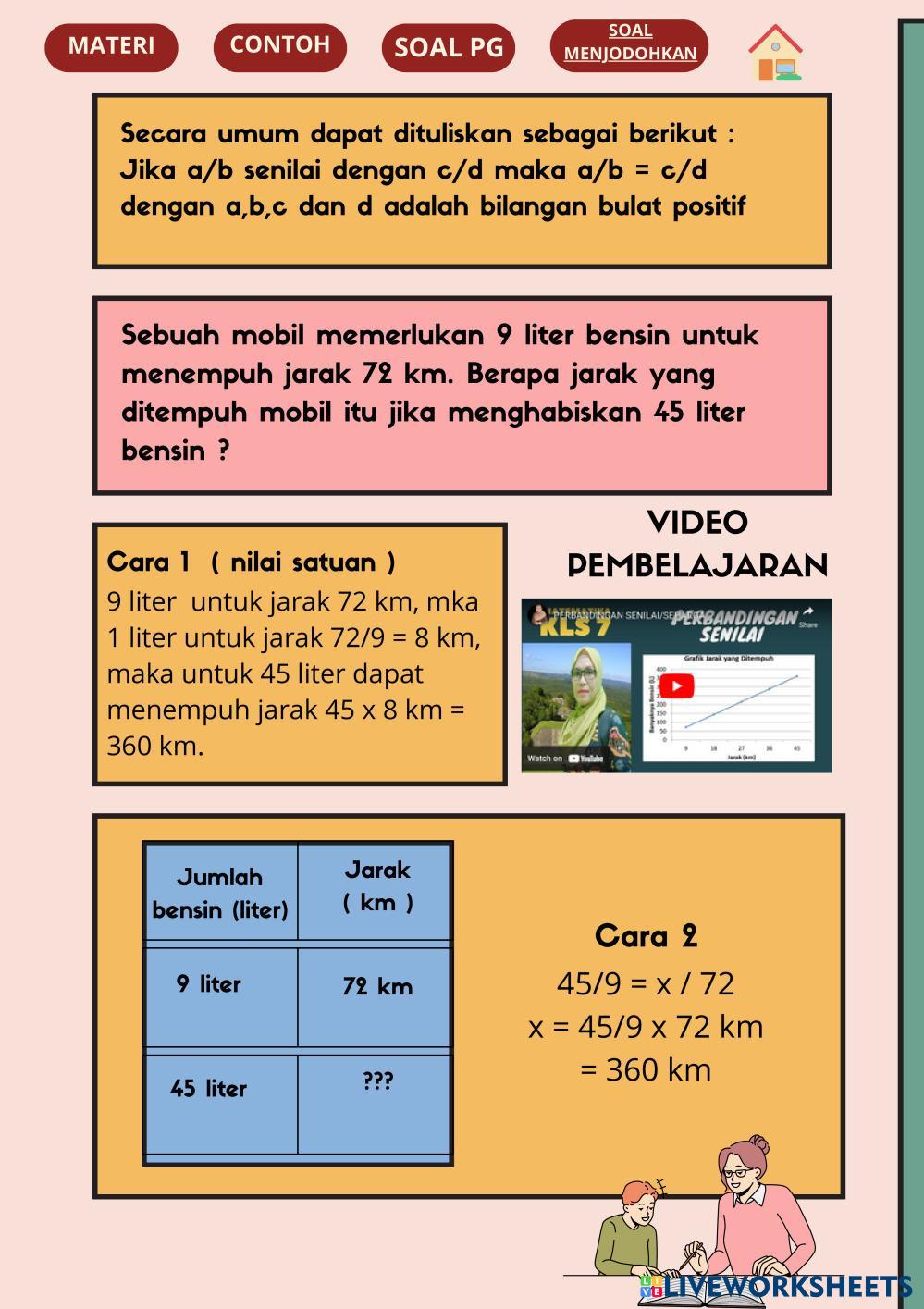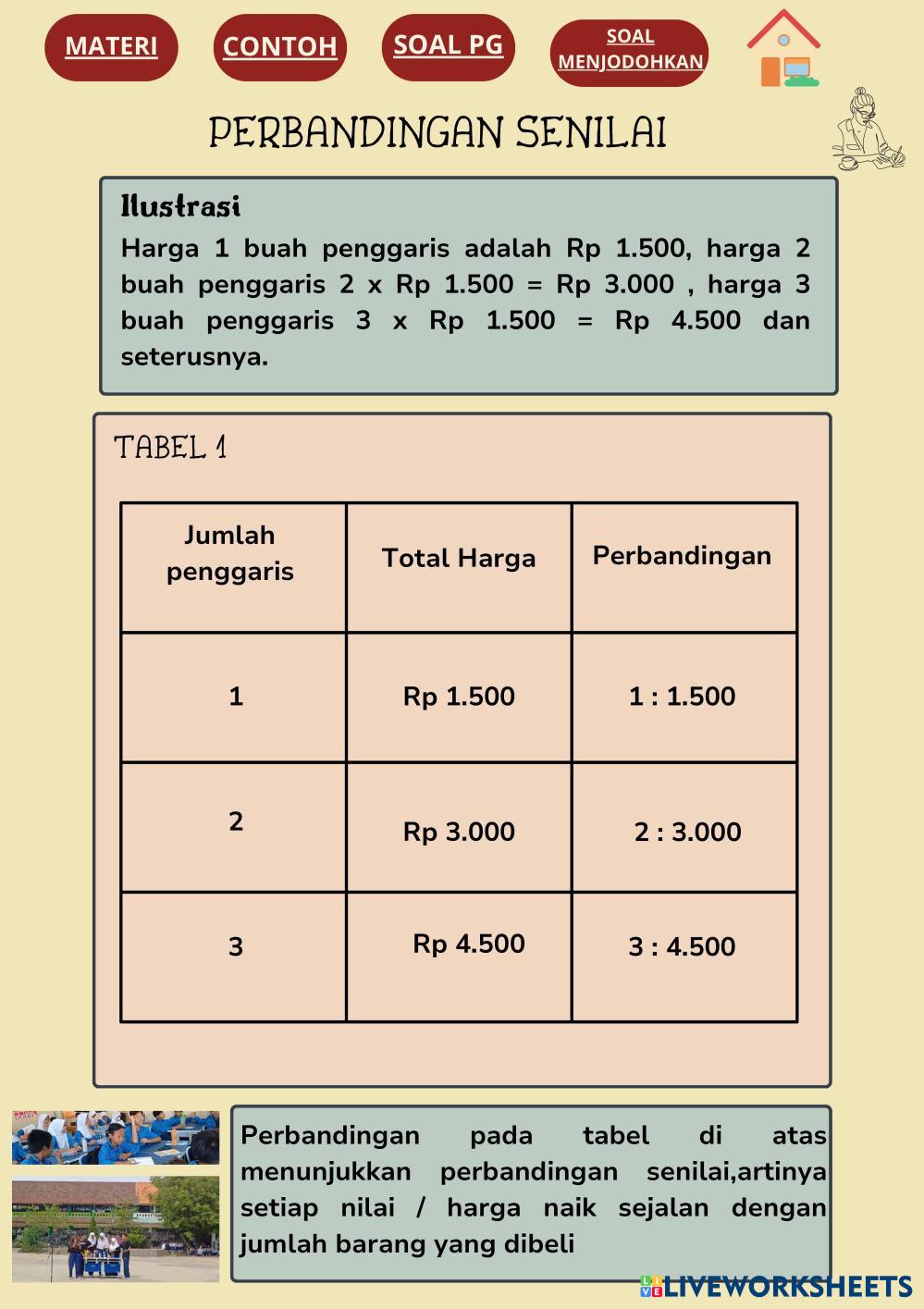 Created byZulpahmi caniago Konsep Perbandingan Senilai MATEMATIKA SMP Age 13+ level: SMP Indonesian Author's Instructions My Google Classroom Courses × 0 classes selected (0 students total) Quick Access Select all classes (0 classes) All Classes Loading courses... Cancel Share Share to selected Course __COURSE_NAME__ __STUDENT_NAME__ (__STUDENT_EMAIL__) PERBANDINGAN SENILAI MATEMATIKA KELAS 7 Download Worksheet Validation Check my answers Emails my answers to my teacher Full name Group/level School subject Teacher's email or key code Close Submit Validating worksheet... (12) Your answers have been sent to your teacher. Good luck! OK We encountered an error submitting your answers. Please try again. OK Advertisement | Go Ad Free Created byZulpahmi caniago Konsep Perbandingan Senilai MATEMATIKA SMP Age 13+ level: SMP Indonesian Author's Instructions