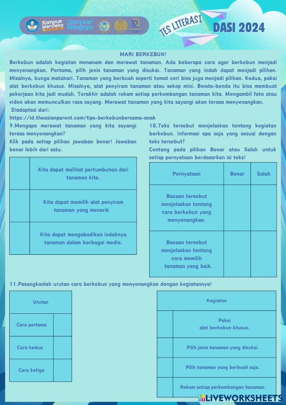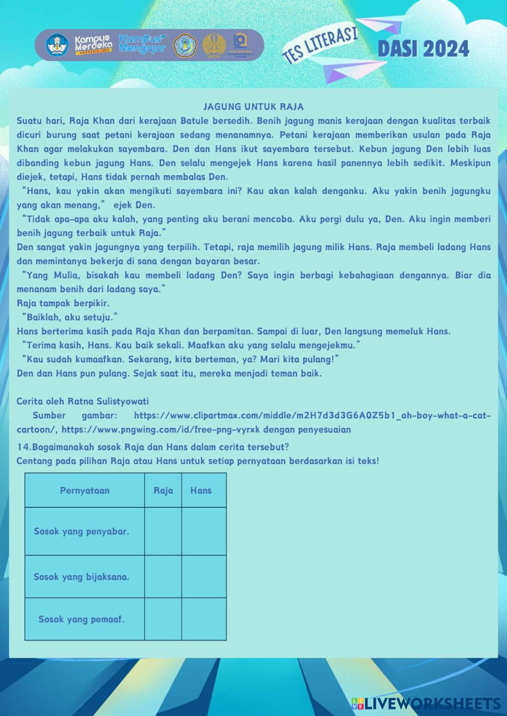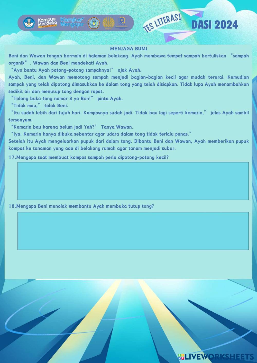 Created byRatri Cahyaning Asri Literasi Literasi Age 10-15 level: 4-6 Indonesian Author's Instructions My Google Classroom Courses × 0 classes selected (0 students total) Quick Access Select all classes (0 classes) All Classes Loading courses... Cancel Share Share to selected Course __COURSE_NAME__ __STUDENT_NAME__ (__STUDENT_EMAIL__) TES LITERASI DASI 2024 Download Worksheet Validation Check my answers Emails my answers to my teacher Full name Group/level School subject Teacher's email or key code Close Submit Validating worksheet... (12) Your answers have been sent to your teacher. Good luck! OK We encountered an error submitting your answers. Please try again. OK Advertisement | Go Ad Free Created byRatri Cahyaning Asri Literasi Literasi Age 10-15 level: 4-6 Indonesian Author's Instructions