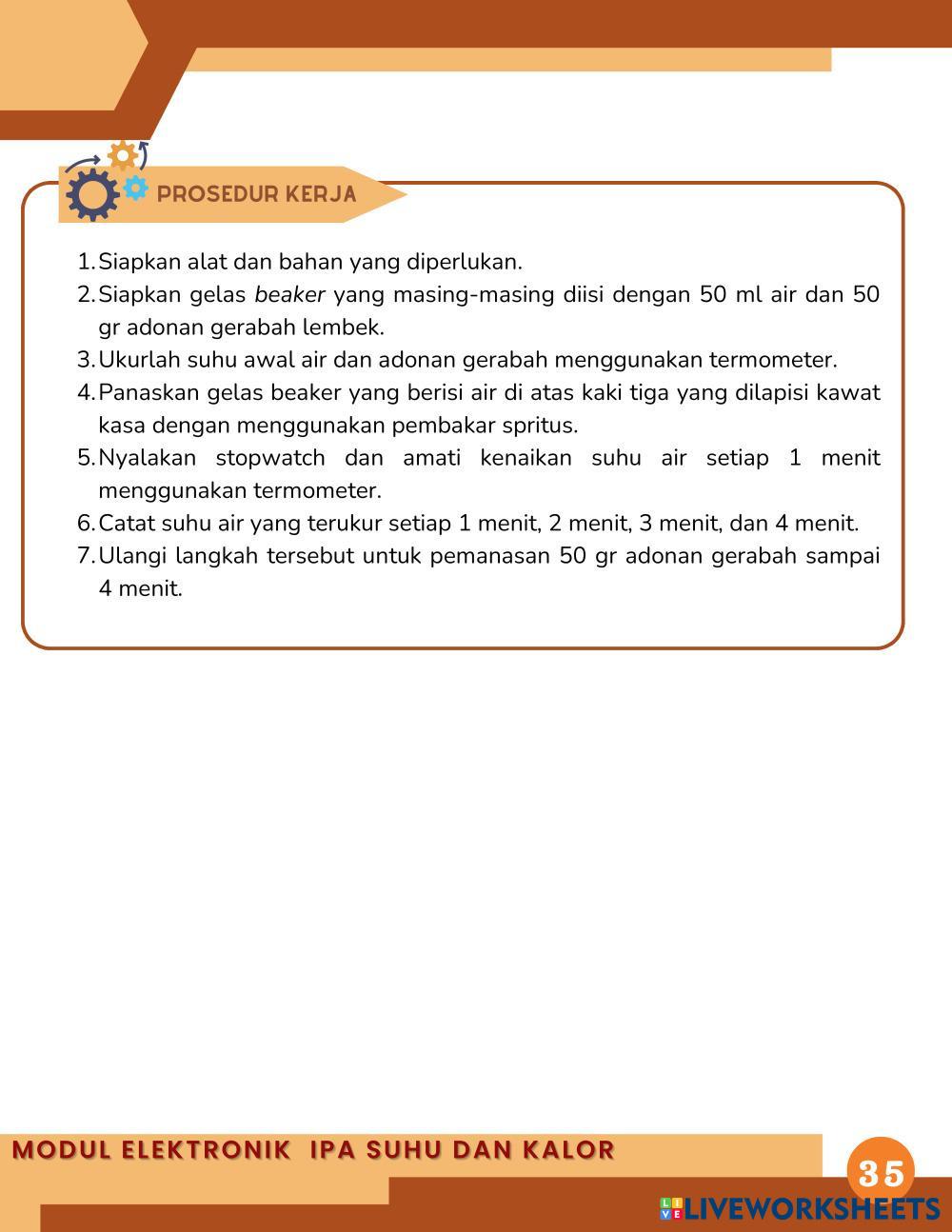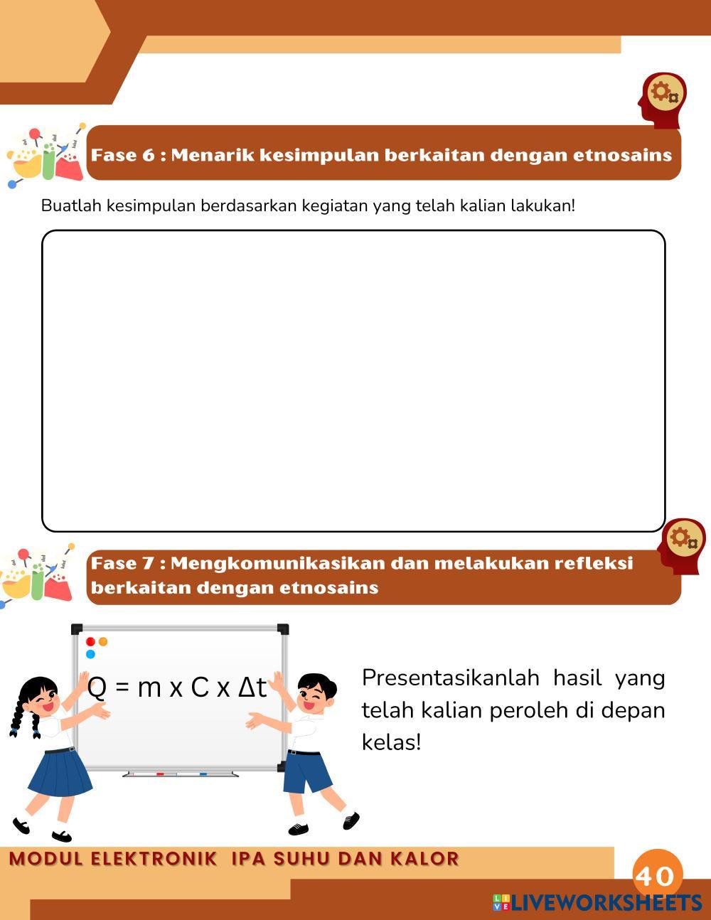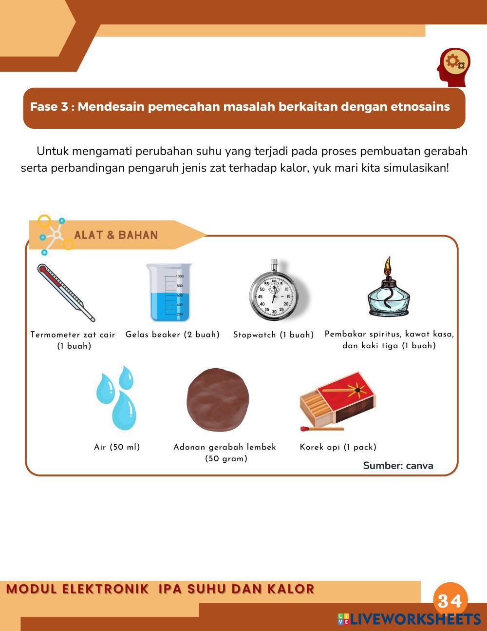 Tujuan Pembelajaran yaitu peserta didik dapat menganalisis hubungan kalor dengan suhu suatu zat yang berkaitan dengan etnosains pada pembuatan gerabah serta peserta didik dapat menjelaskan pengaruh jenis zat terhadap kalor yang berkaitan dengan etnosains pada pembuatan gerabah.