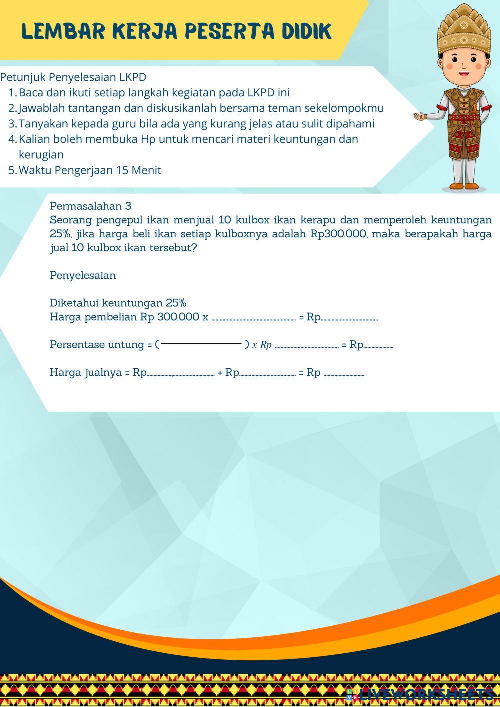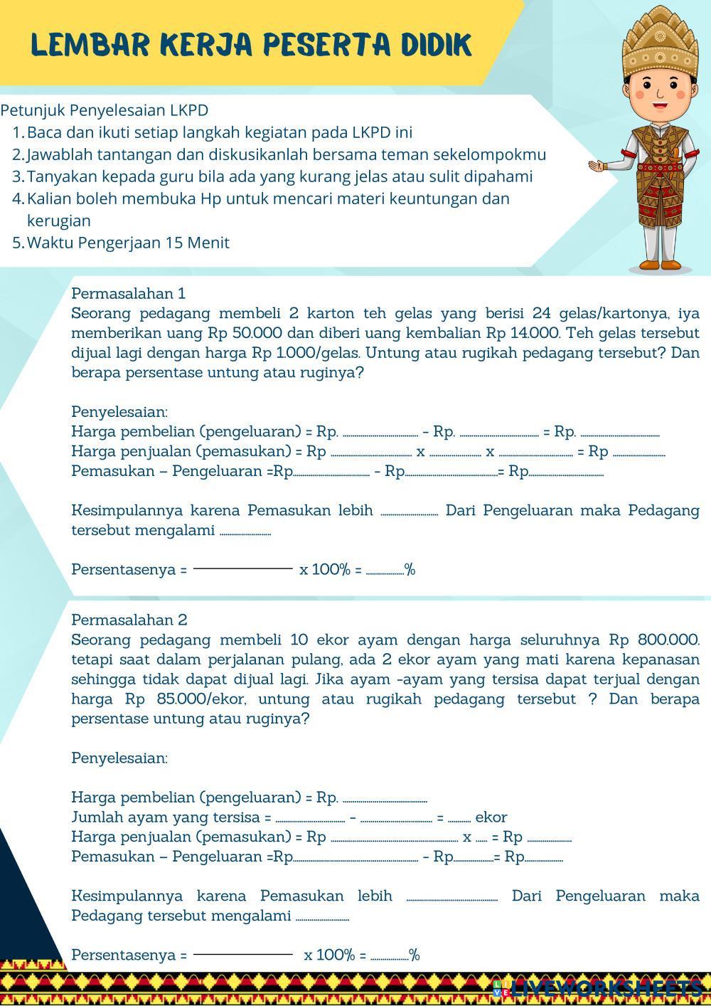 Created byMuhamad Ghufron LKPD Aritmatika Sosial Aritmatika Sosial Age 12-16 level: 7 Indonesian Author's Instructions My Google Classroom Courses × 0 classes selected (0 students total) Quick Access Select all classes (0 classes) All Classes Loading courses... Cancel Share Share to selected Course __COURSE_NAME__ __STUDENT_NAME__ (__STUDENT_EMAIL__) Matematika Download Worksheet Validation Check my answers Emails my answers to my teacher Full name Group/level School subject Teacher's email or key code Close Submit Validating worksheet... (12) Your answers have been sent to your teacher. Good luck! OK We encountered an error submitting your answers. Please try again. OK Advertisement | Go Ad Free Created byMuhamad Ghufron LKPD Aritmatika Sosial Aritmatika Sosial Age 12-16 level: 7 Indonesian Author's Instructions
