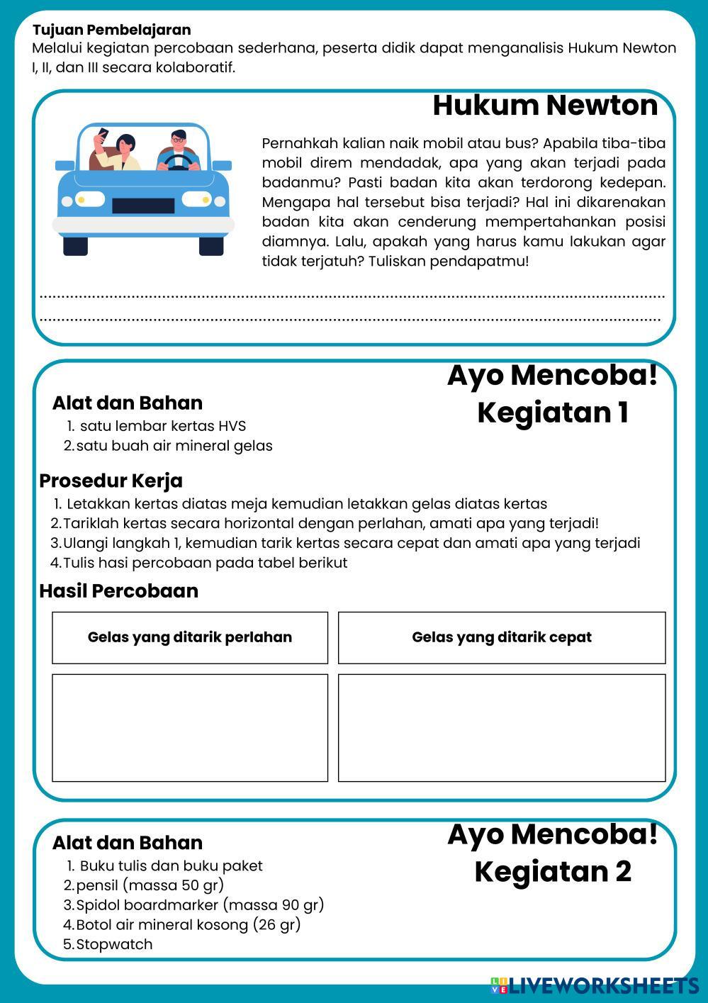 Created bynajwa LKPD IPA kelas 7 Materi Sub bab Hukum Newton Age 12-18 level: 2 Indonesian Author's Instructions My Google Classroom Courses × 0 classes selected (0 students total) Quick Access Select all classes (0 classes) All Classes Loading courses... Cancel Share Share to selected Course __COURSE_NAME__ __STUDENT_NAME__ (__STUDENT_EMAIL__) najwa Download Worksheet Validation Check my answers Emails my answers to my teacher Full name Group/level School subject Teacher's email or key code Close Submit Validating worksheet... (12) Your answers have been sent to your teacher. Good luck! OK We encountered an error submitting your answers. Please try again. OK Advertisement | Go Ad Free Created bynajwa LKPD IPA kelas 7 Materi Sub bab Hukum Newton Age 12-18 level: 2 Indonesian Author's Instructions