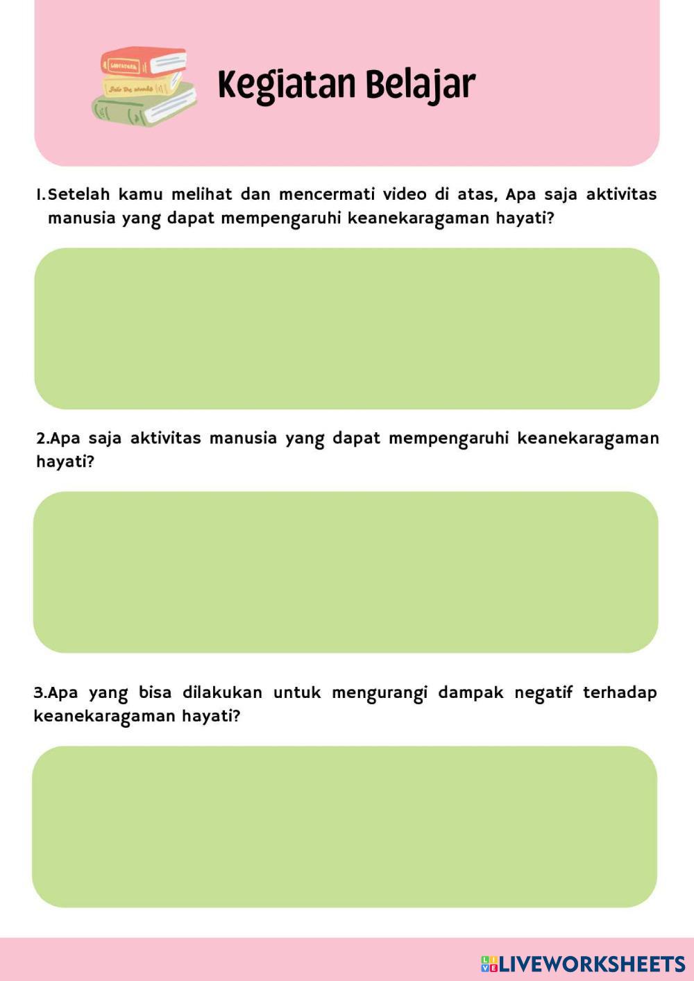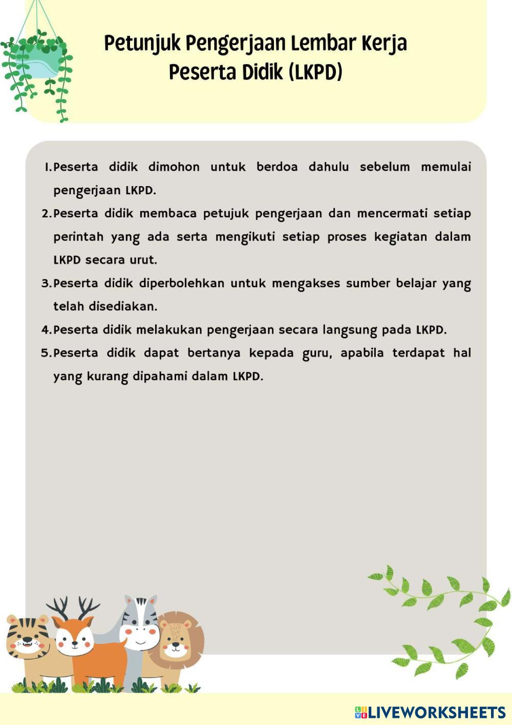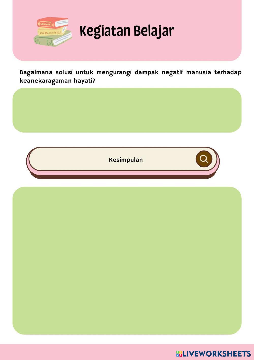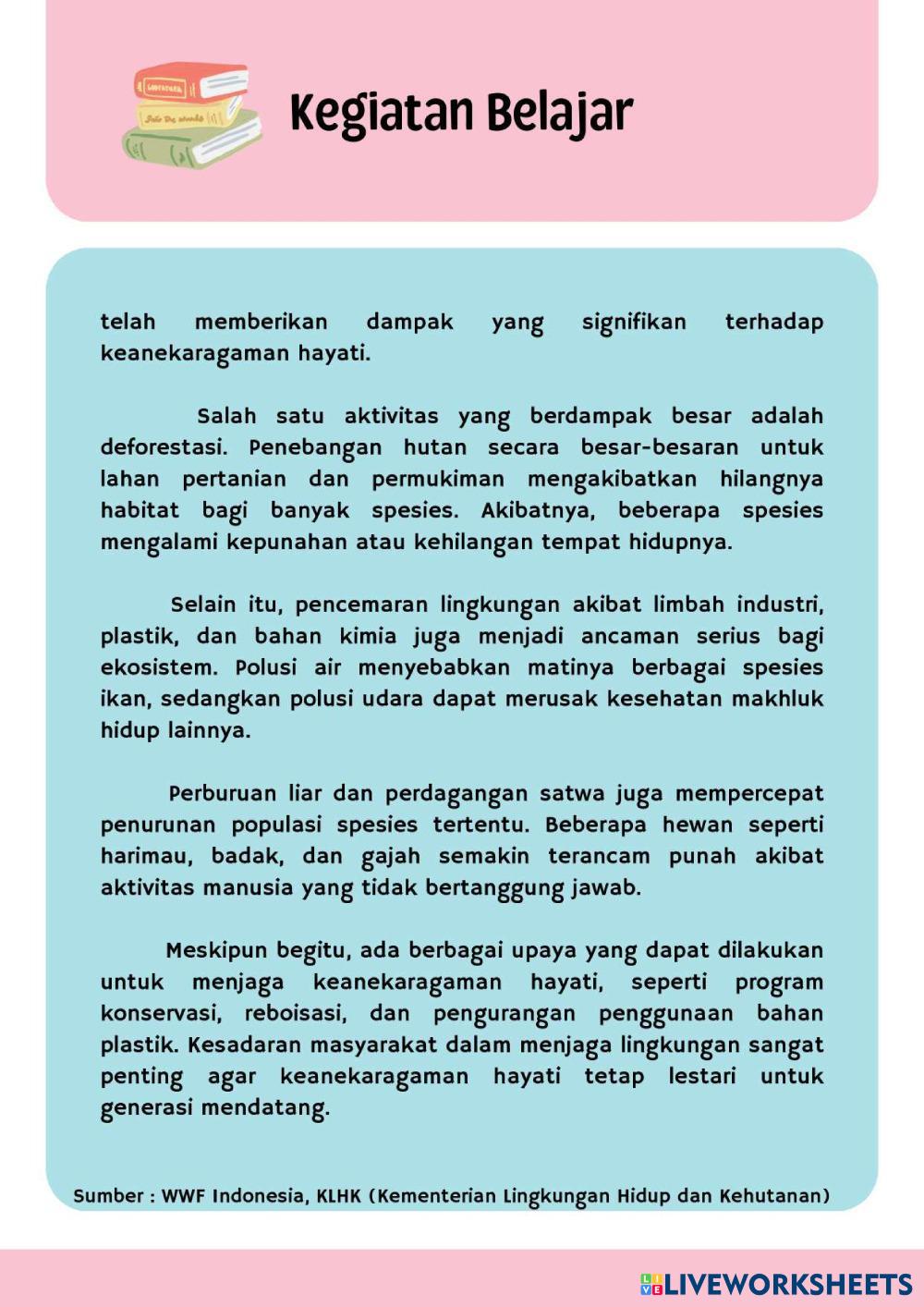 Created byRahmania Aulia Azahra LKPD IPA kelas 7 - Age 7+ level: - Indonesian Author's Instructions My Google Classroom Courses × 0 classes selected (0 students total) Quick Access Select all classes (0 classes) All Classes Loading courses... Cancel Share Share to selected Course __COURSE_NAME__ __STUDENT_NAME__ (__STUDENT_EMAIL__) E-LKPD Keanekaragaman Hayati Download Worksheet Validation Check my answers Emails my answers to my teacher Full name Group/level School subject Teacher's email or key code Close Submit Validating worksheet... (12) Your answers have been sent to your teacher. Good luck! OK We encountered an error submitting your answers. Please try again. OK Advertisement | Go Ad Free Created byRahmania Aulia Azahra LKPD IPA kelas 7 - Age 7+ level: - Indonesian Author's Instructions