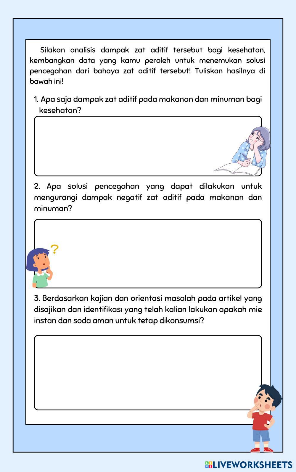 Created byberryzeniey LKPD IPA KELAS 9 lkpd ipa zat aditif Age 12-18 level: 8 Indonesian Author's Instructions My Google Classroom Courses × 0 classes selected (0 students total) Quick Access Select all classes (0 classes) All Classes Loading courses... Cancel Share Share to selected Course __COURSE_NAME__ __STUDENT_NAME__ (__STUDENT_EMAIL__) LKPD PBL ZAT ADITIF Download Worksheet Validation Check my answers Emails my answers to my teacher Full name Group/level School subject Teacher's email or key code Close Submit Validating worksheet... (12) Your answers have been sent to your teacher. Good luck! OK We encountered an error submitting your answers. Please try again. OK Advertisement | Go Ad Free Created byberryzeniey LKPD IPA KELAS 9 lkpd ipa zat aditif Age 12-18 level: 8 Indonesian Author's Instructions