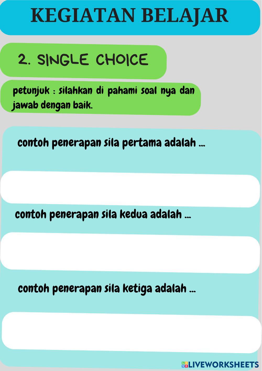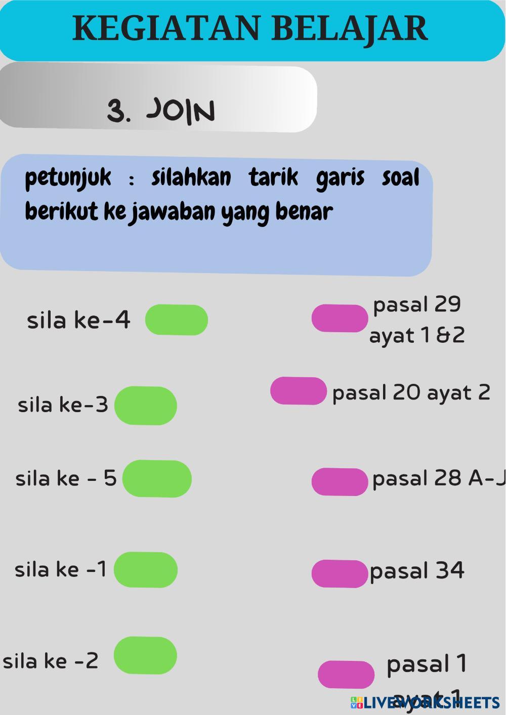 Created byRona Pita Manullang makna dan penerapan nilai - nilai pancasila makna dan penerapan nilai - nilai pancasila Age 11-18 level: fase D Indonesian Author's Instructions My Google Classroom Courses × 0 classes selected (0 students total) Quick Access Select all classes (0 classes) All Classes Loading courses... Cancel Share Share to selected Course __COURSE_NAME__ __STUDENT_NAME__ (__STUDENT_EMAIL__) rona pita manullang Download Worksheet Validation Check my answers Emails my answers to my teacher Full name Group/level School subject Teacher's email or key code Close Submit Validating worksheet... (12) Your answers have been sent to your teacher. Good luck! OK We encountered an error submitting your answers. Please try again. OK Advertisement | Go Ad Free Created byRona Pita Manullang makna dan penerapan nilai - nilai pancasila makna dan penerapan nilai - nilai pancasila Age 11-18 level: fase D Indonesian Author's Instructions