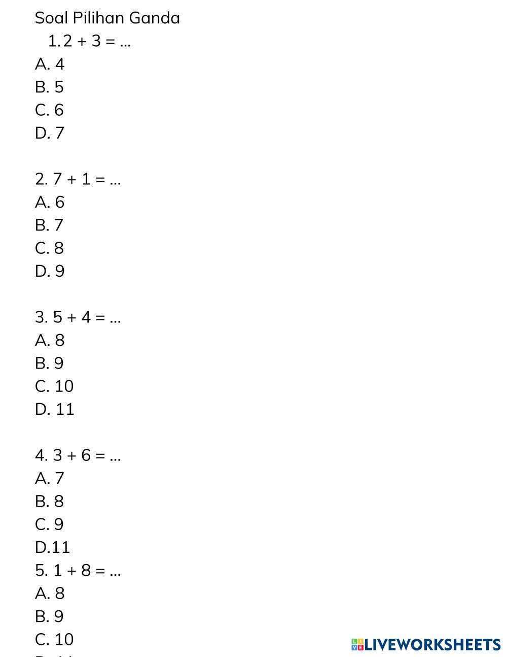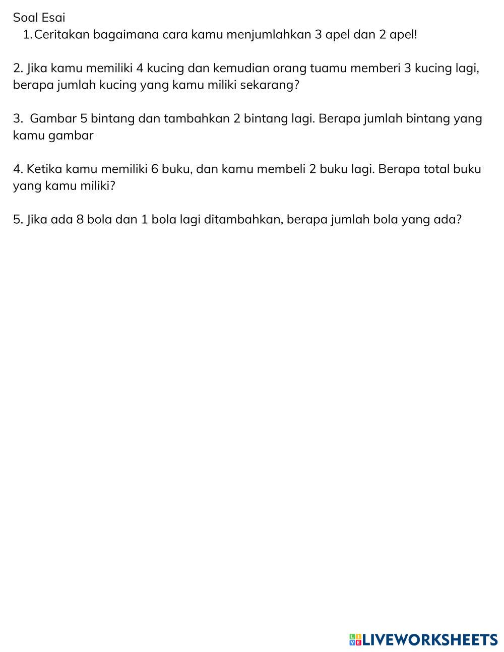 Created byIMAS YULISTIA Matematika Penjumlahan Kelas 1 Matematika Penjumlahan Kelas 1 Age 6-10 level: 1 Indonesian Author's Instructions My Google Classroom Courses × 0 classes selected (0 students total) Quick Access Select all classes (0 classes) All Classes Loading courses... Cancel Share Share to selected Course __COURSE_NAME__ __STUDENT_NAME__ (__STUDENT_EMAIL__) lkpd Download Worksheet Validation Check my answers Emails my answers to my teacher Full name Group/level School subject Teacher's email or key code Close Submit Validating worksheet... (12) Your answers have been sent to your teacher. Good luck! OK We encountered an error submitting your answers. Please try again. OK Advertisement | Go Ad Free Created byIMAS YULISTIA Matematika Penjumlahan Kelas 1 Matematika Penjumlahan Kelas 1 Age 6-10 level: 1 Indonesian Author's Instructions