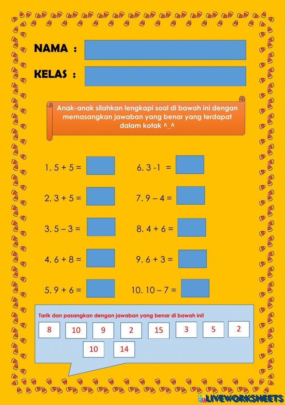 Created byAndri Imam Subekhi MATEMATIKA SD Penjumlahan dan pengurangan bersusun Age 8-12 level: 3 Indonesian Author's Instructions My Google Classroom Courses × 0 classes selected (0 students total) Quick Access Select all classes (0 classes) All Classes Loading courses... Cancel Share Share to selected Course __COURSE_NAME__ __STUDENT_NAME__ (__STUDENT_EMAIL__) PENJUMLAHAN DAN PENGURANGAN Download Worksheet Validation Check my answers Emails my answers to my teacher Full name Group/level School subject Teacher's email or key code Close Submit Validating worksheet... (12) Your answers have been sent to your teacher. Good luck! OK We encountered an error submitting your answers. Please try again. OK Advertisement | Go Ad Free Created byAndri Imam Subekhi MATEMATIKA SD Penjumlahan dan pengurangan bersusun Age 8-12 level: 3 Indonesian Author's Instructions