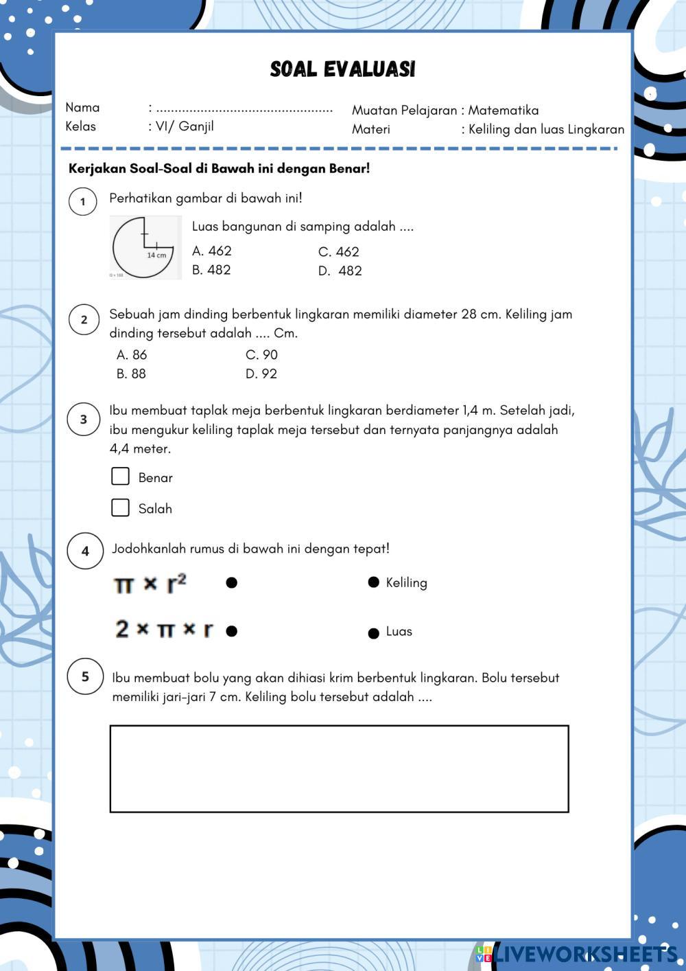 Created byIndah Pressyani Rusman matematika SD LKS Matematika SD Age 11-16 level: 6 Indonesian Author's Instructions Soal evaluasi matematika Lingkaran dengan materi keliling dan luas lingkaran kelas 6 My Google Classroom Courses × 0 classes selected (0 students total) Quick Access Select all classes (0 classes) All Classes Loading courses... Cancel Share Share to selected Course __COURSE_NAME__ __STUDENT_NAME__ (__STUDENT_EMAIL__) Soal Evaluasi keliling dan Luas Lingkaran Download Worksheet Validation Check my answers Emails my answers to my teacher Full name Group/level School subject Teacher's email or key code Close Submit Validating worksheet... (12) Your answers have been sent to your teacher. Good luck! OK We encountered an error submitting your answers. Please try again. OK Advertisement | Go Ad Free Created byIndah Pressyani Rusman matematika SD LKS Matematika SD Age 11-16 level: 6 Indonesian Author's Instructions Soal evaluasi matematika Lingkaran dengan materi keliling dan luas lingkaran kelas 6