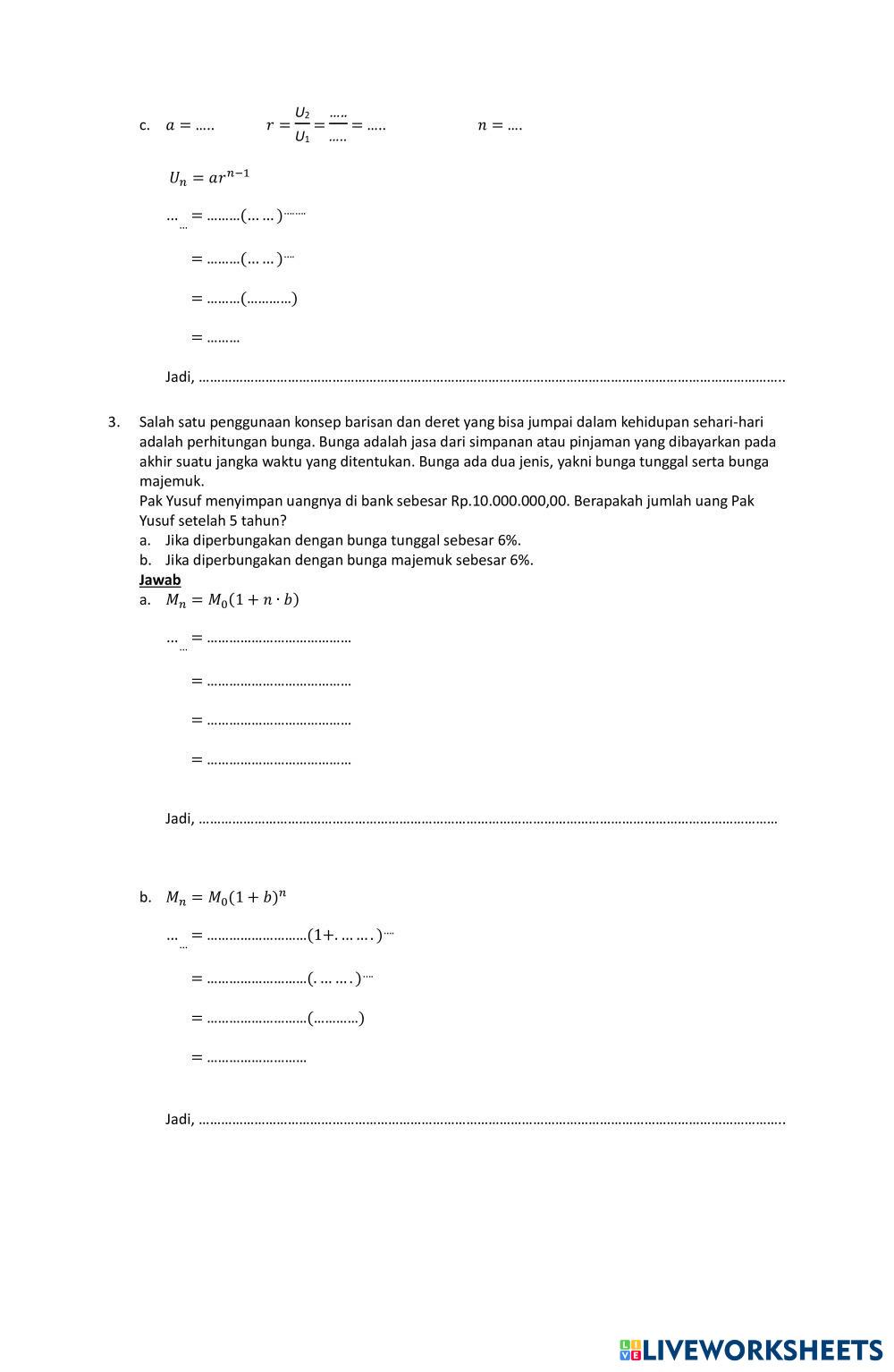 Created byHARDIYANTO MATEMATIKA SMA KELAS 10 Barisan Deret Age 14+ level: 10 Indonesian Author's Instructions My Google Classroom Courses × 0 classes selected (0 students total) Quick Access Select all classes (0 classes) All Classes Loading courses... Cancel Share Share to selected Course __COURSE_NAME__ __STUDENT_NAME__ (__STUDENT_EMAIL__) Sumatif Lingkup Materi Barisan Deret Download Worksheet Validation Check my answers Emails my answers to my teacher Full name Group/level School subject Teacher's email or key code Close Submit Validating worksheet... (12) Your answers have been sent to your teacher. Good luck! OK We encountered an error submitting your answers. Please try again. OK Advertisement | Go Ad Free Created byHARDIYANTO MATEMATIKA SMA KELAS 10 Barisan Deret Age 14+ level: 10 Indonesian Author's Instructions