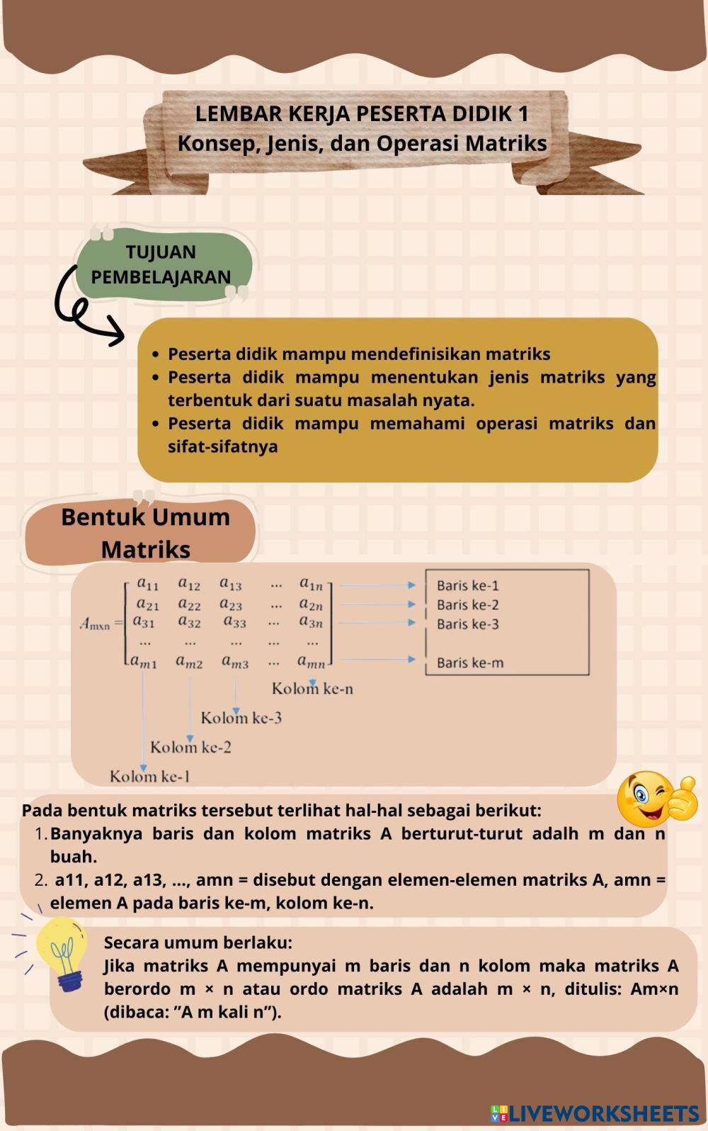 Created byIndah Permata Sari Matematika SMA Kelas 11 Refleksi Operasi Matriks Age 16-17 level: 11 Indonesian Author's Instructions My Google Classroom Courses × 0 classes selected (0 students total) Quick Access Select all classes (0 classes) All Classes Loading courses... Cancel Share Share to selected Course __COURSE_NAME__ __STUDENT_NAME__ (__STUDENT_EMAIL__) E-LKPD MATRIKS PB 1 Download Worksheet Validation Check my answers Emails my answers to my teacher Full name Group/level School subject Teacher's email or key code Close Submit Validating worksheet... (12) Your answers have been sent to your teacher. Good luck! OK We encountered an error submitting your answers. Please try again. OK Advertisement | Go Ad Free Created byIndah Permata Sari Matematika SMA Kelas 11 Refleksi Operasi Matriks Age 16-17 level: 11 Indonesian Author's Instructions