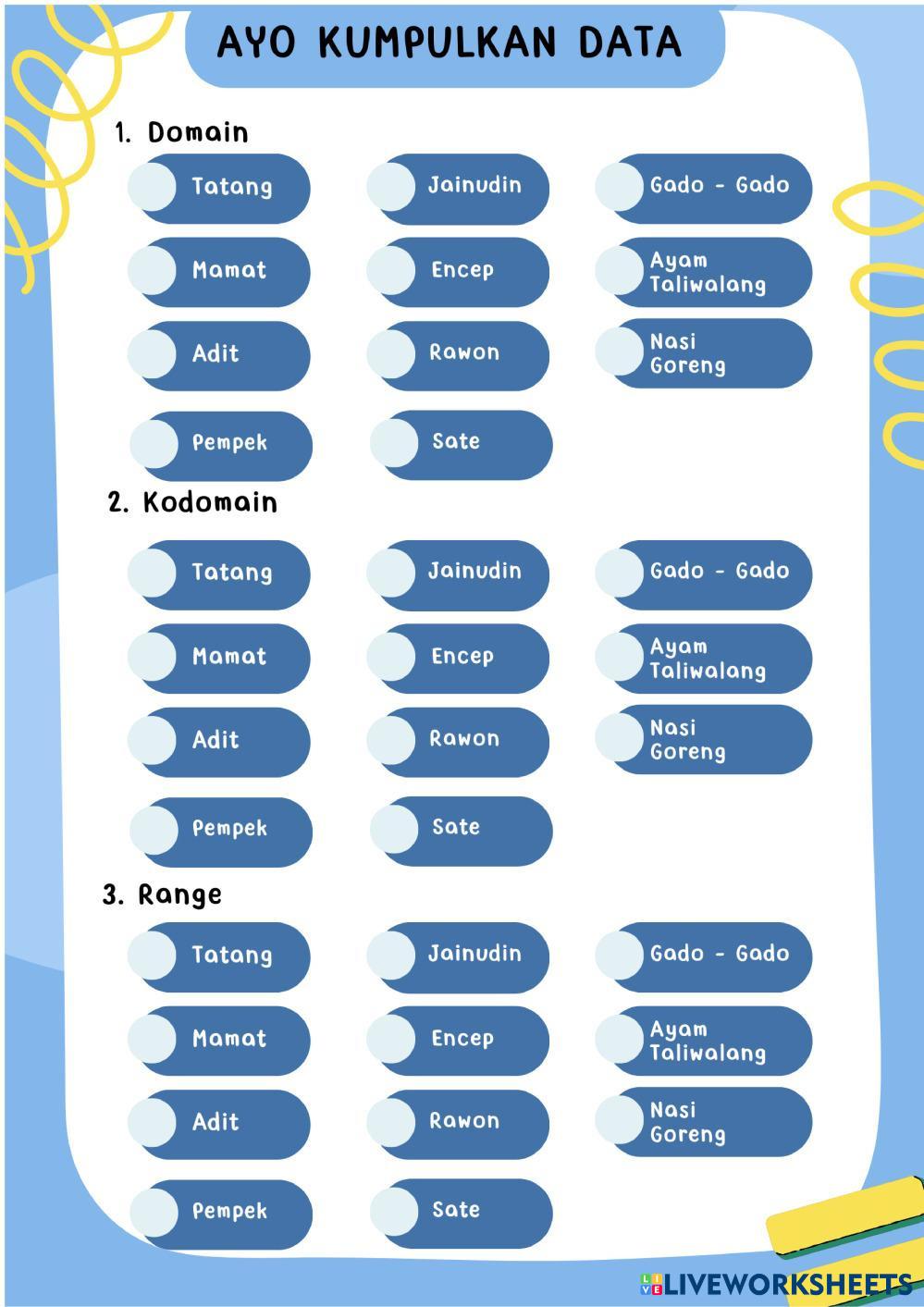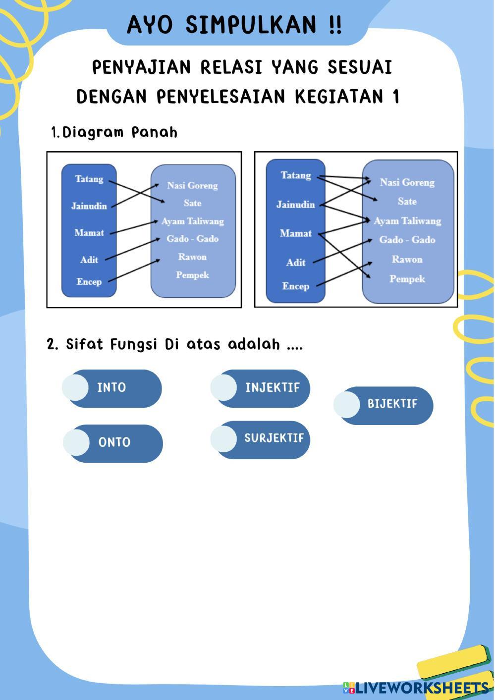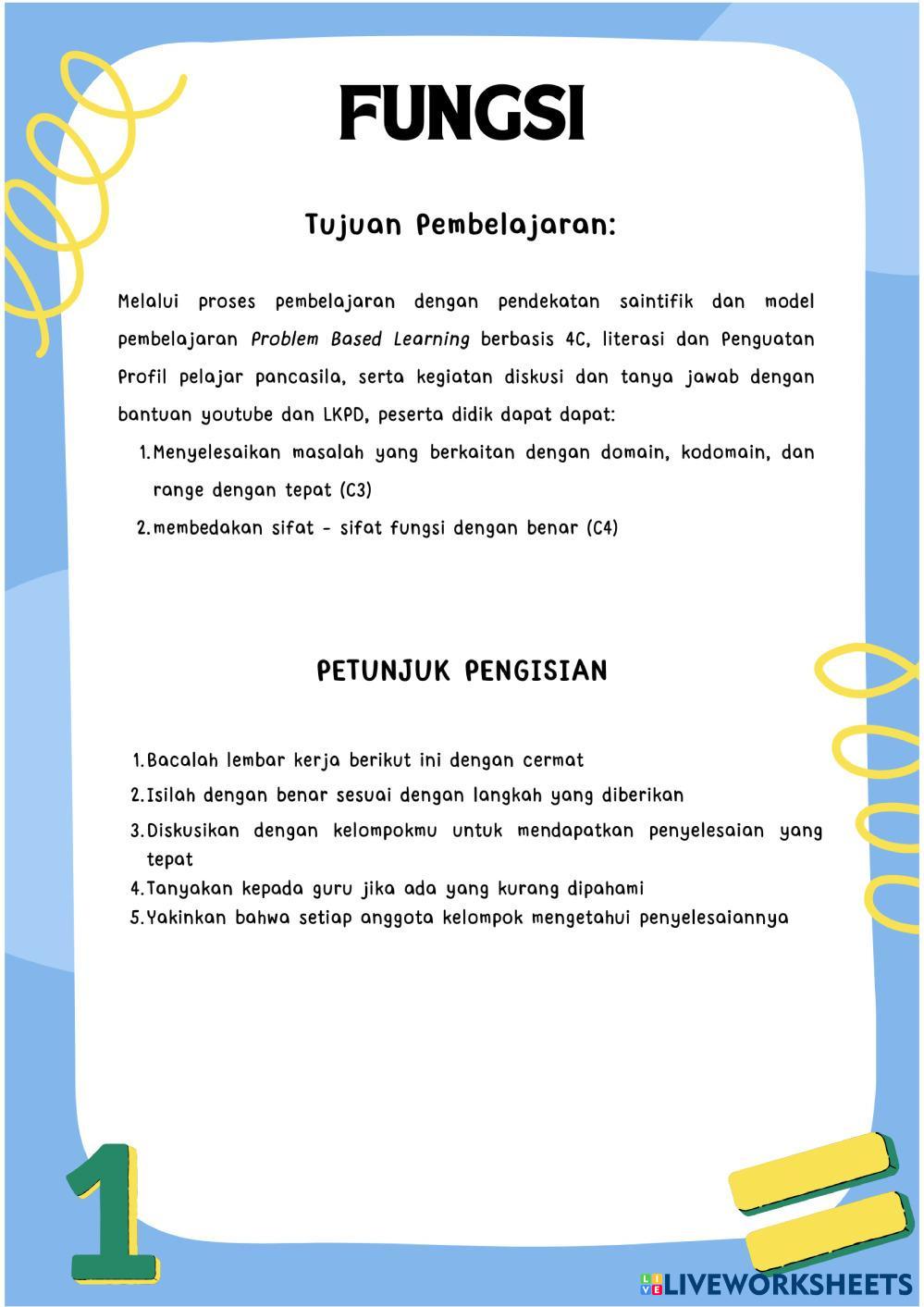 Created byRahesa Andini Matematika SMA Kelas 11 Komposisi Fungsi Age 16+ level: 11 Indonesian Author's Instructions My Google Classroom Courses × 0 classes selected (0 students total) Quick Access Select all classes (0 classes) All Classes Loading courses... Cancel Share Share to selected Course __COURSE_NAME__ __STUDENT_NAME__ (__STUDENT_EMAIL__) LKPD MATERI FUNGSI KELAS XI Download Worksheet Validation Check my answers Emails my answers to my teacher Full name Group/level School subject Teacher's email or key code Close Submit Validating worksheet... (12) Your answers have been sent to your teacher. Good luck! OK We encountered an error submitting your answers. Please try again. OK Advertisement | Go Ad Free Created byRahesa Andini Matematika SMA Kelas 11 Komposisi Fungsi Age 16+ level: 11 Indonesian Author's Instructions