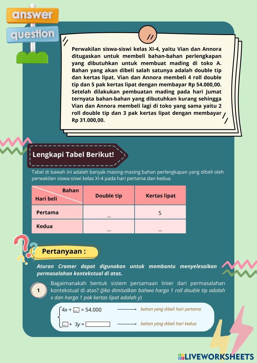 Created byGaluh Ayu Pramiandar Matematika SMA Kelas 11 MATRIKS Age 15+ level: SMA Indonesian Author's Instructions My Google Classroom Courses × 0 classes selected (0 students total) Quick Access Select all classes (0 classes) All Classes Loading courses... Cancel Share Share to selected Course __COURSE_NAME__ __STUDENT_NAME__ (__STUDENT_EMAIL__) LKPD A Download Worksheet Validation Check my answers Emails my answers to my teacher Full name Group/level School subject Teacher's email or key code Close Submit Validating worksheet... (12) Your answers have been sent to your teacher. Good luck! OK We encountered an error submitting your answers. Please try again. OK Advertisement | Go Ad Free Created byGaluh Ayu Pramiandar Matematika SMA Kelas 11 MATRIKS Age 15+ level: SMA Indonesian Author's Instructions