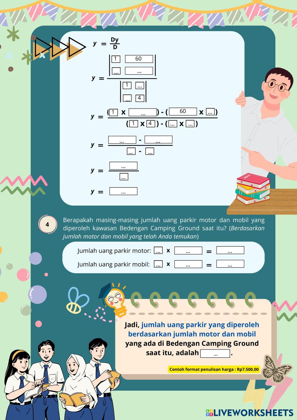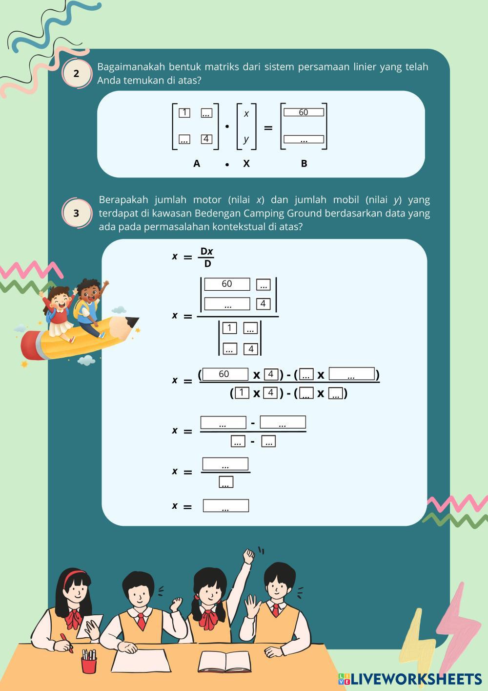 Created byGaluh Ayu Pramiandar Matematika SMA Kelas 11 MATRIKS Age 15+ level: SMA Indonesian Author's Instructions My Google Classroom Courses × 0 classes selected (0 students total) Quick Access Select all classes (0 classes) All Classes Loading courses... Cancel Share Share to selected Course __COURSE_NAME__ __STUDENT_NAME__ (__STUDENT_EMAIL__) LKPD B Download Worksheet Validation Check my answers Emails my answers to my teacher Full name Group/level School subject Teacher's email or key code Close Submit Validating worksheet... (12) Your answers have been sent to your teacher. Good luck! OK We encountered an error submitting your answers. Please try again. OK Advertisement | Go Ad Free Created byGaluh Ayu Pramiandar Matematika SMA Kelas 11 MATRIKS Age 15+ level: SMA Indonesian Author's Instructions