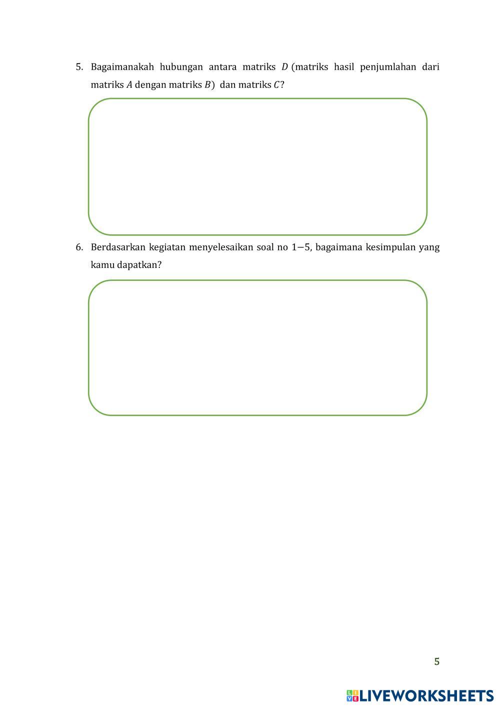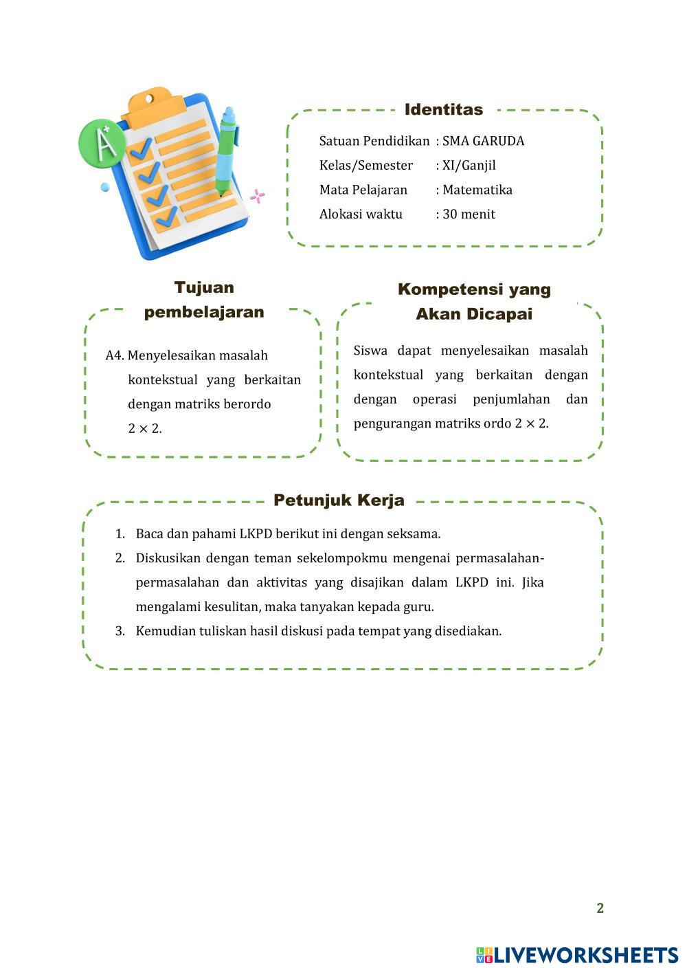 Created byLatifatunnisa Matematika SMA kelas XI operasi matriks Age 16+ level: 11 Indonesian Author's Instructions My Google Classroom Courses × 0 classes selected (0 students total) Quick Access Select all classes (0 classes) All Classes Loading courses... Cancel Share Share to selected Course __COURSE_NAME__ __STUDENT_NAME__ (__STUDENT_EMAIL__) LKPD penerapan operasi penjumlahan dan pengurangan matriks dalam masalah kontekstual Download Worksheet Validation Check my answers Emails my answers to my teacher Full name Group/level School subject Teacher's email or key code Close Submit Validating worksheet... (12) Your answers have been sent to your teacher. Good luck! OK We encountered an error submitting your answers. Please try again. OK Advertisement | Go Ad Free Created byLatifatunnisa Matematika SMA kelas XI operasi matriks Age 16+ level: 11 Indonesian Author's Instructions