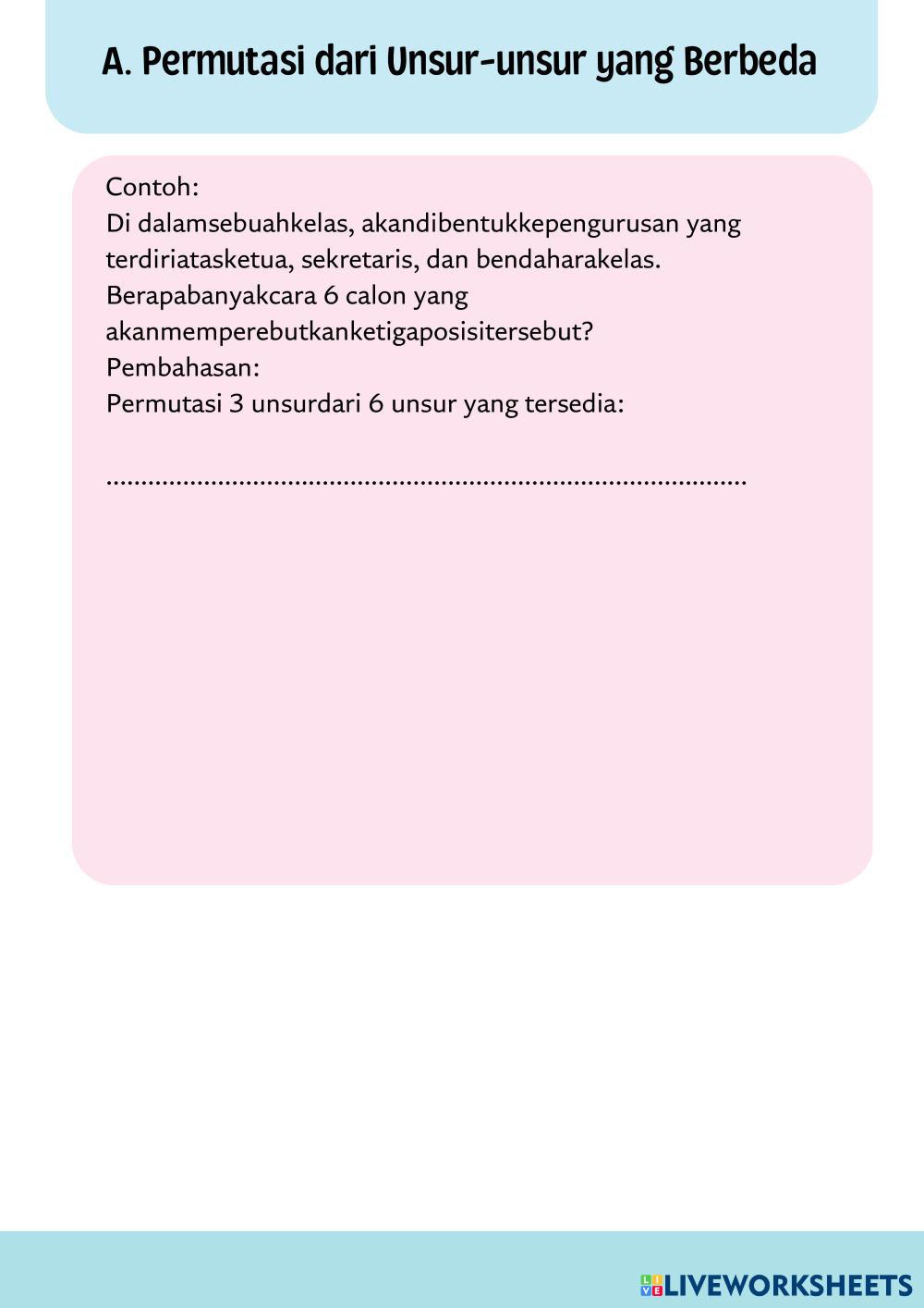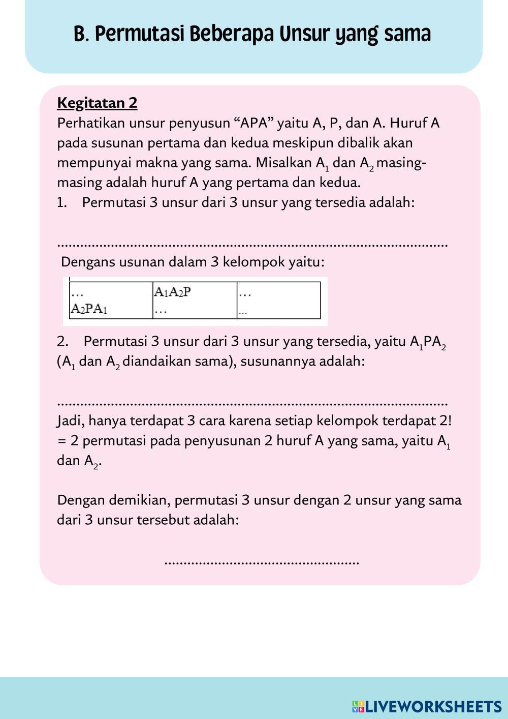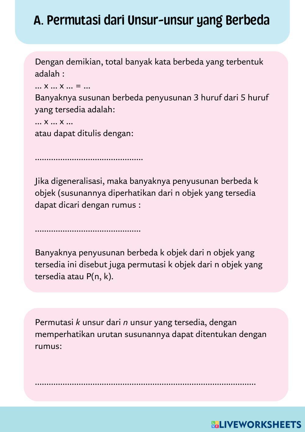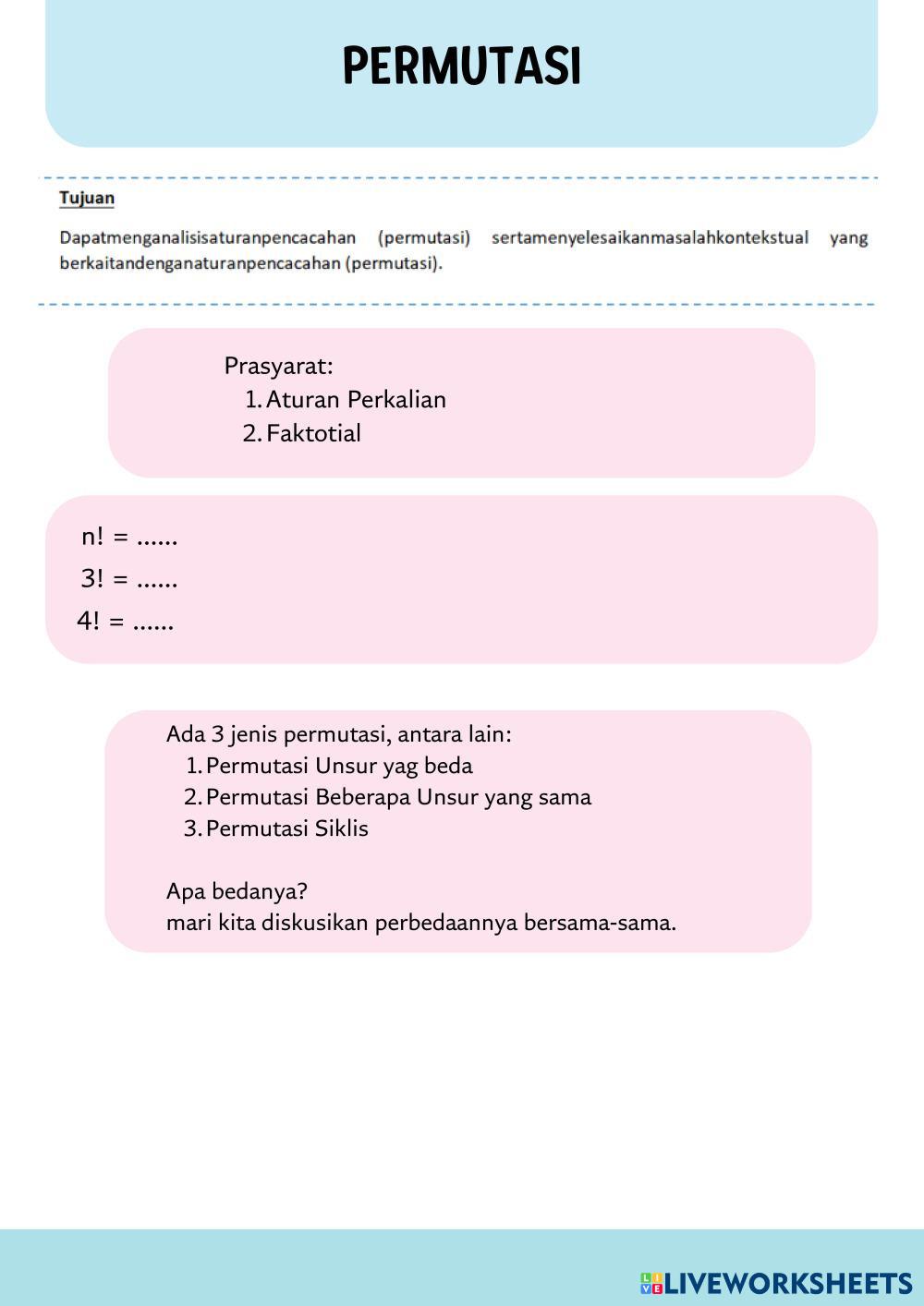 Created byrifandiya MATEMATIKA SMA KELAS XII Macam-macam Permutasi Age 15+ level: LOW, MEDIUM Indonesian Author's Instructions My Google Classroom Courses × 0 classes selected (0 students total) Quick Access Select all classes (0 classes) All Classes Loading courses... Cancel Share Share to selected Course __COURSE_NAME__ __STUDENT_NAME__ (__STUDENT_EMAIL__) PERMUTASI Download Worksheet Validation Check my answers Emails my answers to my teacher Full name Group/level School subject Teacher's email or key code Close Submit Validating worksheet... (12) Your answers have been sent to your teacher. Good luck! OK We encountered an error submitting your answers. Please try again. OK Advertisement | Go Ad Free Created byrifandiya MATEMATIKA SMA KELAS XII Macam-macam Permutasi Age 15+ level: LOW, MEDIUM Indonesian Author's Instructions