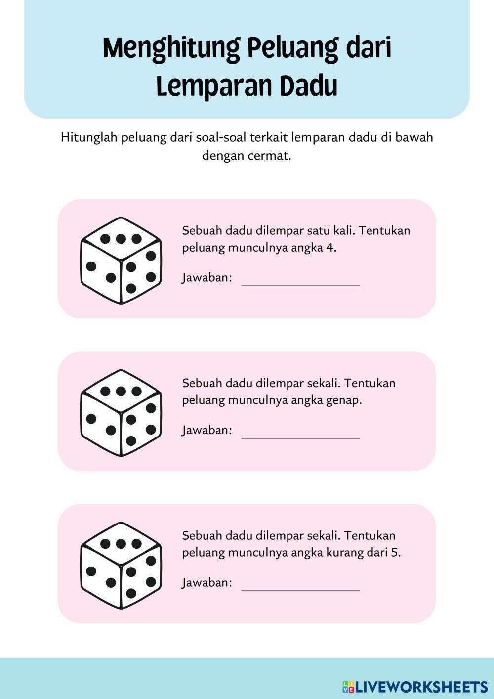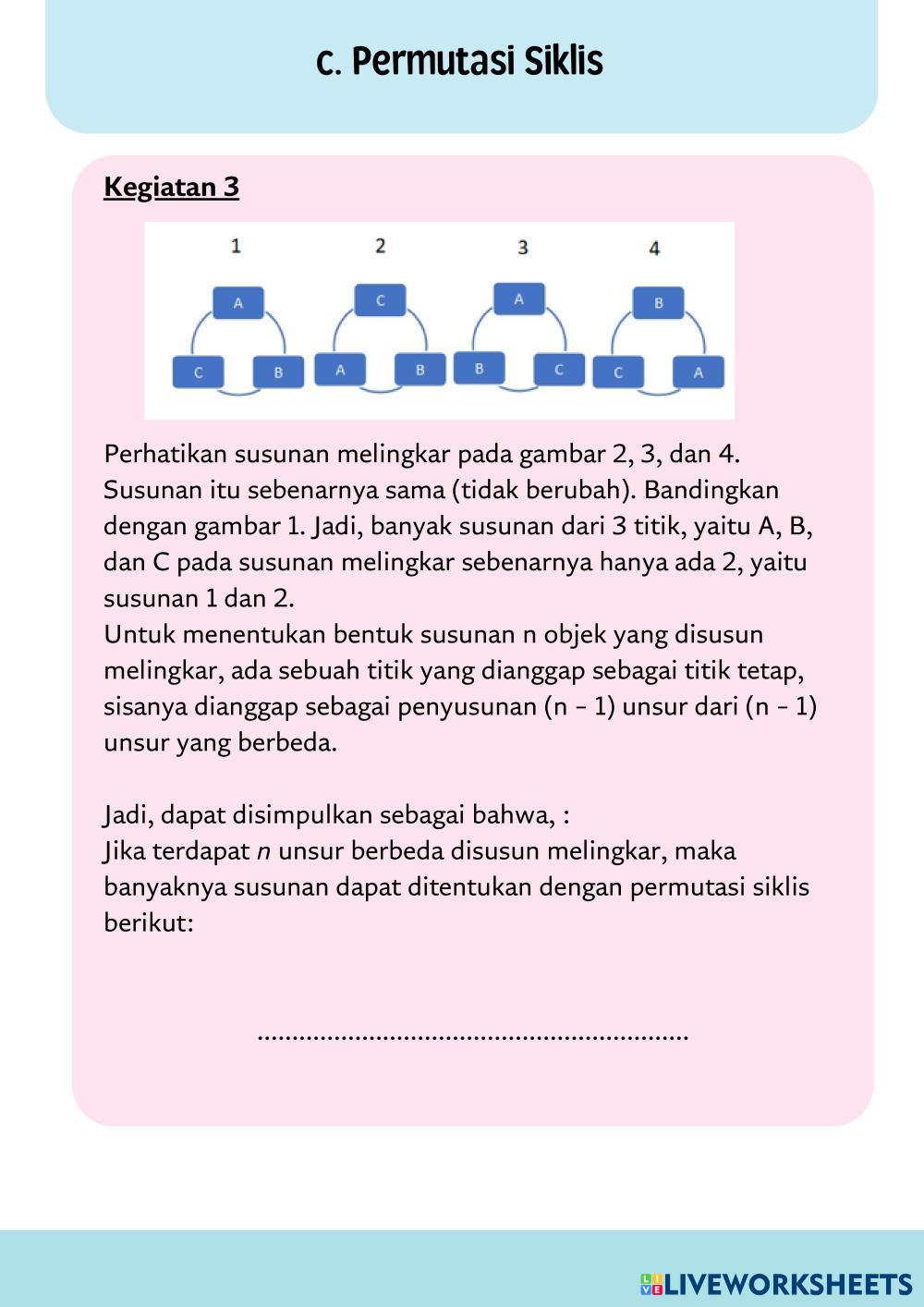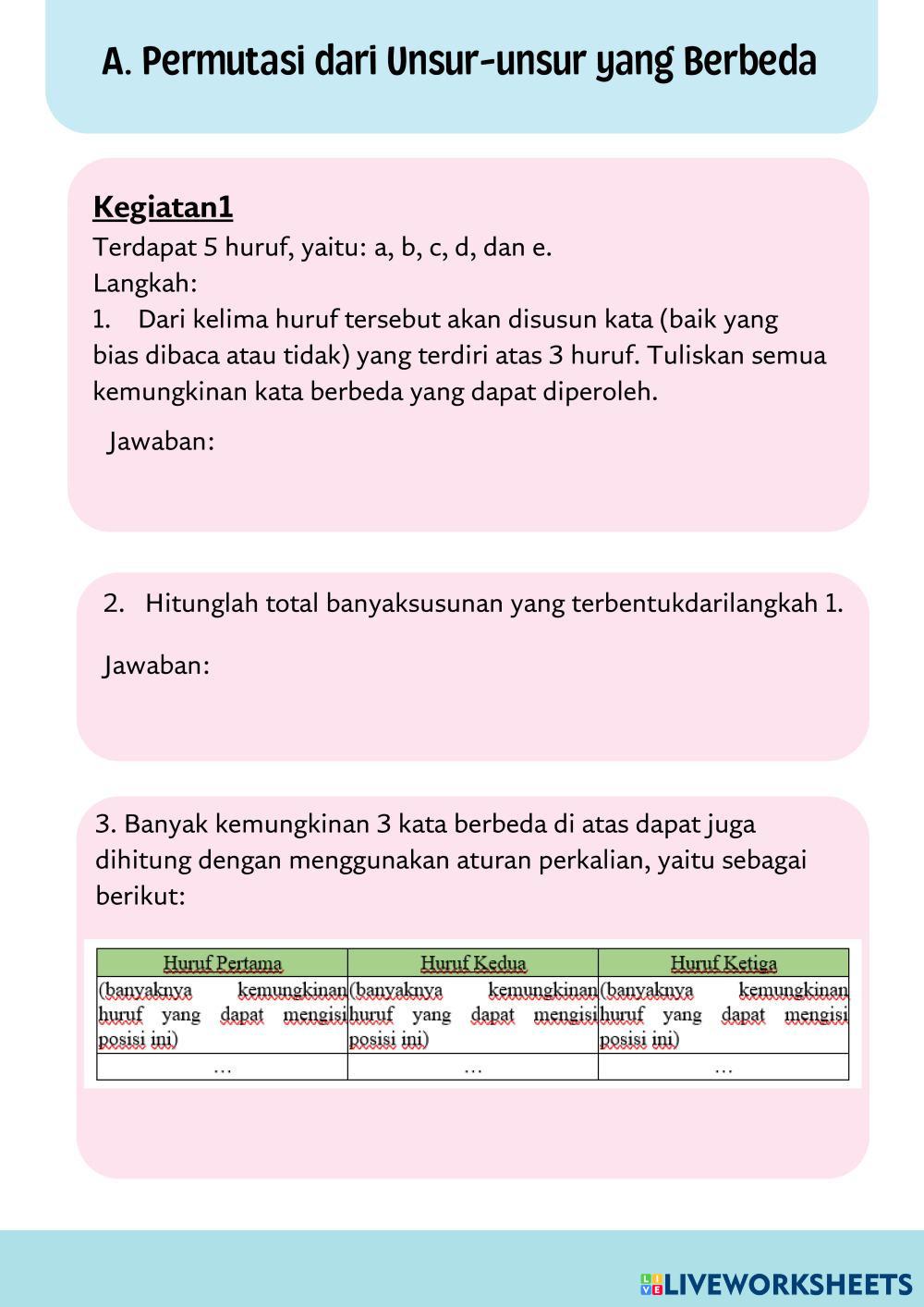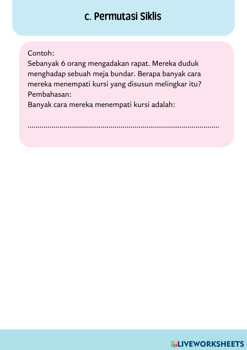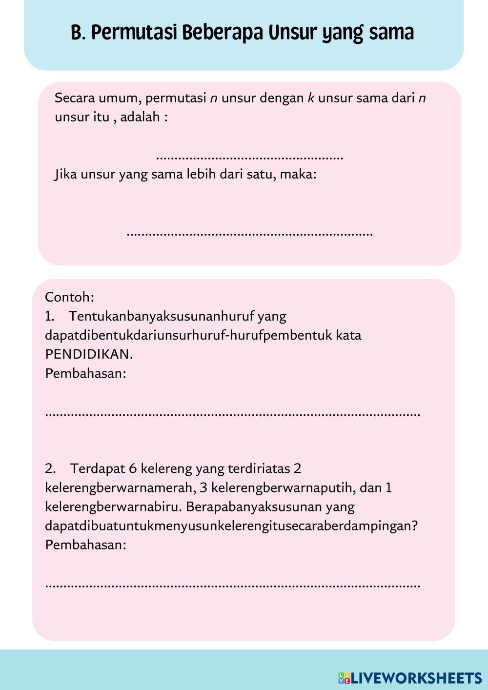 Created byrifandiya MATEMATIKA SMA KELAS XII Macam-macam Permutasi Age 15+ level: LOW, MEDIUM Indonesian Author's Instructions My Google Classroom Courses × 0 classes selected (0 students total) Quick Access Select all classes (0 classes) All Classes Loading courses... Cancel Share Share to selected Course __COURSE_NAME__ __STUDENT_NAME__ (__STUDENT_EMAIL__) PERMUTASI Download Worksheet Validation Check my answers Emails my answers to my teacher Full name Group/level School subject Teacher's email or key code Close Submit Validating worksheet... (12) Your answers have been sent to your teacher. Good luck! OK We encountered an error submitting your answers. Please try again. OK Advertisement | Go Ad Free Created byrifandiya MATEMATIKA SMA KELAS XII Macam-macam Permutasi Age 15+ level: LOW, MEDIUM Indonesian Author's Instructions