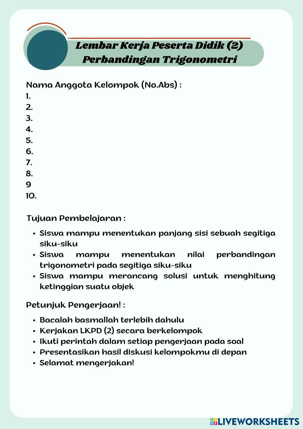 Created byJaseri Matematika SMK Perbandingan Trigonometri Age 14+ level: 10 Indonesian Author's Instructions My Google Classroom Courses × 0 classes selected (0 students total) Quick Access Select all classes (0 classes) All Classes Loading courses... Cancel Share Share to selected Course __COURSE_NAME__ __STUDENT_NAME__ (__STUDENT_EMAIL__) Lembar Kerja Peserta Didik 2 Download Worksheet Validation Check my answers Emails my answers to my teacher Full name Group/level School subject Teacher's email or key code Close Submit Validating worksheet... (12) Your answers have been sent to your teacher. Good luck! OK We encountered an error submitting your answers. Please try again. OK Advertisement | Go Ad Free Created byJaseri Matematika SMK Perbandingan Trigonometri Age 14+ level: 10 Indonesian Author's Instructions