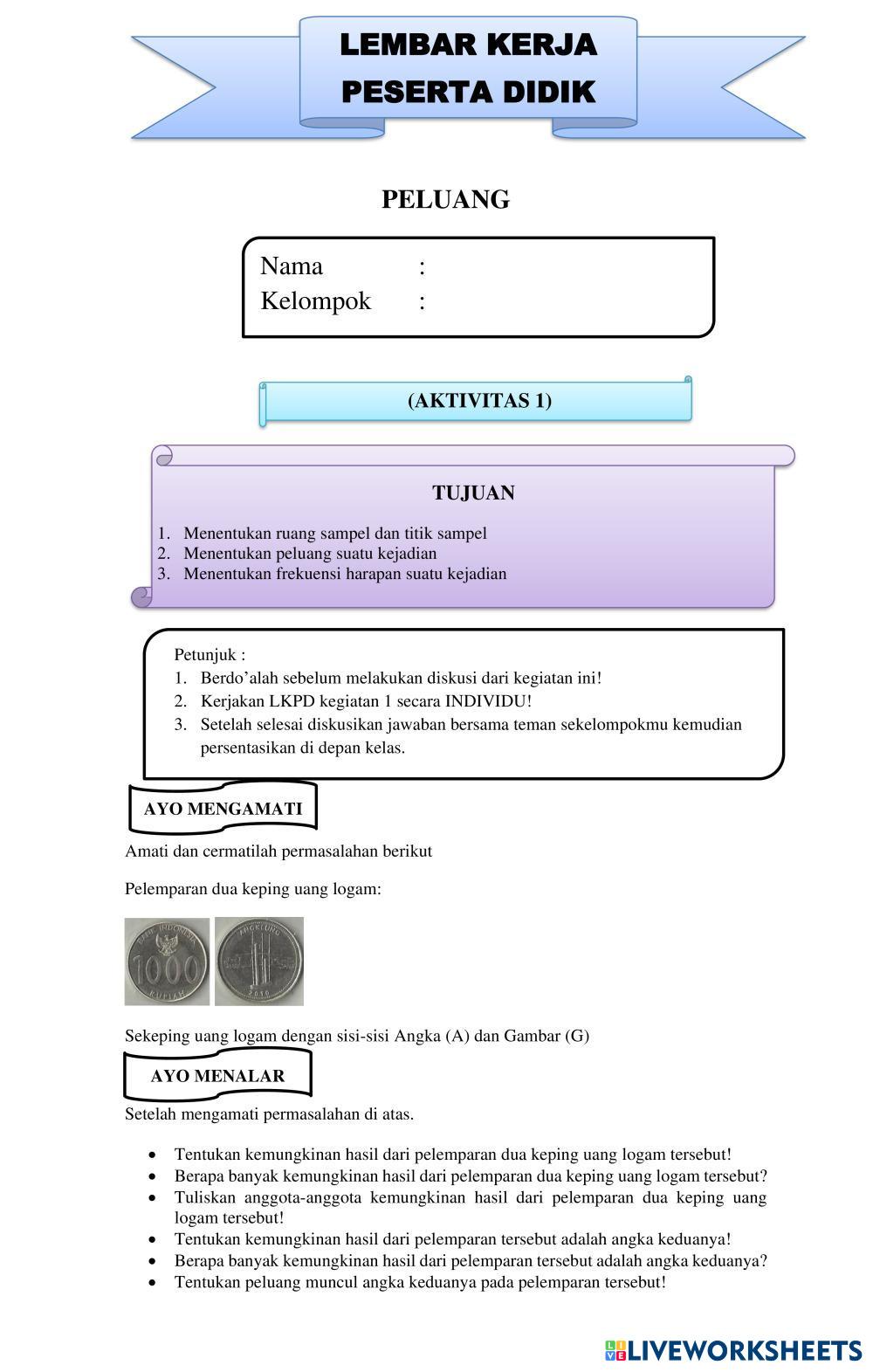 Created byHayatun Nufus Matematika SMK peluang Age 17+ level: XII Indonesian Author's Instructions My Google Classroom Courses × 0 classes selected (0 students total) Quick Access Select all classes (0 classes) All Classes Loading courses... Cancel Share Share to selected Course __COURSE_NAME__ __STUDENT_NAME__ (__STUDENT_EMAIL__) LKPD Ruang Sampel dan Kejadian Download Worksheet Validation Check my answers Emails my answers to my teacher Full name Group/level School subject Teacher's email or key code Close Submit Validating worksheet... (12) Your answers have been sent to your teacher. Good luck! OK We encountered an error submitting your answers. Please try again. OK Advertisement | Go Ad Free Created byHayatun Nufus Matematika SMK peluang Age 17+ level: XII Indonesian Author's Instructions