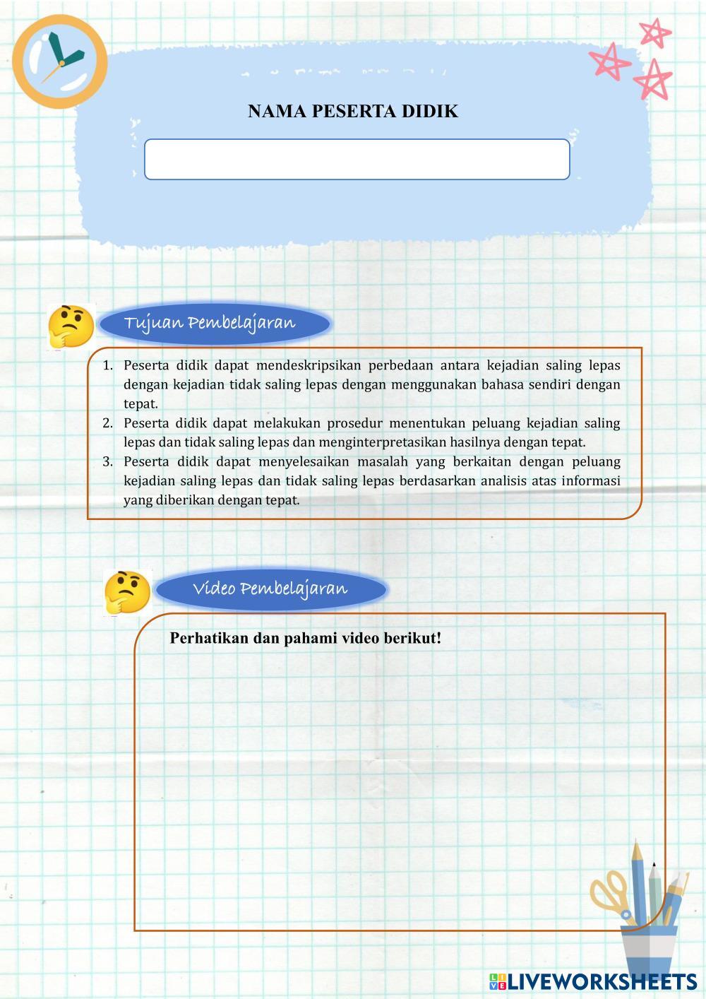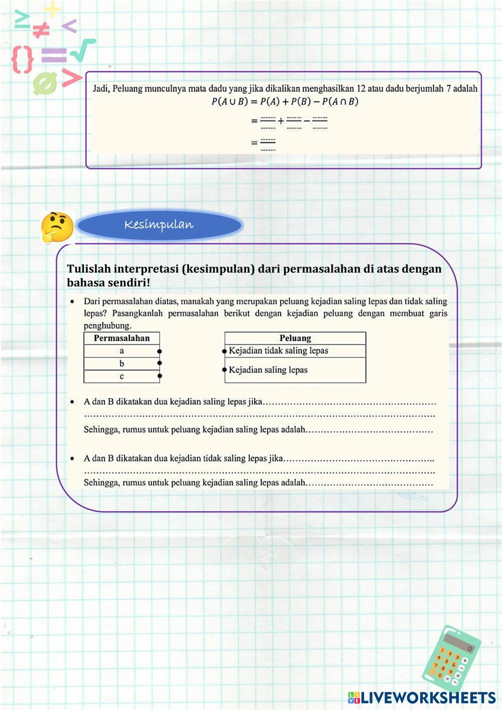 Created by Novika67 Matematika SMK peluang Age 16+ level: XI Indonesian Author's Instructions My Google Classroom Courses × 0 classes selected (0 students total) Quick Access Select all classes (0 classes) All Classes Loading courses... Cancel Share Share to selected Course __COURSE_NAME__ __STUDENT_NAME__ (__STUDENT_EMAIL__) LKPD Kejadian Saling Lepas dan Tidak Saling Lepas Download Worksheet Validation Check my answers Emails my answers to my teacher Full name Group/level School subject Teacher's email or key code Close Submit Validating worksheet... (12) Your answers have been sent to your teacher. Good luck! OK We encountered an error submitting your answers. Please try again. OK Advertisement | Go Ad Free Created by Novika67 Matematika SMK peluang Age 16+ level: XI Indonesian Author's Instructions