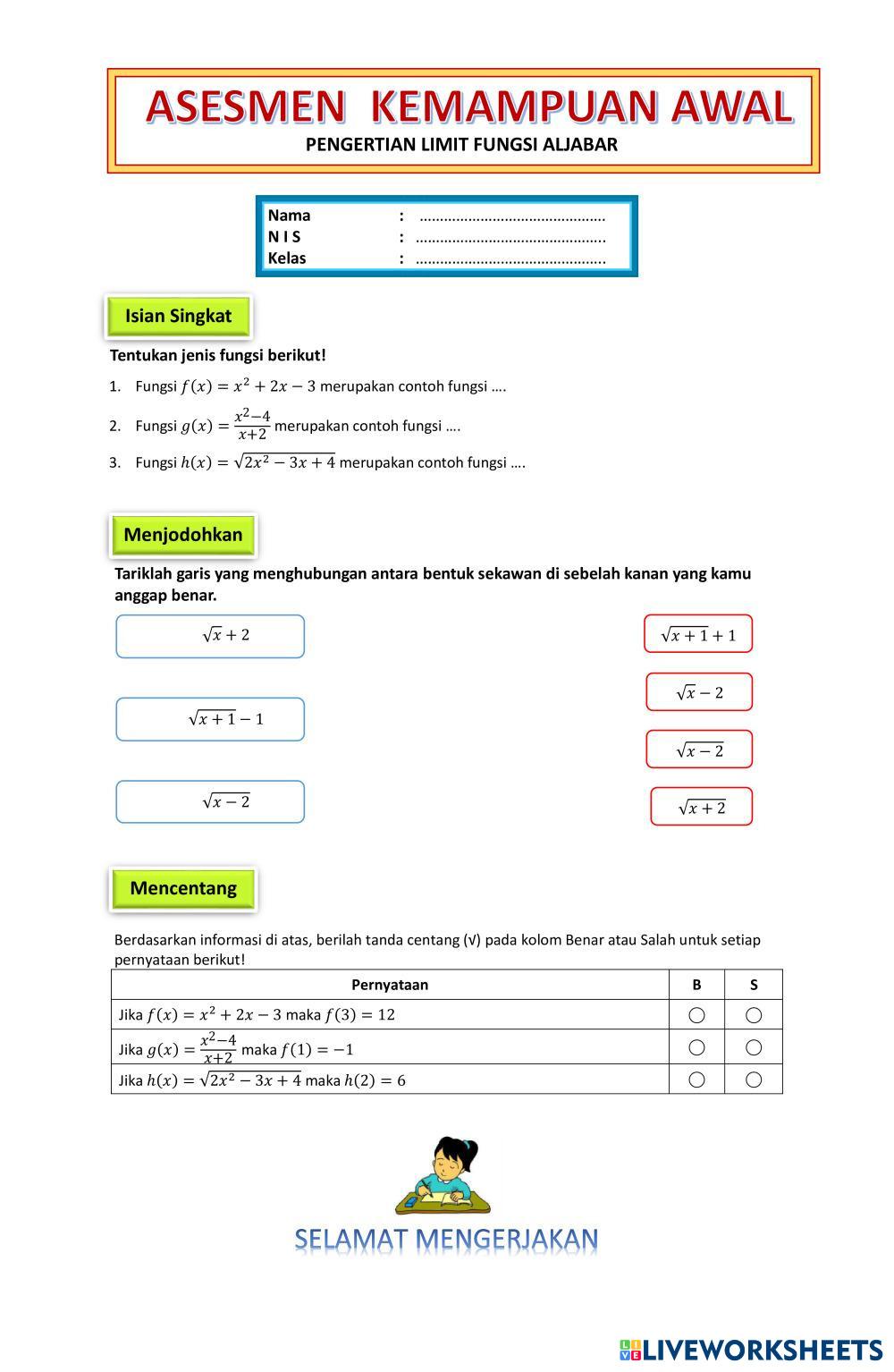 Created byHARDIYANTO Matematika Tingkat Lanjut SMA kelas XII LIMIT FUNGSI Age 15+ level: 12 Indonesian Author's Instructions My Google Classroom Courses × 0 classes selected (0 students total) Quick Access Select all classes (0 classes) All Classes Loading courses... Cancel Share Share to selected Course __COURSE_NAME__ __STUDENT_NAME__ (__STUDENT_EMAIL__) Asesmen Kemampuan Awal Limit Fungsi Download Worksheet Validation Check my answers Emails my answers to my teacher Full name Group/level School subject Teacher's email or key code Close Submit Validating worksheet... (12) Your answers have been sent to your teacher. Good luck! OK We encountered an error submitting your answers. Please try again. OK Advertisement | Go Ad Free Created byHARDIYANTO Matematika Tingkat Lanjut SMA kelas XII LIMIT FUNGSI Age 15+ level: 12 Indonesian Author's Instructions
