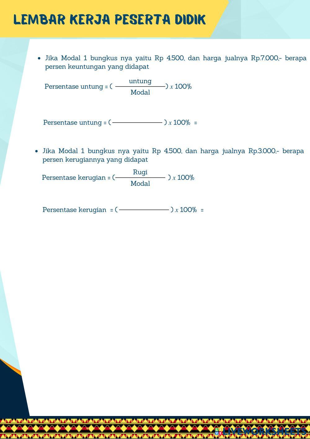 Created byMuhamad Ghufron Matematika Untung Rugi Untung Rugi Age 13-17 level: 7 Indonesian Author's Instructions My Google Classroom Courses × 0 classes selected (0 students total) Quick Access Select all classes (0 classes) All Classes Loading courses... Cancel Share Share to selected Course __COURSE_NAME__ __STUDENT_NAME__ (__STUDENT_EMAIL__) Matematika Download Worksheet Validation Check my answers Emails my answers to my teacher Full name Group/level School subject Teacher's email or key code Close Submit Validating worksheet... (12) Your answers have been sent to your teacher. Good luck! OK We encountered an error submitting your answers. Please try again. OK Advertisement | Go Ad Free Created byMuhamad Ghufron Matematika Untung Rugi Untung Rugi Age 13-17 level: 7 Indonesian Author's Instructions