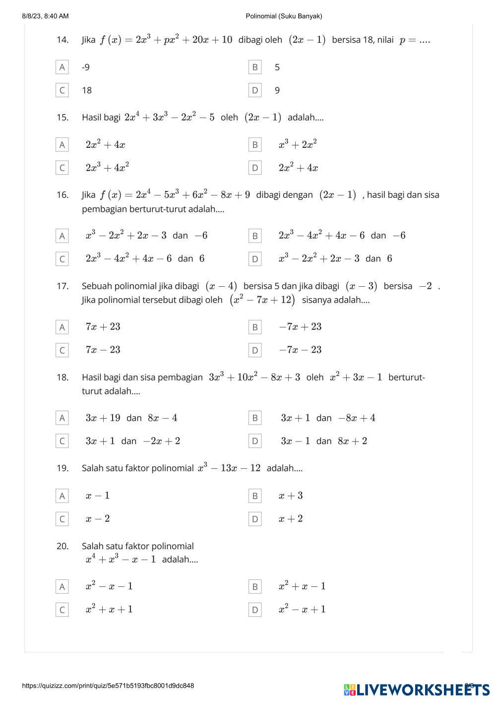 Created byAnny Cahyani Matematika Polinomial Age 16-13 level: 11 Indonesian Author's Instructions My Google Classroom Courses × 0 classes selected (0 students total) Quick Access Select all classes (0 classes) All Classes Loading courses... Cancel Share Share to selected Course __COURSE_NAME__ __STUDENT_NAME__ (__STUDENT_EMAIL__) Polinomial Download Worksheet Validation Check my answers Emails my answers to my teacher Full name Group/level School subject Teacher's email or key code Close Submit Validating worksheet... (12) Your answers have been sent to your teacher. Good luck! OK We encountered an error submitting your answers. Please try again. OK Advertisement | Go Ad Free Created byAnny Cahyani Matematika Polinomial Age 16-13 level: 11 Indonesian Author's Instructions