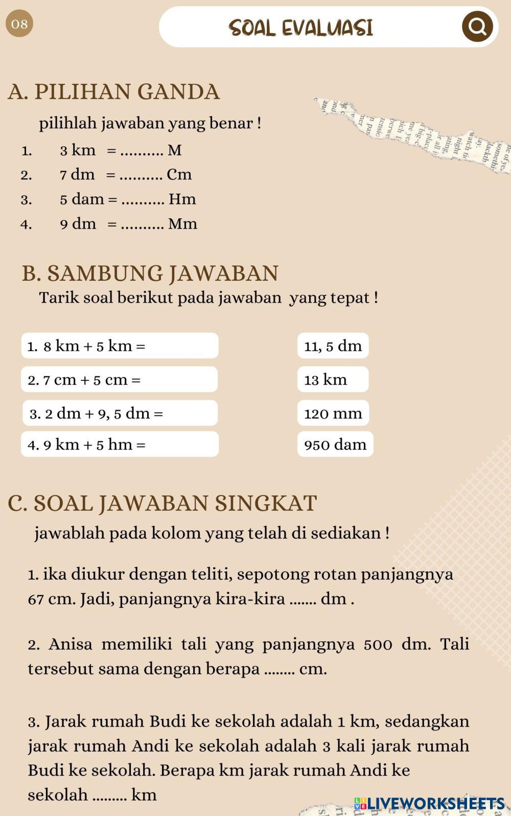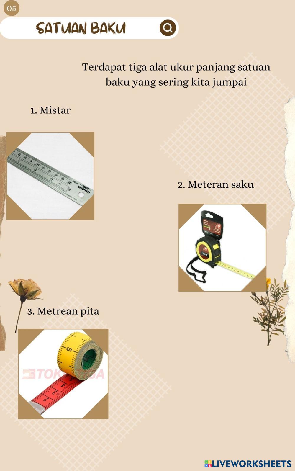 Created byFairuz Alwan R Matematika Pengukuran panjang Age 11-15 level: 3 sd Indonesian Author's Instructions My Google Classroom Courses × 0 classes selected (0 students total) Quick Access Select all classes (0 classes) All Classes Loading courses... Cancel Share Share to selected Course __COURSE_NAME__ __STUDENT_NAME__ (__STUDENT_EMAIL__) Pengukuran Panjang Download Worksheet Validation Check my answers Emails my answers to my teacher Full name Group/level School subject Teacher's email or key code Close Submit Validating worksheet... (12) Your answers have been sent to your teacher. Good luck! OK We encountered an error submitting your answers. Please try again. OK Advertisement | Go Ad Free Created byFairuz Alwan R Matematika Pengukuran panjang Age 11-15 level: 3 sd Indonesian Author's Instructions
